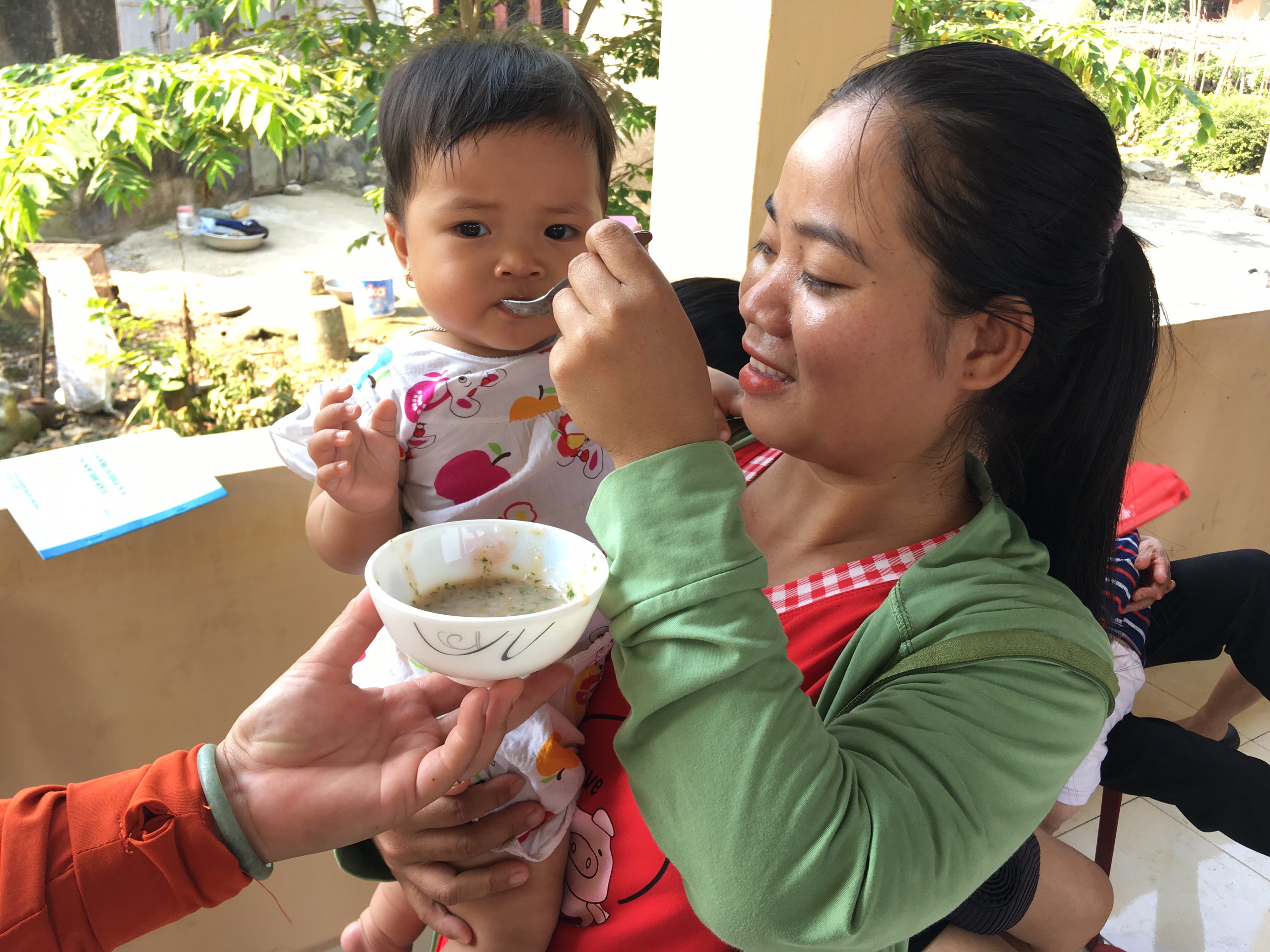 Cán bộ khoa Dinh dưỡng hướng dẫn cho bà mẹ thực hành ăn bổ sung hợp lý