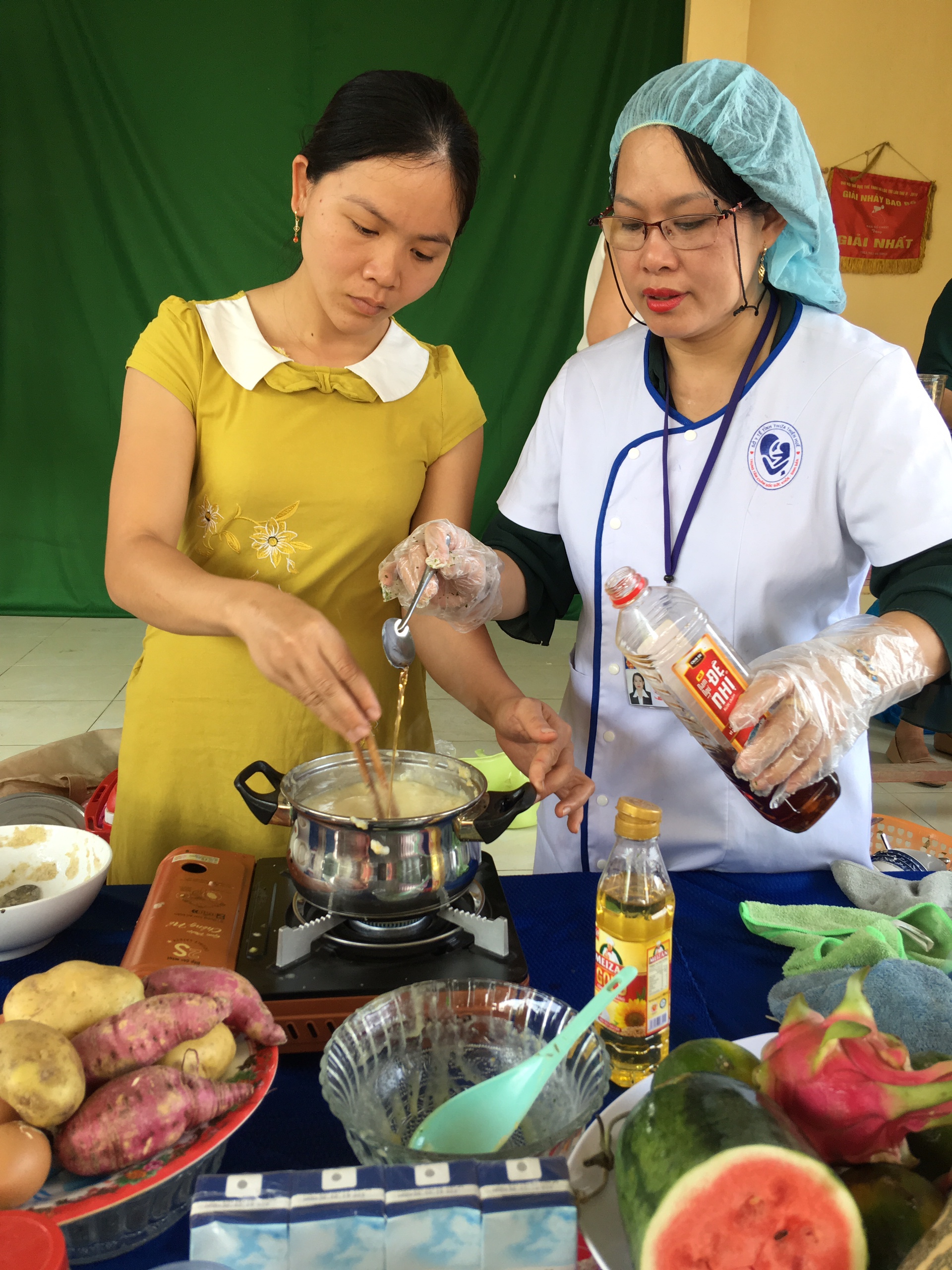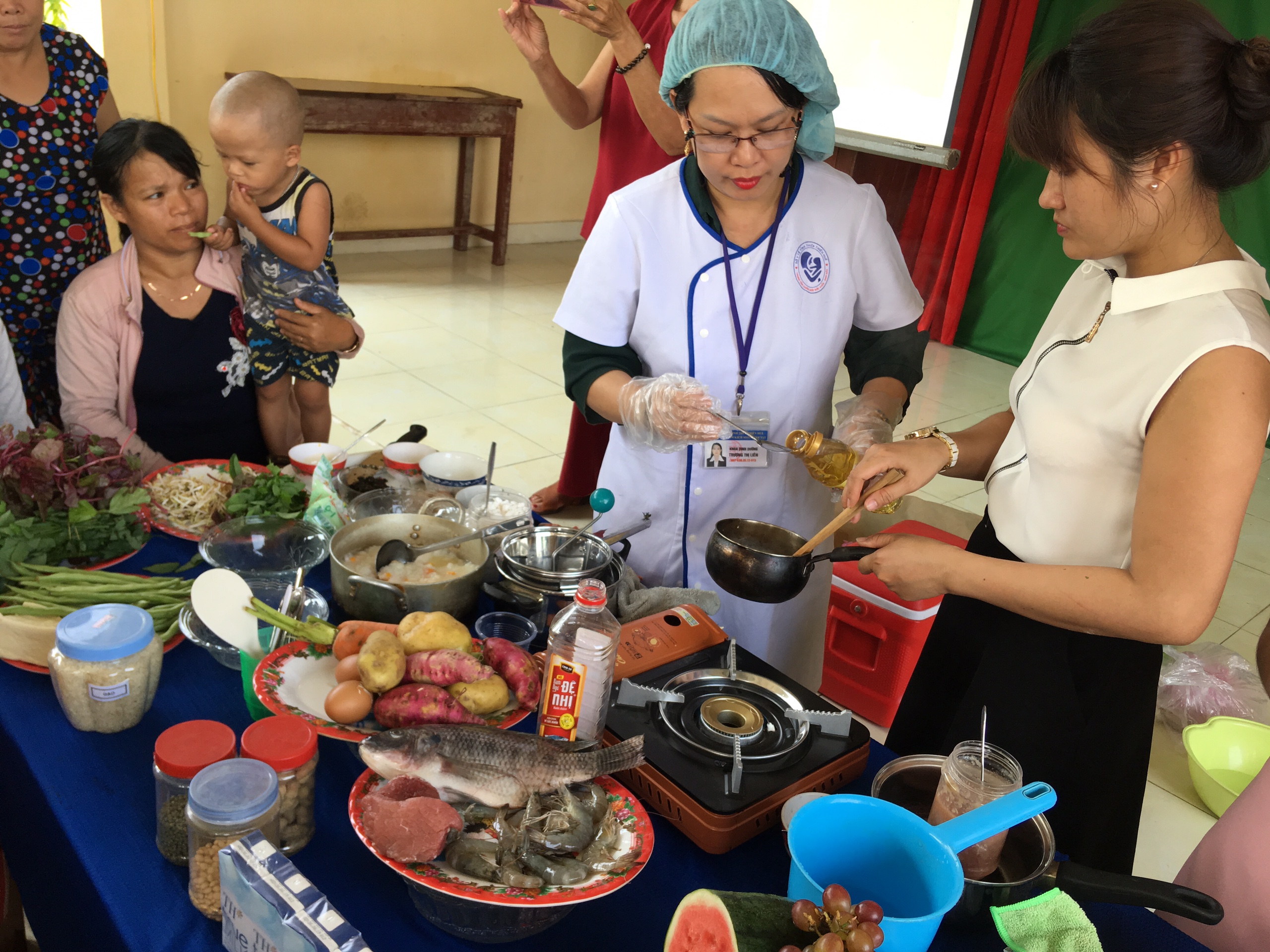 Cán bộ khoa Dinh dưỡng giới thiệu và hướng dẫn thực hành cho các bà mẹ