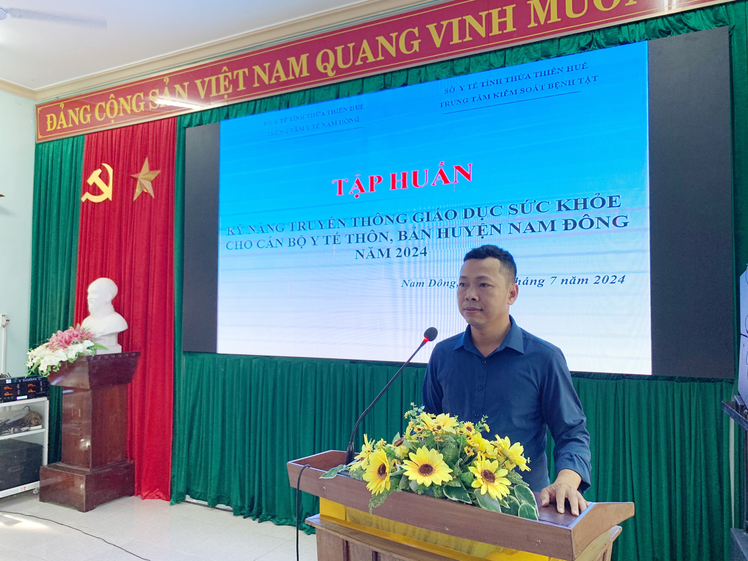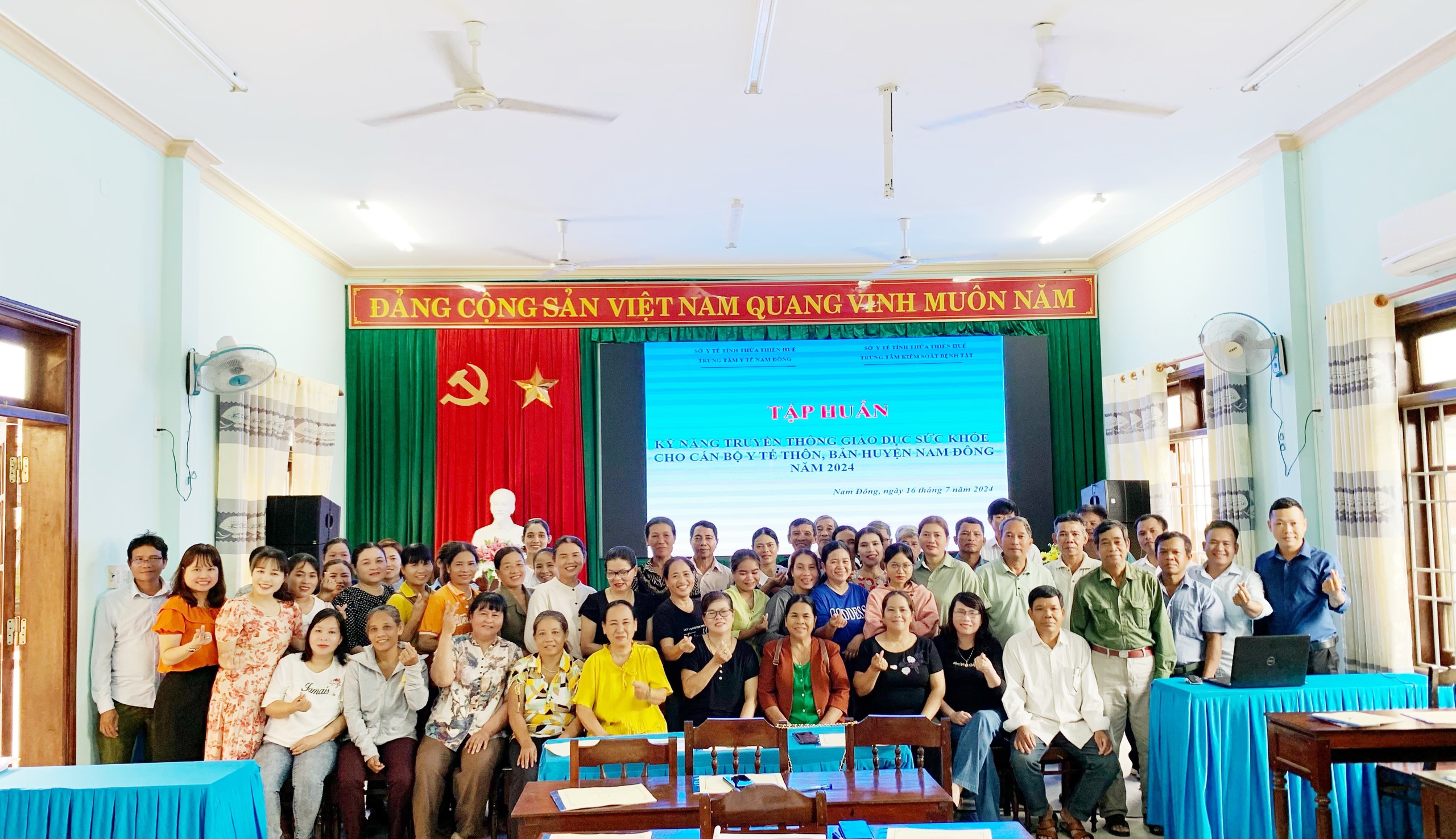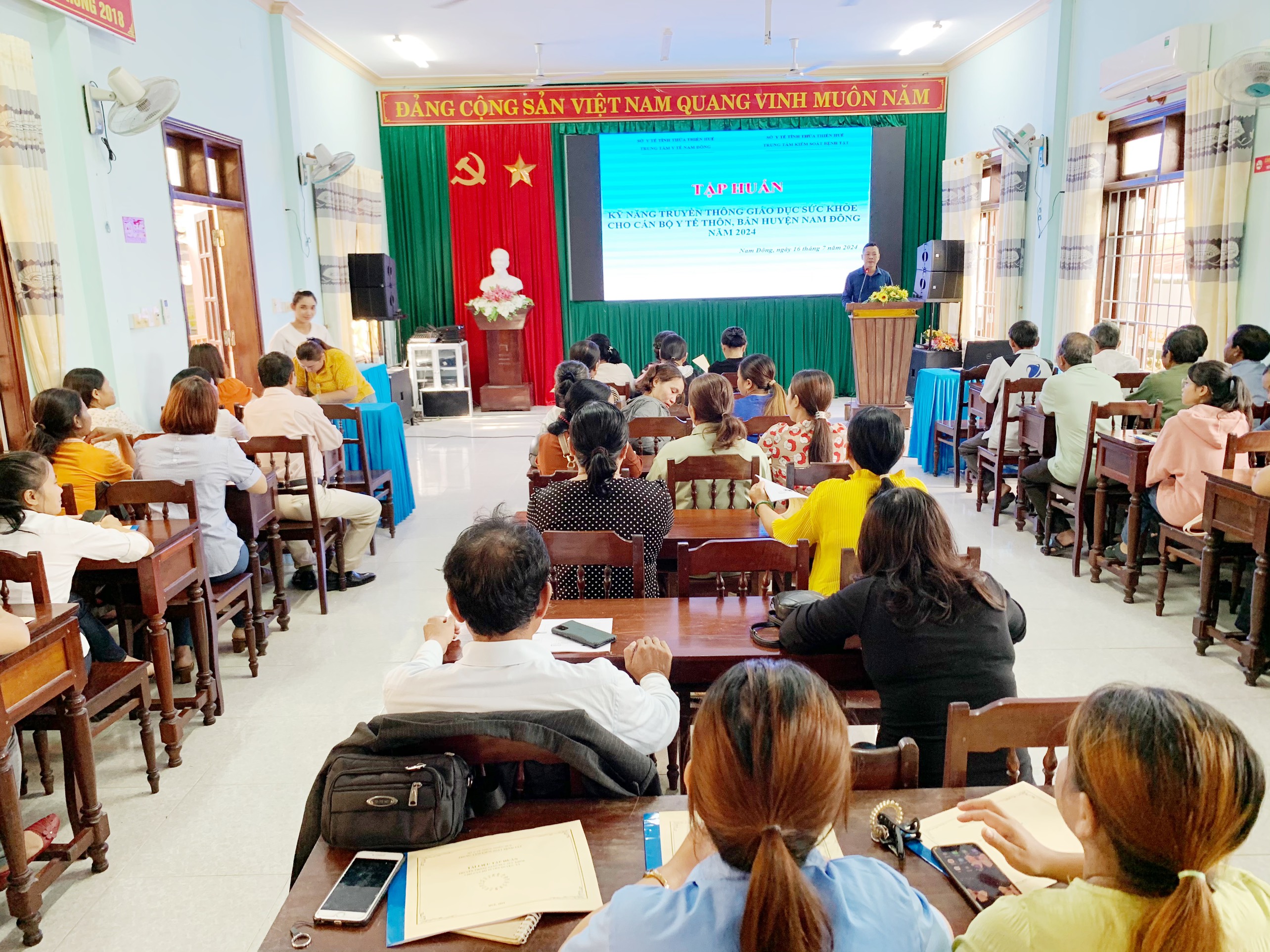 Ngày 16/7/2024, Trung tâm Kiểm soát bệnh tật tỉnh phối hợp với Trung tâm Y tế huyện Nam Đông tổ chức lớp tập huấn kỹ năng truyền thông giáo dục sức khoẻ cho cán bộ y tế thôn, bản. Đến tham dự lớp tập huấn, có ThS. Nguyễn Văn Cương - Trưởng khoa Truyền thông giáo dục sức khỏe và đặc biệt có sự tham gia của 58 học viên là cán bộ y tế thôn, bản của 10 xã, thị trấn thuộc huyện Nam Đông.