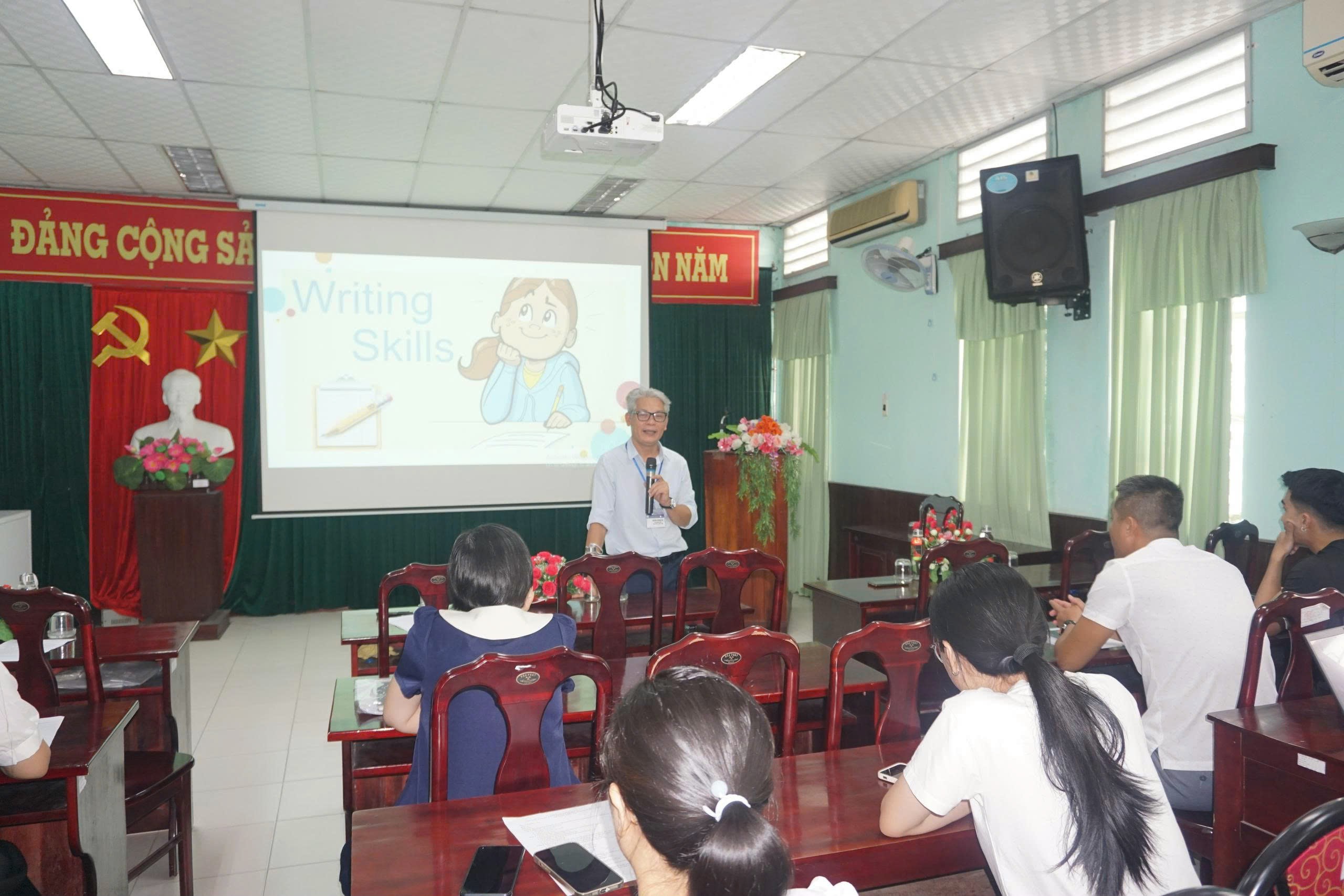 Báo cáo viên khoa TTGDSK thuộc Trung tâm KSBT trình bày kỹ năng viết tin bài tại lớp tập huấn.