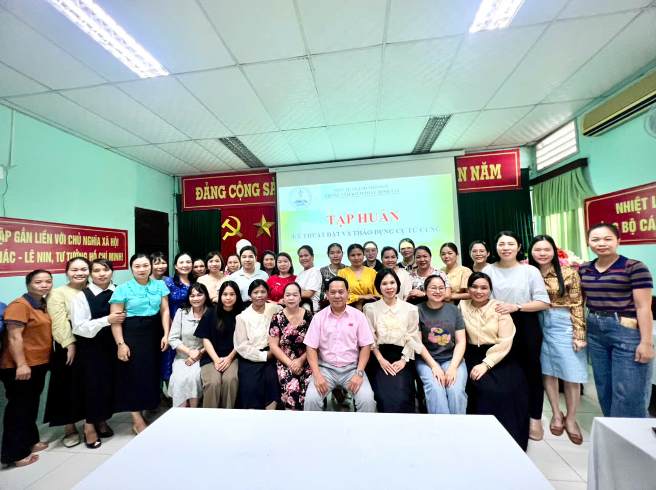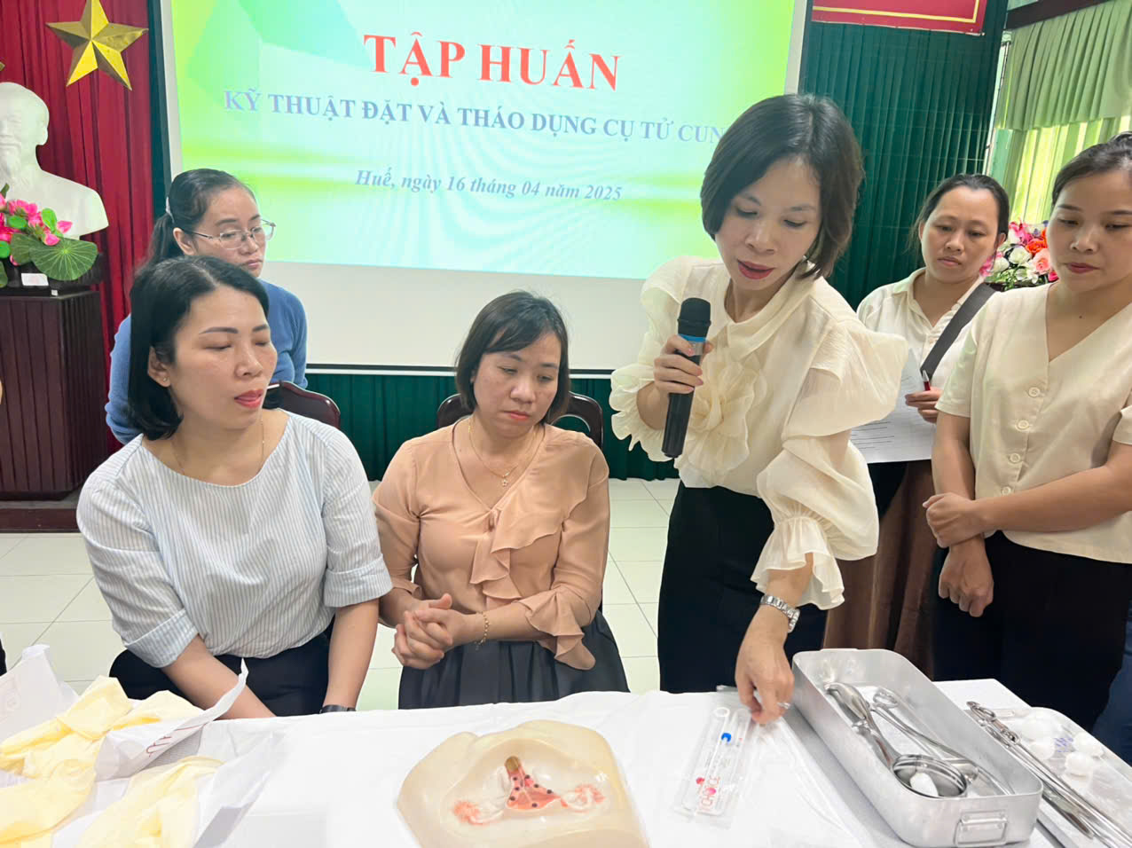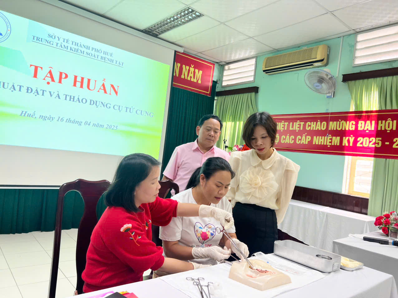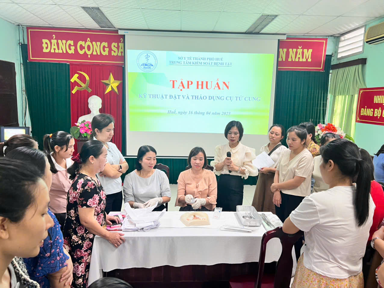 Thực hiện công văn số 91/SYT-NVY ngày 07/01/2025 của Sở Y tế thành phố Huế về xây dựng Kế hoạch triển khai chiến dịch truyền thông lồng ghép cung cấp dịch vụ chăm sóc sức khoẻ sinh sản- kế hoạch hoá gia đình nhằm đáp ứng các dịch vụ KHHGĐ thường xuyên; Căn cứ nhu cầu đào tạo tập huấn thực tế của các đơn vị y tế tuyến cơ sở. Ngày 16/4/2025 tại hội trường Trung tâm Kiểm soát bệnh tật thành phố Huế, Khoa Sức Khoẻ sinh sản tổ chức lớp tập huấn Kỹ thuật đặt và tháo dụng cụ tử cung cho cán bộ y tế đang hoạt động trong lĩnh vực chăm sóc sức khoẻ sinh sản trên địa bàn Thành phố Huế.