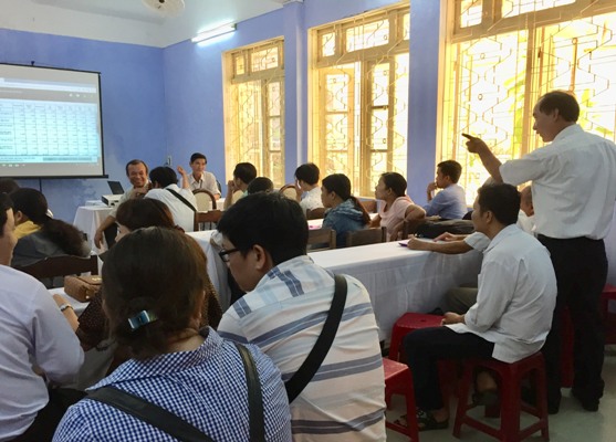 BSCKI Nguyễn Bảo Trí - trưởng khoa KST-CT, các bộ phận liên quan cùng cán bộ chuyên trách phòng chống sốt rét các huyện/thị xã thảo luận phương án triển khai kế hoạch tẩm màn bằng hóa chất.