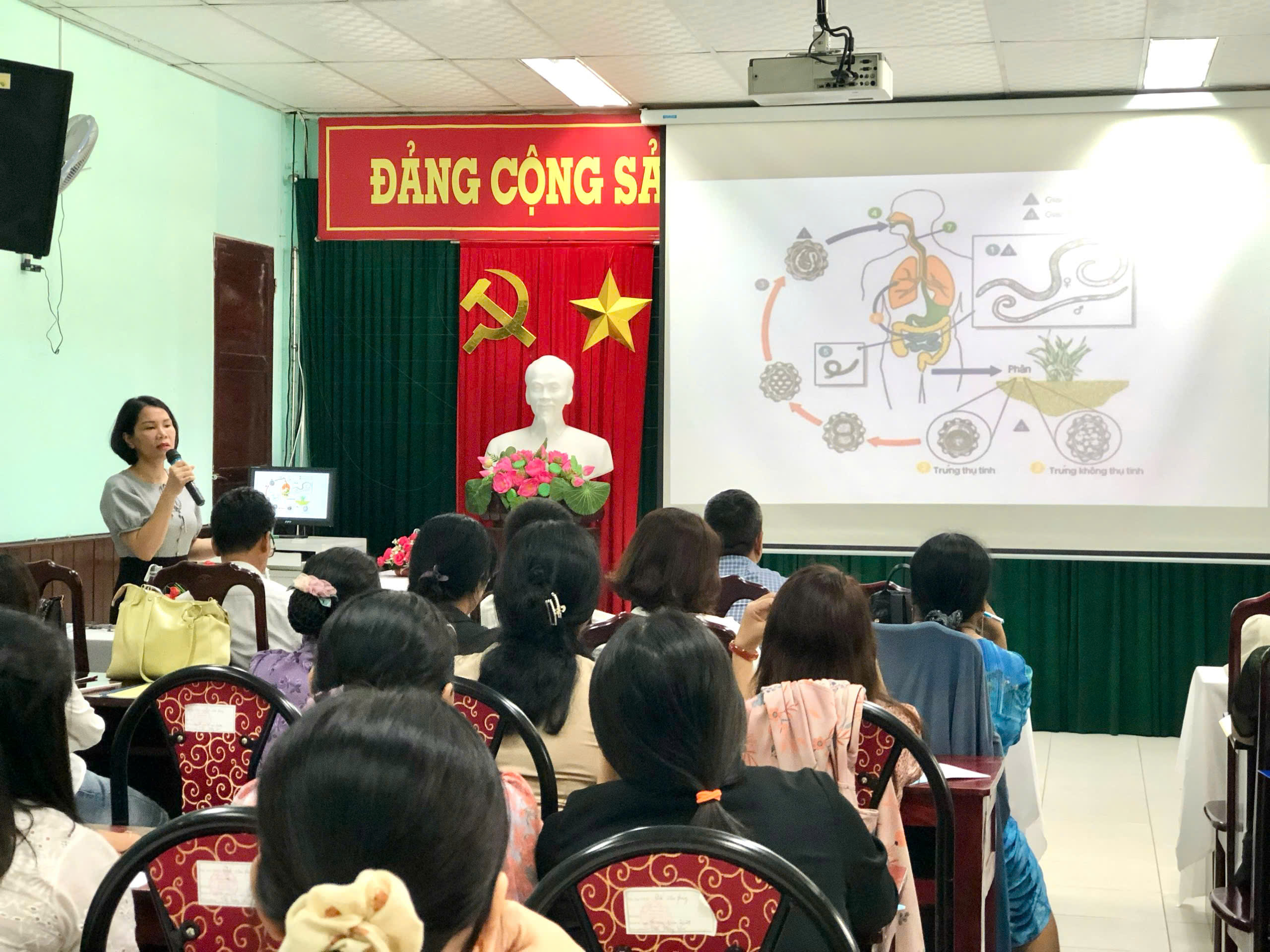 Bs.CKI. Lê Thị Sông Hương trình bày nội dung liên quan đến hoạt động tẩy giun cho trẻ 24 đến dưới 72 tháng tuổi