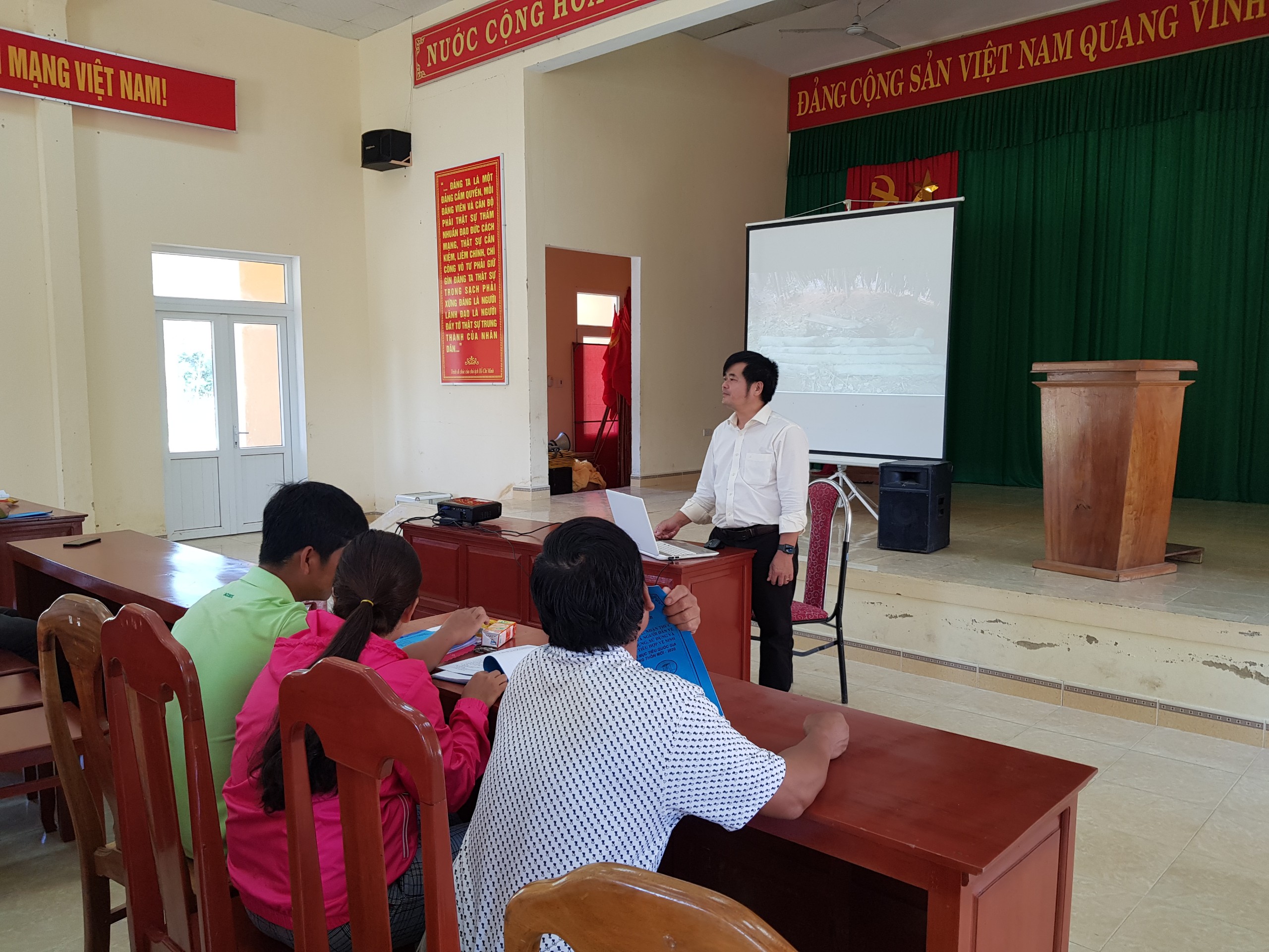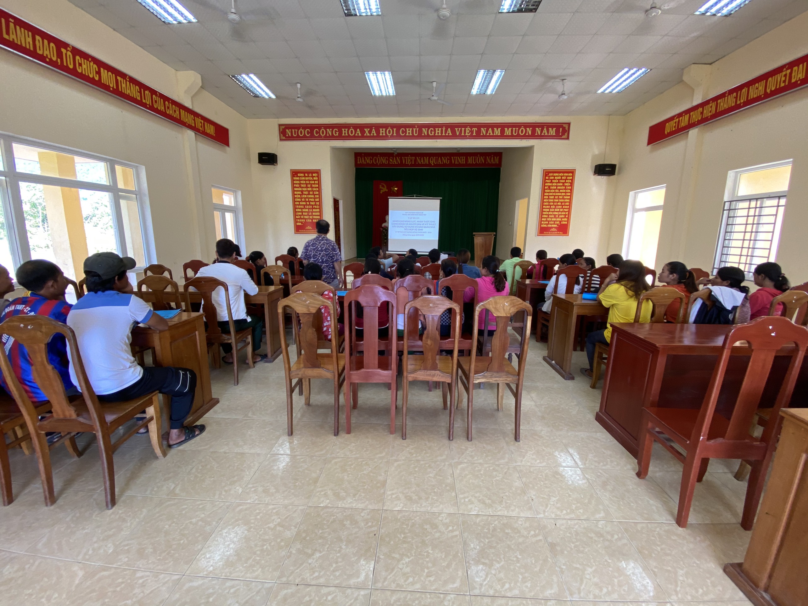 Lớp tập huấn có sự tham gia của các nhóm thợ xây tại địa phương, đại diện các hộ gia đình, trưởng thôn, phụ nữ thôn tại các thôn đang triển khai xây dựng nhà tiêu. Tại lớp tập huấn ThS.Bs Trần Bá Thanh - Trưởng khoa SKMT-YTTH đã trình bày các nội dung giới thiệu về các loại nhà tiêu hợp vệ sinh, tiêu chuẩn kỹ thuật xây dựng nhà tiêu hợp vệ sinh và tầm quan trọng của nhà tiêu hợp vệ sinh trong việc phòng, chống dịch bệnh và bảo vệ sức khỏe, cải thiện chất lượng cuộc sống. Việc thiếu nhà vệ sinh hoặc nhà vệ sinh không đảm bảo tại các hộ gia đình có thể ảnh hưởng đến sức khỏe, năng suất lao động, là nguyên nhân chính gây ra các dịch bệnh đường tiêu hóa như tả, lỵ, thương hàn và nhiễm các loại giun, sán đường ruột…