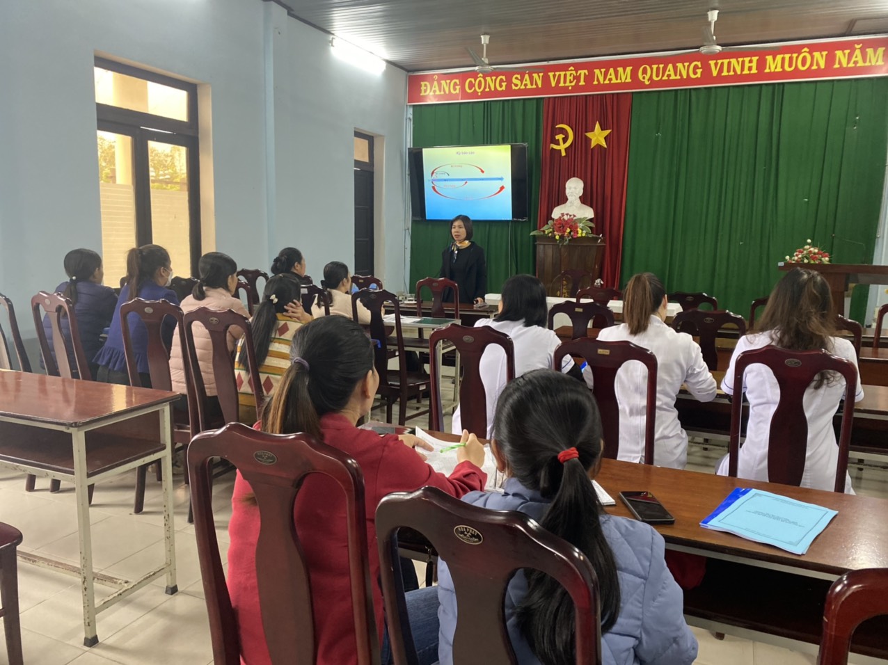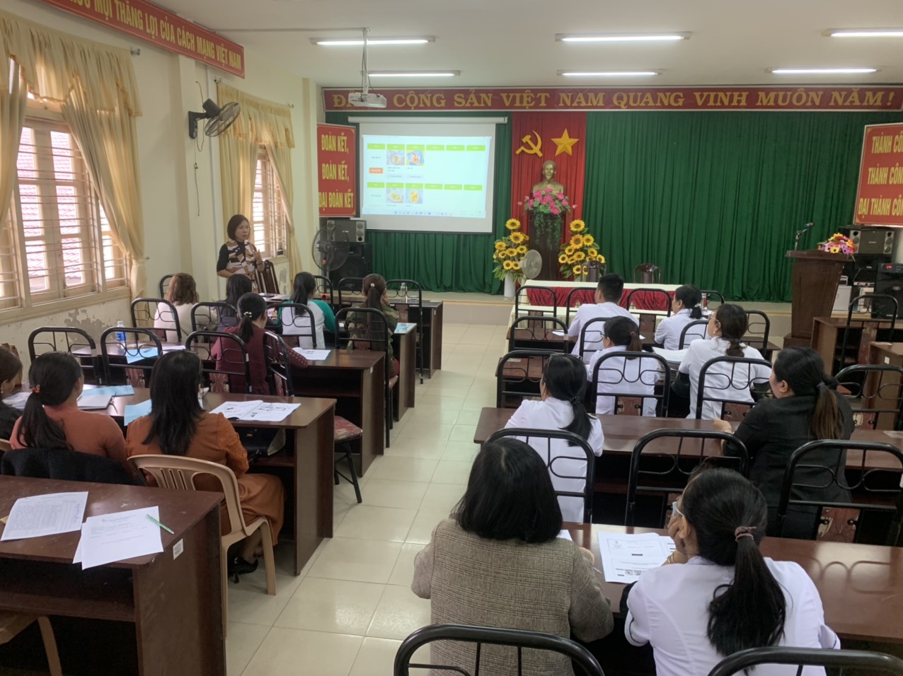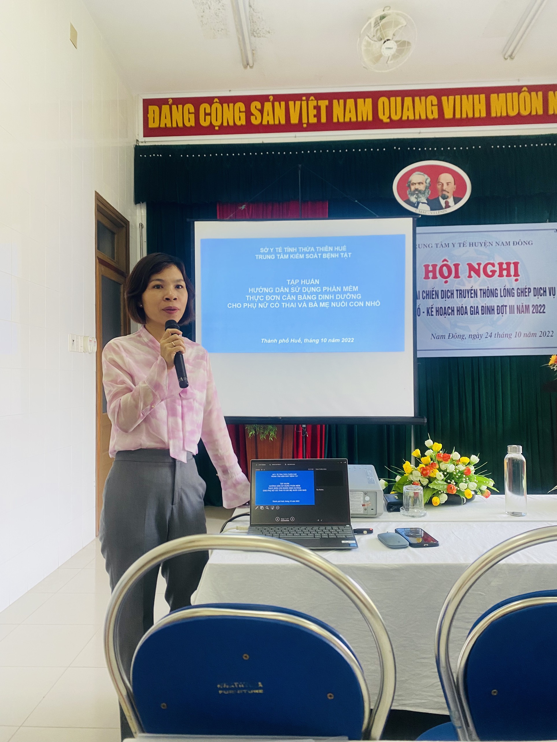 Ths Bs Hà Thị Mỹ Dung- Trưởng khoa Sức khỏe sinh sản đang trình bày các nội dung Xây dựng thực đơn dinh dưỡng lớp tập huấn tại Trung tâm y tế Hương Trà