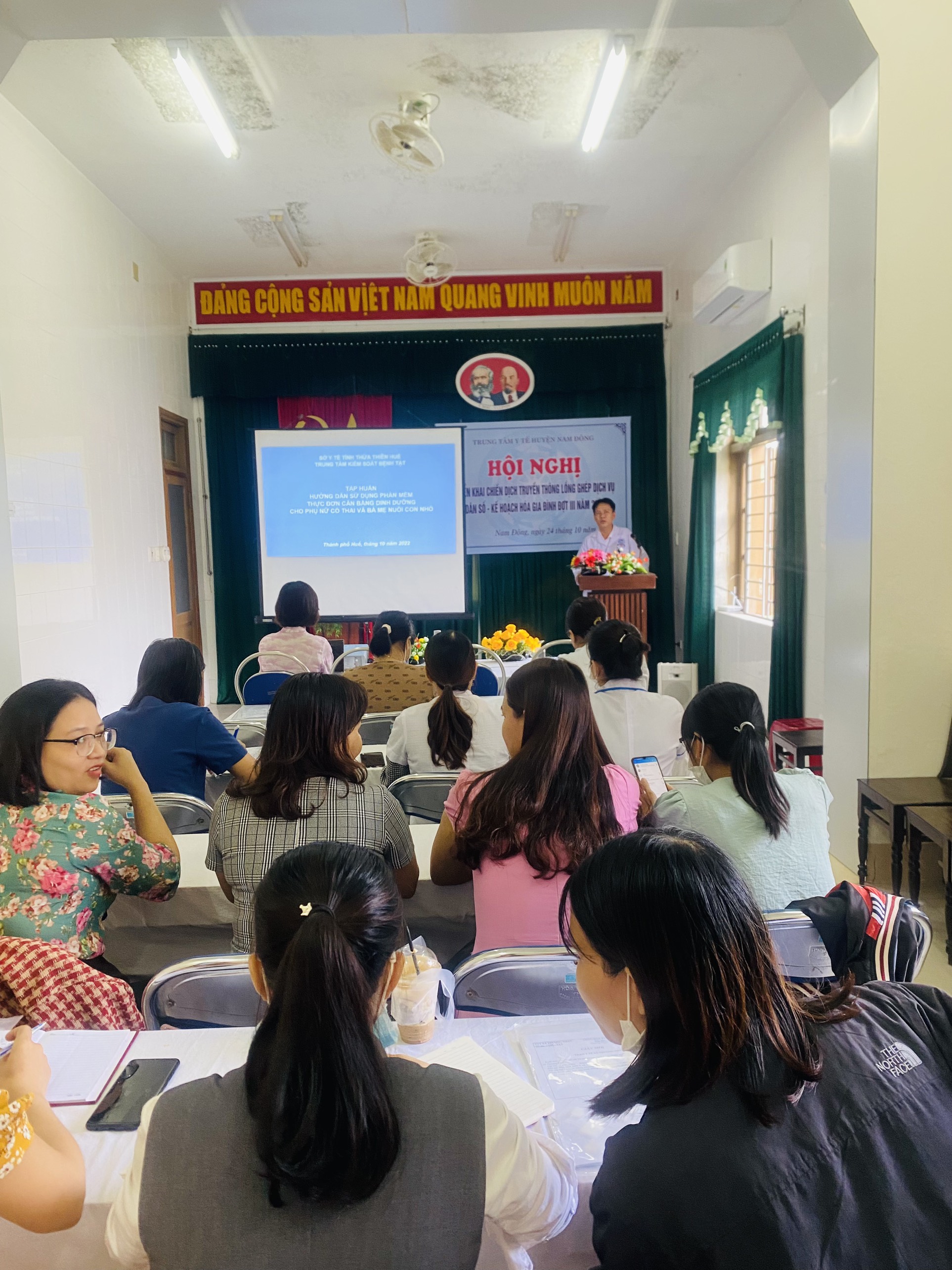 Thực hiện kế hoạch hoạt động của Trung tâm Kiểm soát bệnh tật tỉnh năm 2022 trong đó có công tác Chăm sóc sức khỏe sinh sản. Trung tâm Kiểm soát bệnh tật tổ chức Tập huấn nội dung” Xây dựng thực đơn dinh dưỡng cho phụ nữ mang thai, bà mẹ cho con bú và trẻ em từ 7 tháng đến 60 tháng tuổi”; đồng thời lồng ghép tập huấn, cầm tay chỉ việc, hướng dẫn nội dung “ Quy định chế độ báo cáo thống kê ngành y tế lĩnh vực Chăm sóc sức khỏe sinh sản năm 2022” cho tuyến y tế cơ sở, từ ngày 12-26/10/2022 tại 9 Trung tâm các huyện/thị xã/thành phố. Mỗi lớp có 25 học viên tham dự.
