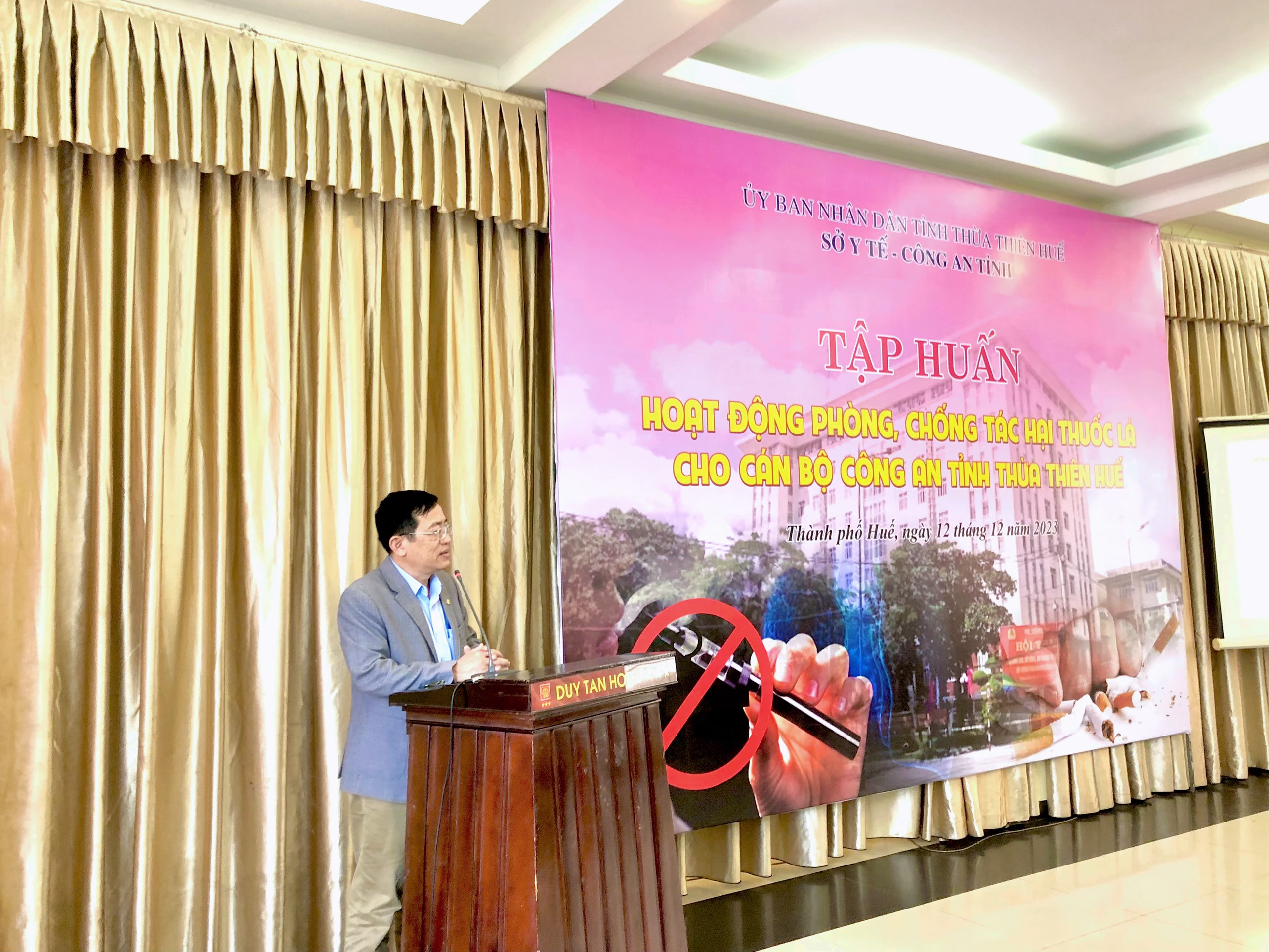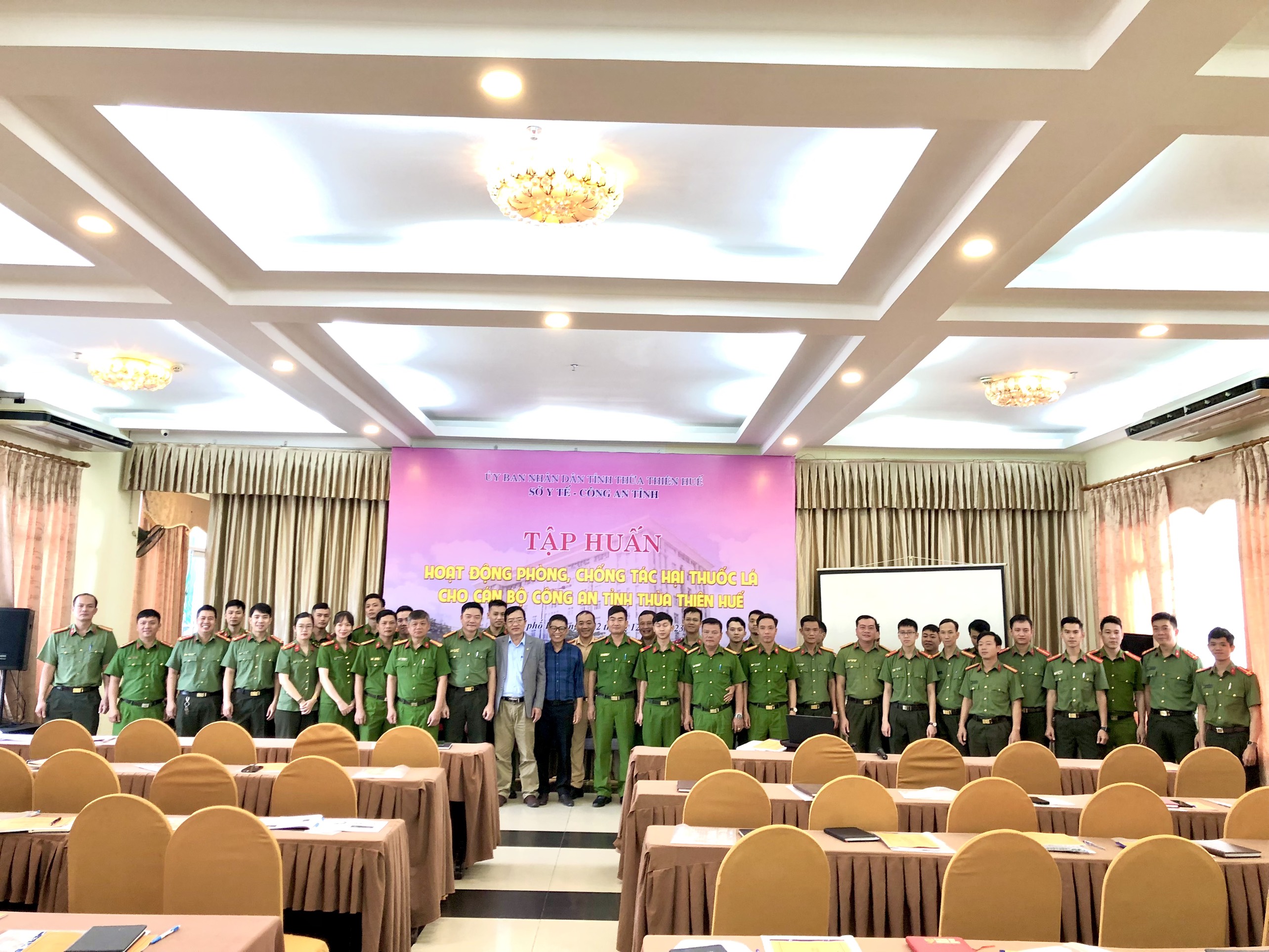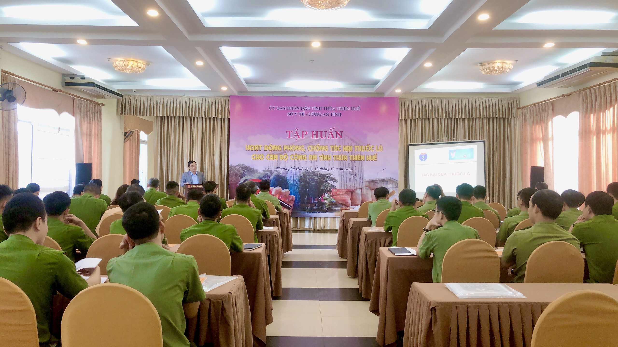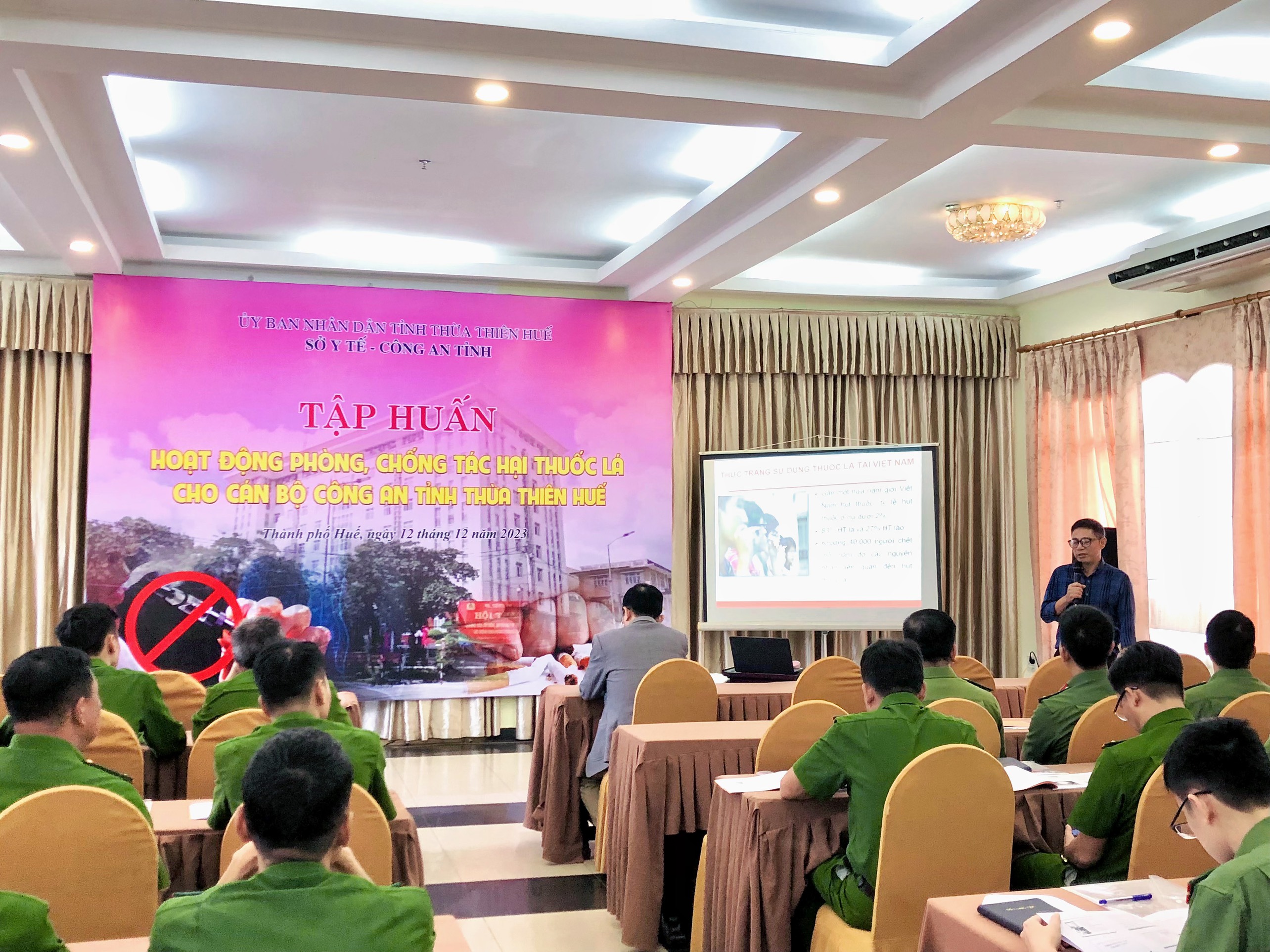Ngày 12/12/2023, Sở Y tế (Trung tâm Kiểm soát Bệnh tật tỉnh) phối hợp Công an tỉnhThừa Thiên Huế tổ chức tập huấn phòng, chống tác hại thuốc lá cho cán bộ, chiến sĩ Công an tỉnh. Đến tham dự và khai mạc tập huấn, về phía Công an tỉnh có Trung tá Hồ Văn Thành - Phó trưởng phòng Hậu cần, về phía Trung tâm Kiểm soát Bệnh tật tỉnh có ThS. BSCKII Nguyễn Lê Tâm – Phó Giám đốc phụ trách cùng các cán bộ, chiến sĩ các phòng, ban thuộc Công an tỉnh.