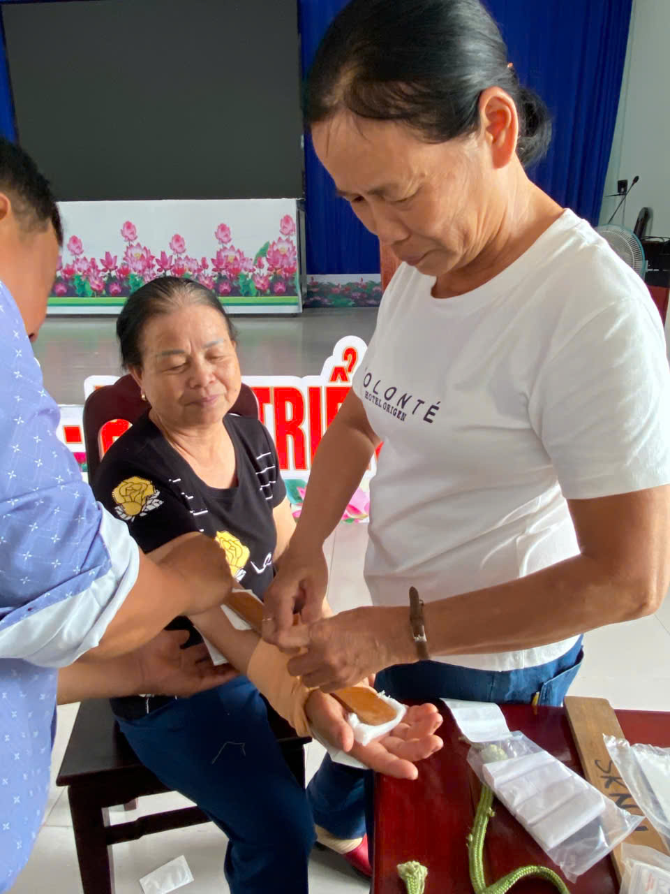 Học viên lớp học thực hành băng bó vết thương.