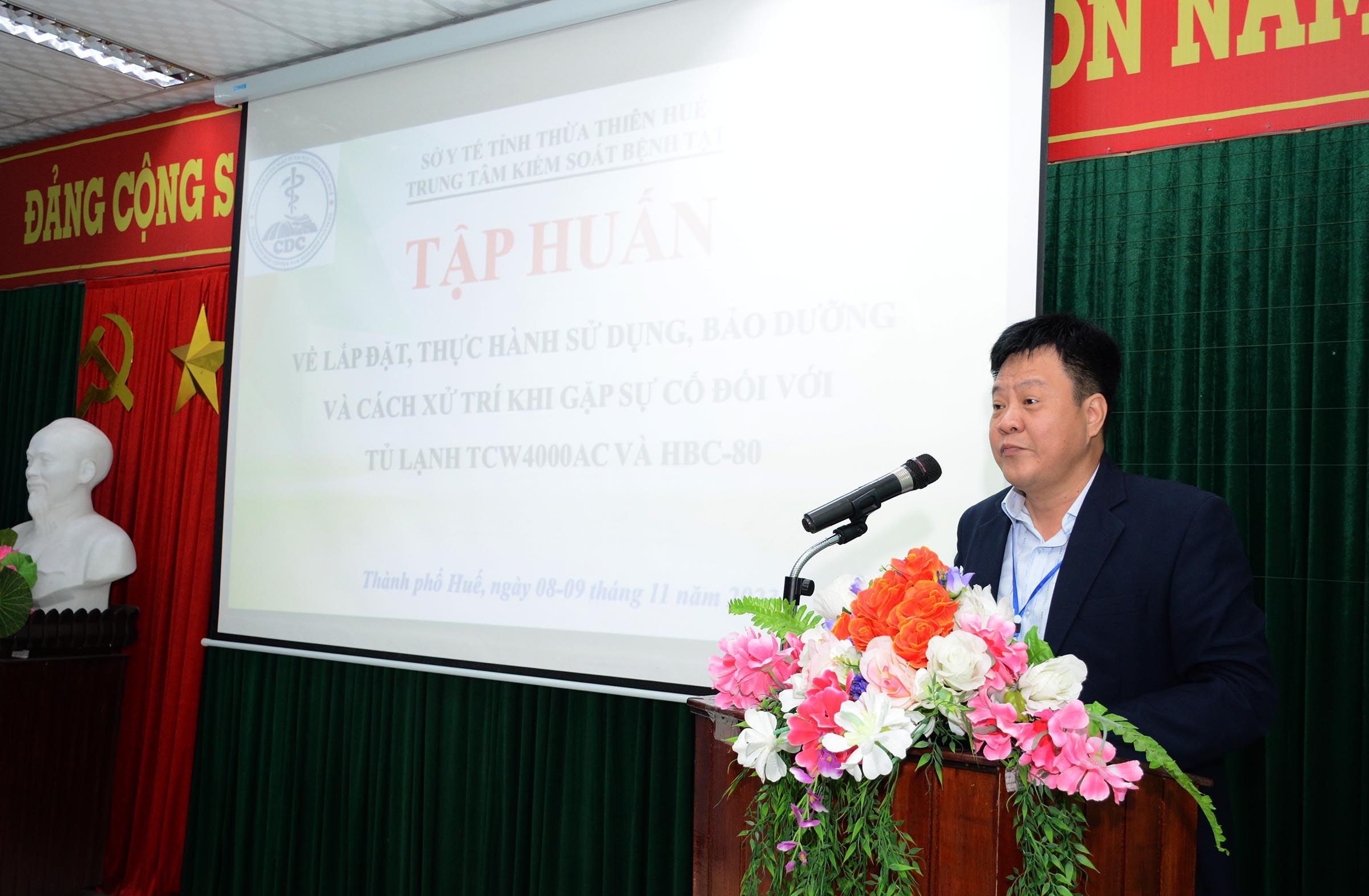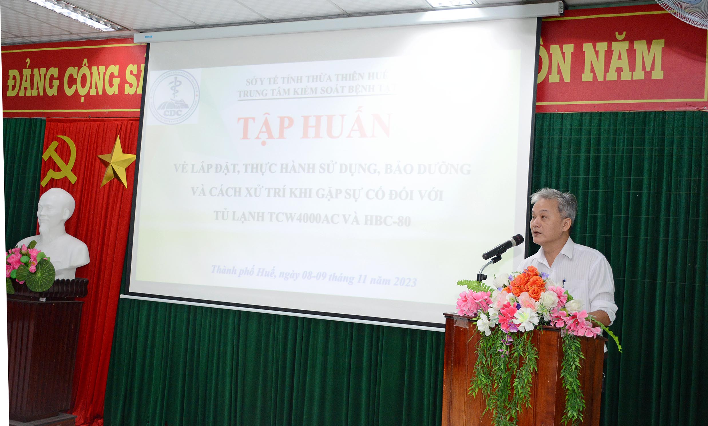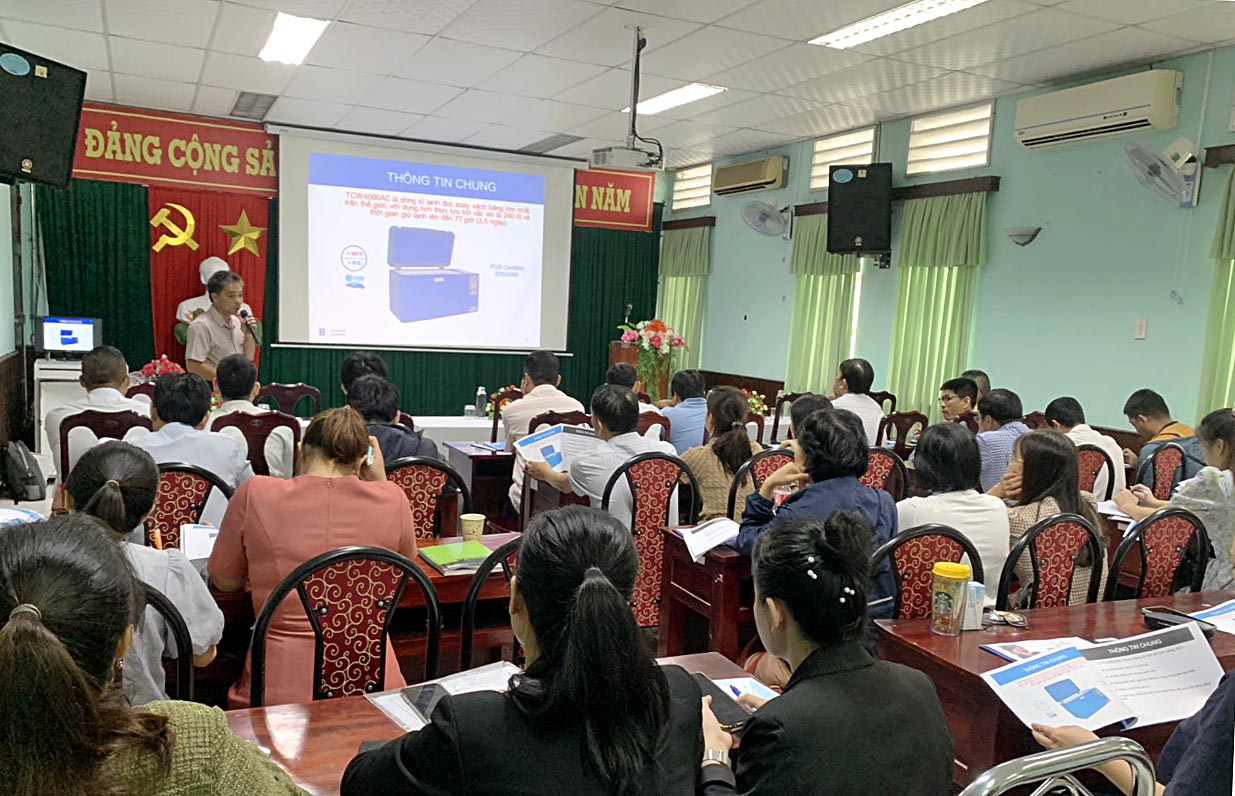 Thực hiện kế hoạch Chương trình Tiêm chủng Quốc gia - Viện Vệ sinh dịch tễ Trung ương, trong hai ngày 8-9/11, Trung tâm Kiểm soát bệnh tật tỉnh (CDC) phối hợp cùng CTY TNHH MTV XD-TM DO thành phố Hồ Chí Minh tổ chức lớp “Tập huấn về lắp đặt, thực hành sử dụng, bảo dưởng và cách xử trí khi gặp sự cố đối với tủ lạnh TCW4000AC và HBC-80”. Gần 40 học viên tham dự lớp tập huấn gồm có Tổ thiết bị y tế - Sở Y tế, Tổ tiêm chủng, Tổ bảo quản, thủ kho vắc xin của CDC và 9 TTYT huyện/thị xã/thành phố.