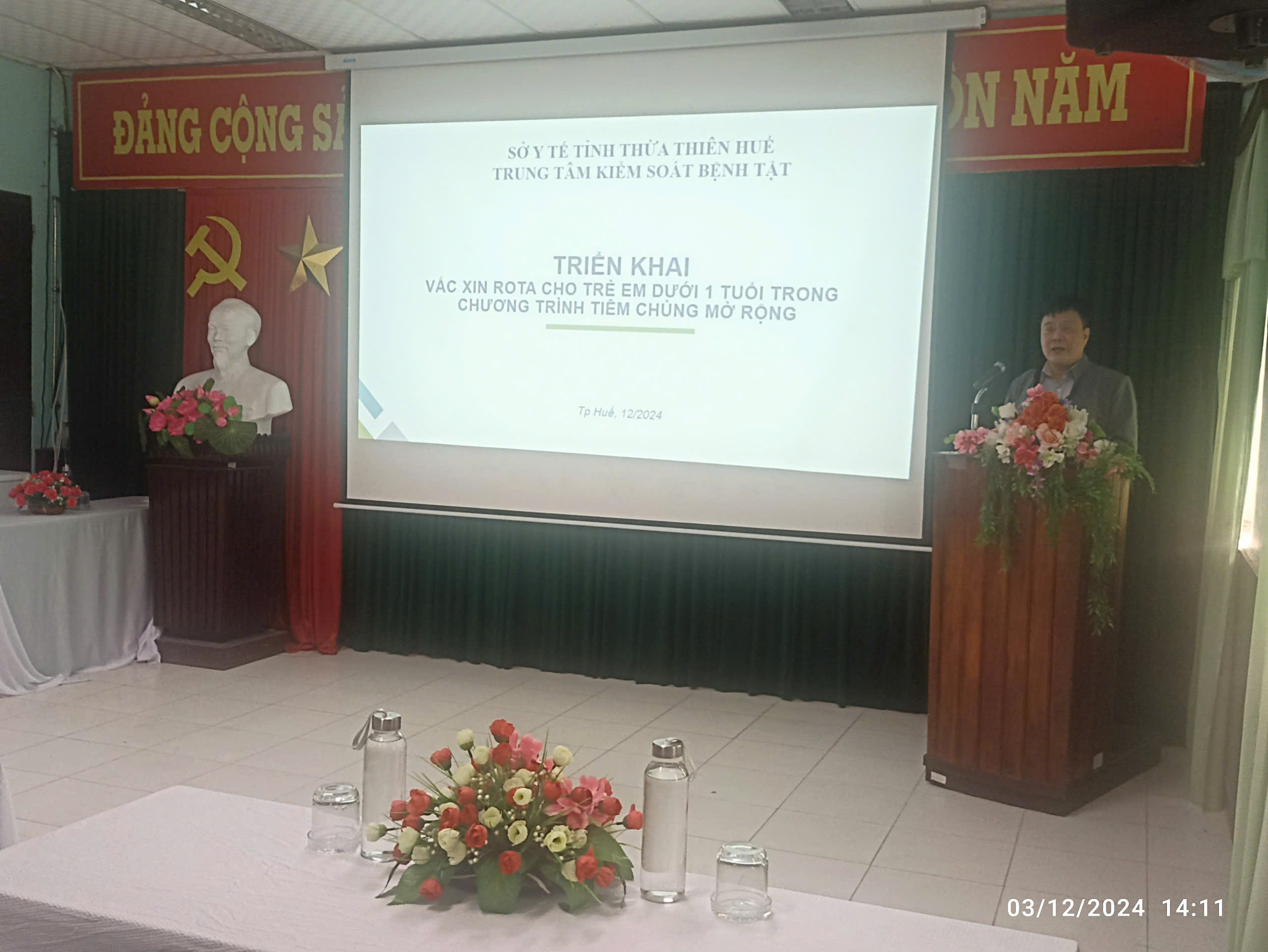 Ngày 03/12/2024, Trung tâm kiểm soát bệnh tật tỉnh (CDC) tổ chức lớp tập huấn về triển khai tiêm chủng vắc xin Rota phòng Bệnh tiêu chảy cấp cho trẻ em trong Chương trình Tiêm chủng mở rộng (TCMR) Quốc gia. Tham dự lớp tập huấn gồm có: Lãnh đạo đơn vị, lãnh đạo khoa PCBTN&KSTCT của CDC; Lãnh đạo đơn vị, khoa KSBT và cán bộ chuyên trách tiêm chủng của 9 TTYT huyện/thị xã/thành phố Huế. Với mục tiêu đưa vắc xin Rota vào chương trình TCMR cho trẻ em dưới 1 tuổi để bảo vệ sức khỏe chủ động phòng Bệnh tiêu chảy cấp do vi rút Rota cho trẻ em. Với chỉ tiêu đạt tỷ lệ ≥ 90% số trẻ em dưới 1 tuổi tại các địa phương phải được tiêm đủ 2 liều vắc xin Rota theo lịch tiêm chủng định kỳ hàng tháng. Công tác tiêm chủng phải đảm bảo an toàn theo Nghị định số 104/2016/NĐ-CP ngày 01/7/2016 của Chính phủ, và thực hiện theo đúng quy trình, hướng dẫn của Bộ Y tế về công tác tiêm chủng.