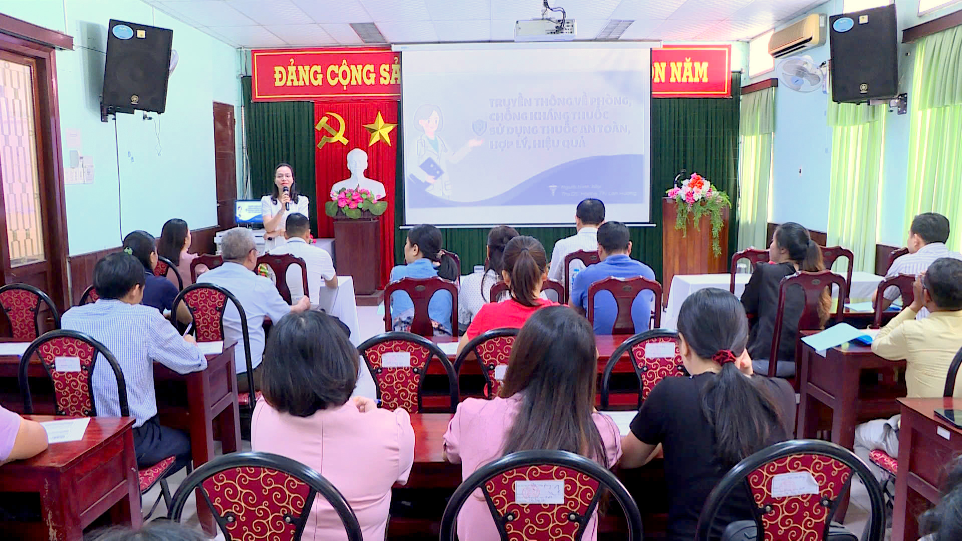 Các giảng viên trình bày nội dung về phòng, chống kháng thuốc và kĩ năng truyền thông về kháng thuốc tại lớp tập huấn