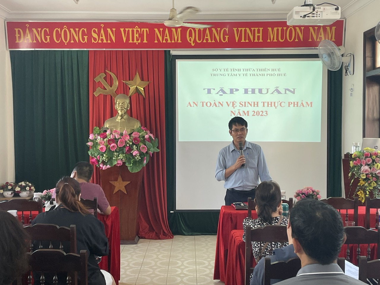 Tại buổi tập huấn, Th.s Phạm Xuân Hiếu - Trưởng khoa An toàn thực phẩm - Dinh dưỡng đã trình bày các nội dung về an toàn vệ sinh thực phẩm; các con đường gây ô nhiễm vào thực phẩm; nguyên tắc chế biến thực phẩm an toàn. Bên cạnh đó, giảng viên cũng tích cực hướng dẫn các cơ sở kinh doanh dịch vụ ăn uống trên địa bàn thực hiện tốt quy định về an toàn vệ sinh thực phẩm; hướng dẫn, tư vấn, phổ biến cho các cơ sở về công tác an toàn vệ sinh thực phẩm, phòng chống ngộ độc thực phẩm, dịch bệnh truyền qua thực phẩm và phòng chống dịch Covid-19 tại các cơ sở dịch vụ ăn uống trên địa bàn thành phố Huế.