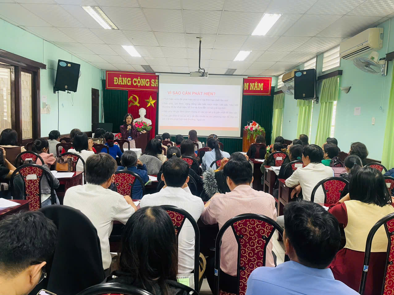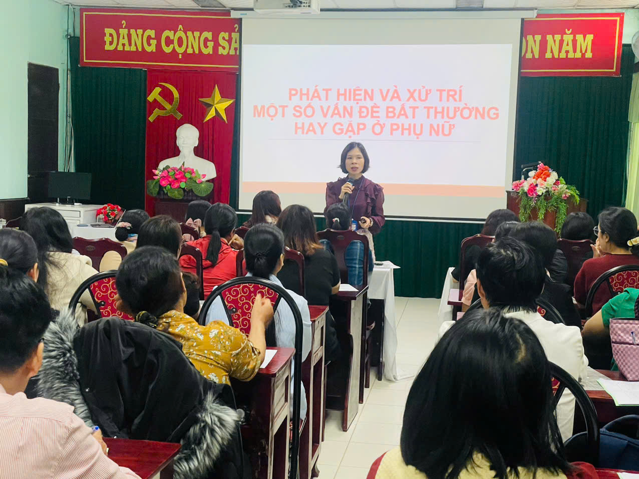 Giảng viên là Ths.BsCk1. Hà Thị Mỹ Dung, Trưởng khoa Sức khoẻ sinh sản, Trung tâm Kiểm soát bệnh tật đang truyền tải kiến thức tại lớp tập huấn
