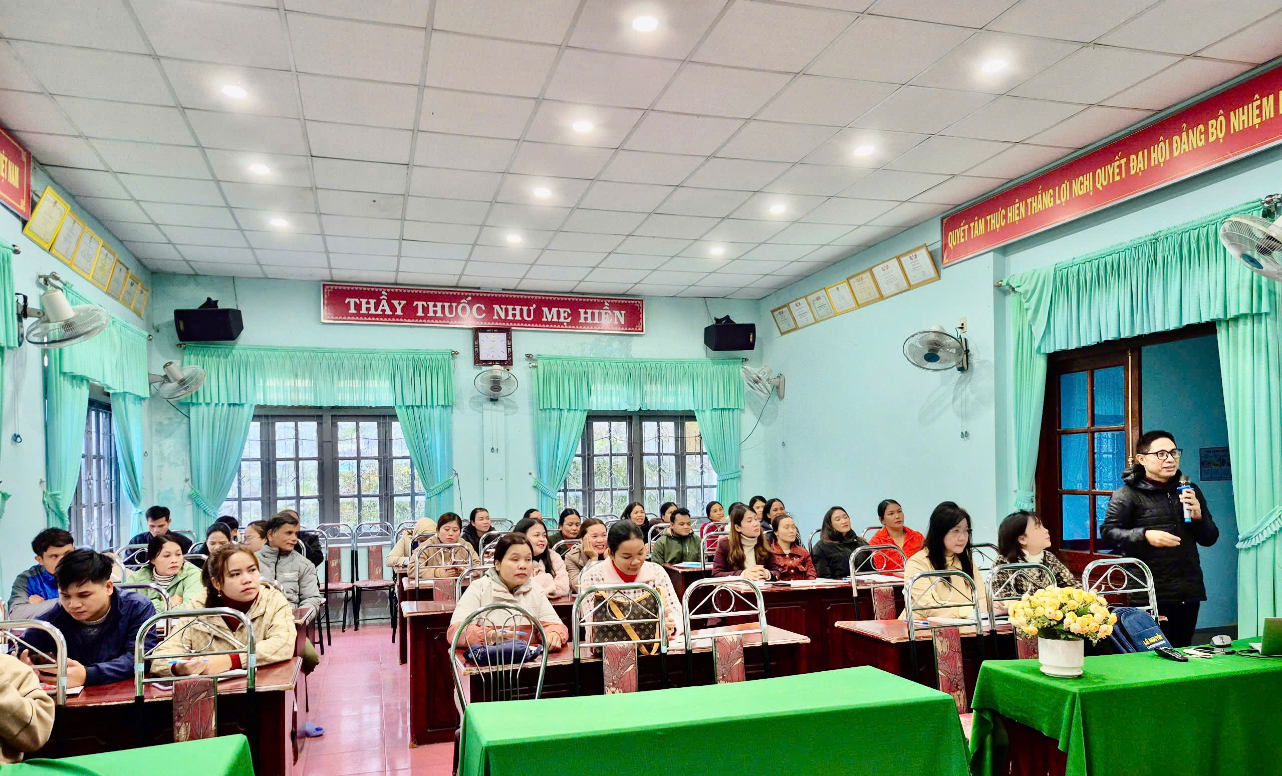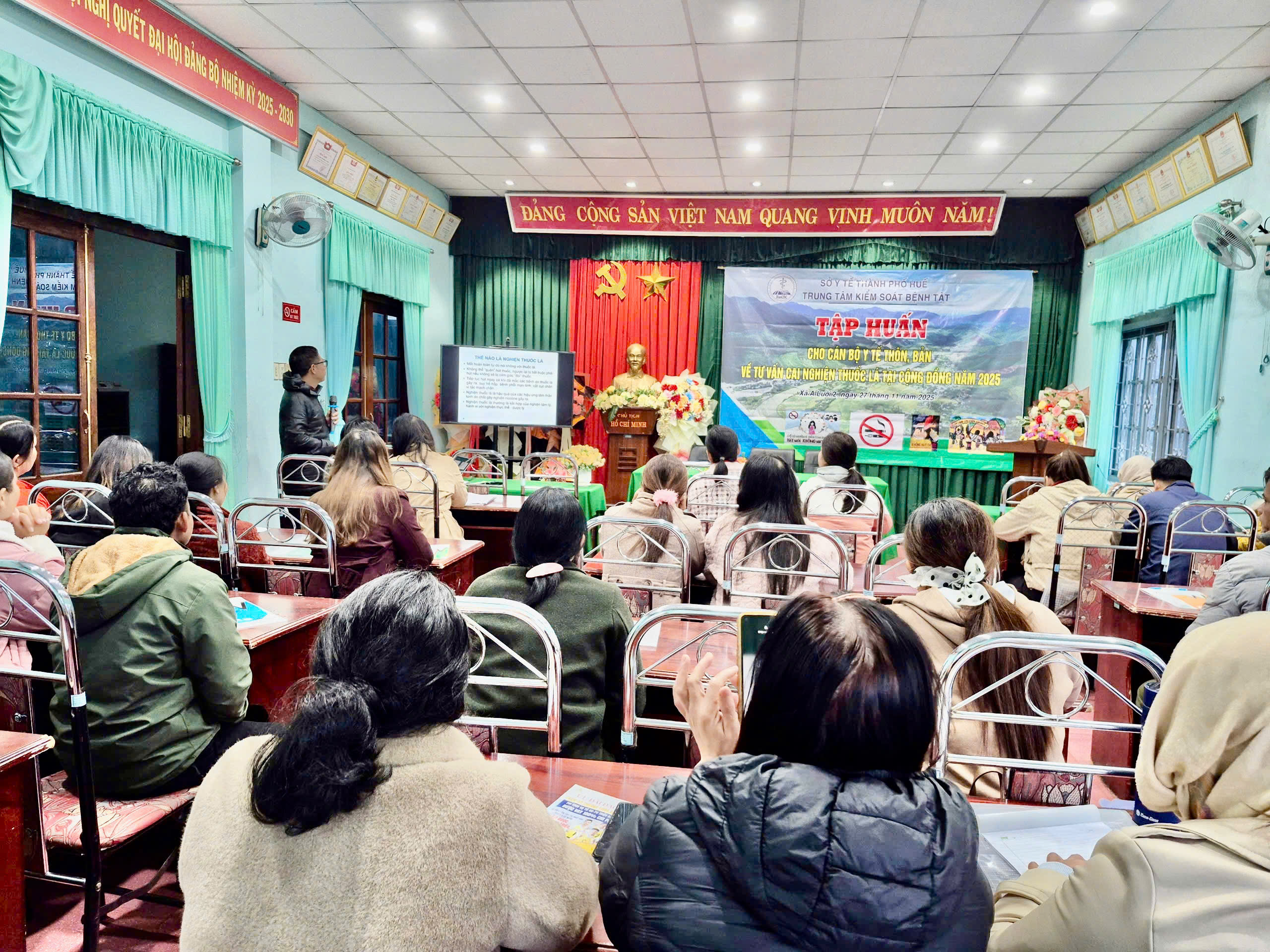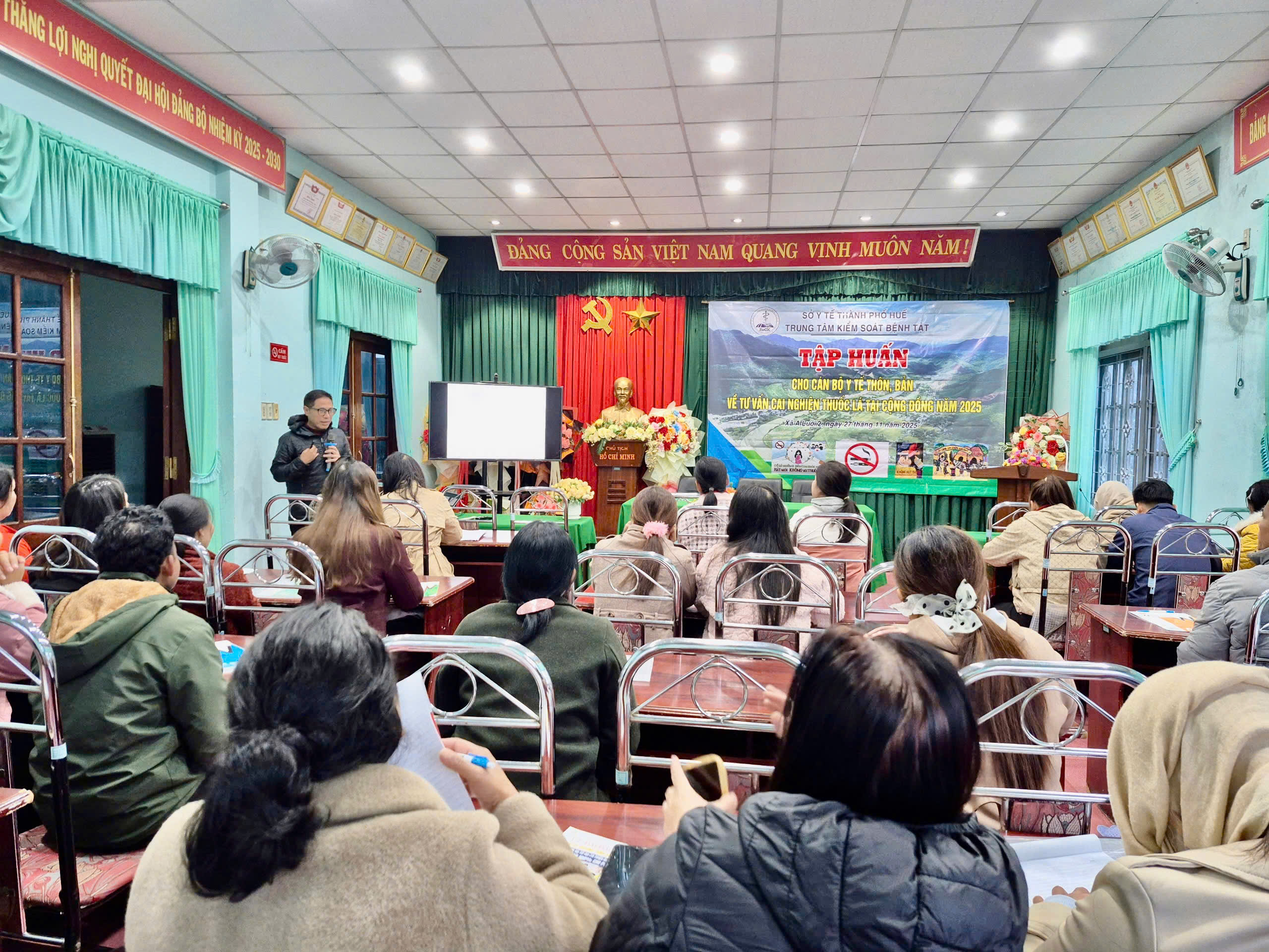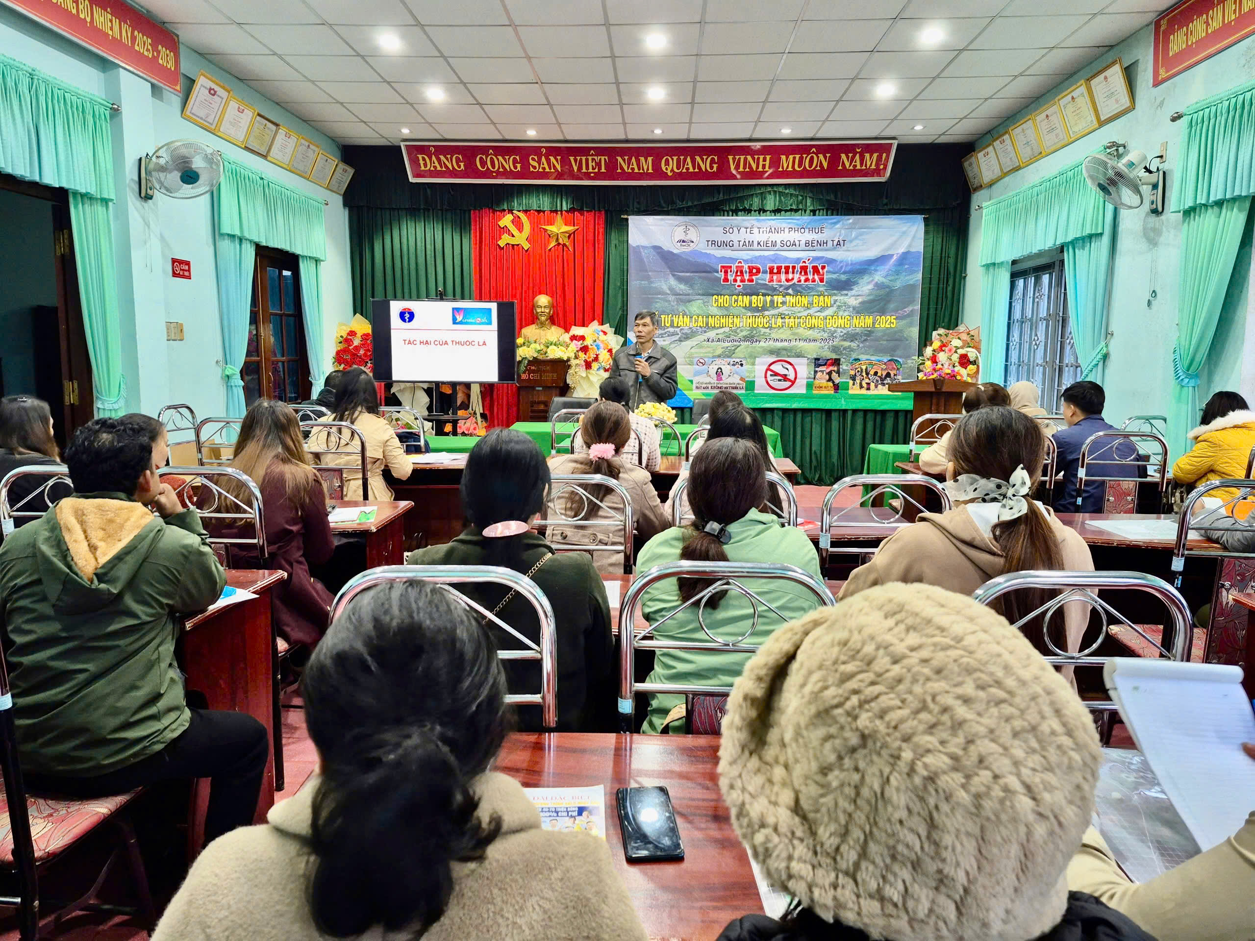 Nhằm nâng cao nhận thức của mỗi người dân về tác hại thuốc lá, từ đó xác định trách nhiệm của bản thân đối với gia đình, cộng đồng và toàn xã hội. Ngày 27/11/2025 Trung tâm Kiểm soát Bệnh tật thành phố Huế phối hợp Trung tâm Y tế A Lưới tổ chức tập huấn về tư vấn và cai nghiện thuốc lá tại cộng đồng cho 40 cán bộ y tế thôn, tổ, bản, cộng tác viên của các trạm Y tế xã, phường trực thuộc. Tham dự và khai mạc lớp tập huấn có BSCKI Dương Minh Trí- Phó Giám đốc Trung tâm Y tế A Lưới và báo cáo viên Ths.Bs Lê Trung Quân đến từ Trung tâm Kiểm soát Bệnh tật thành phố Huế.