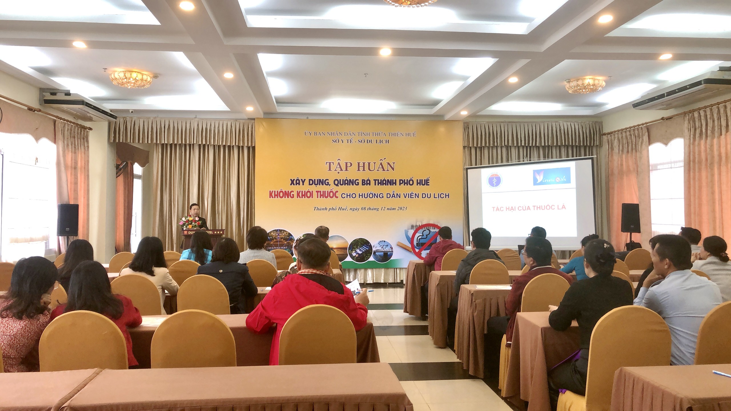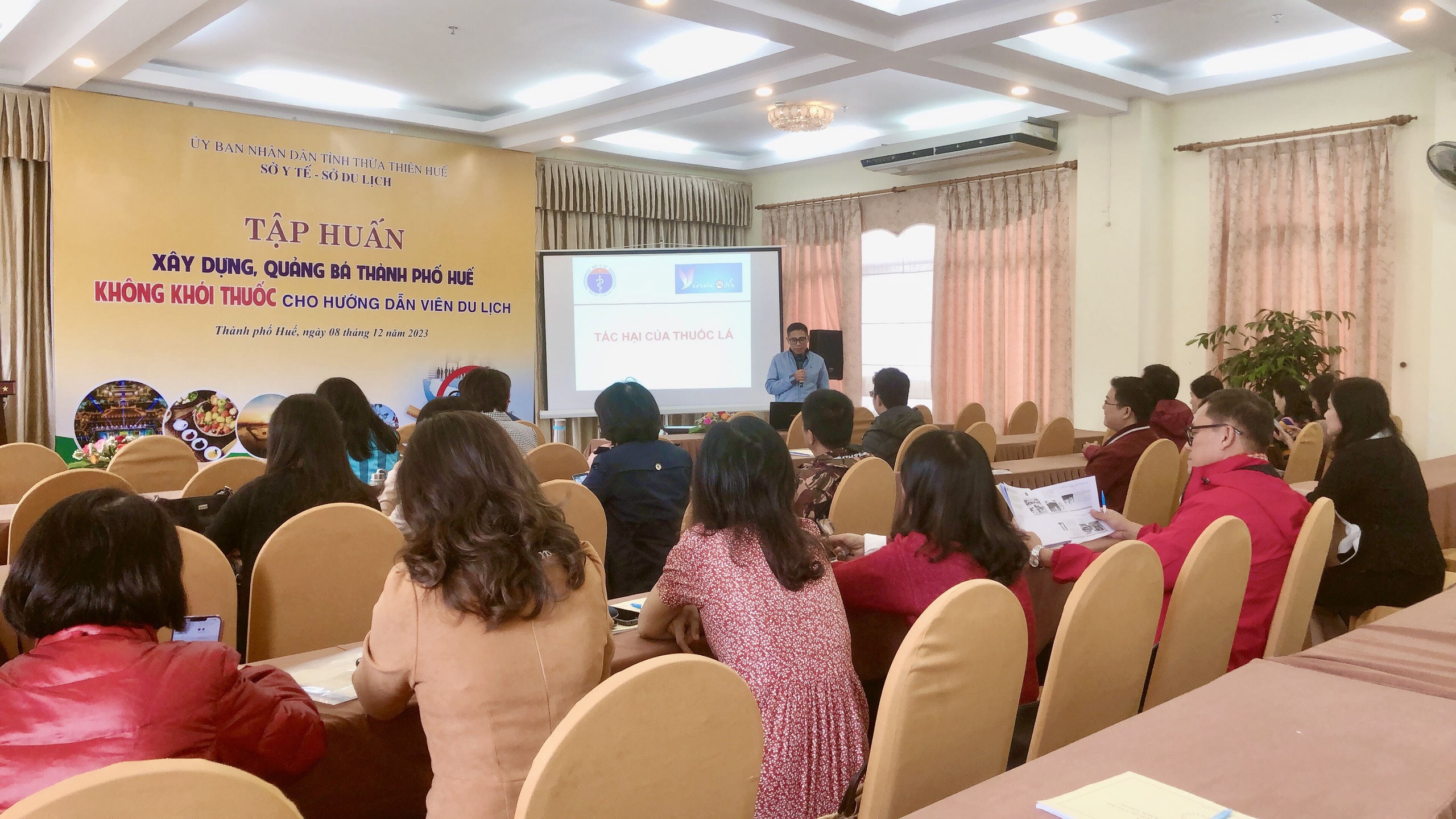 Vào ngày 08/12/2023, Sở Y tế - Cơ quan thường trực Ban Chỉ đạo phòng, chống tác hại thuốc lá tỉnh Thừa Thiên Huế đã giao cho Trung tâm Kiểm soát bệnh tật tỉnh làm đầu mối triển khai các hoạt động phòng, chống tác hại thuốc lá tổ chức tập huấn xây dựng, quảng bá Thành phố Huế không khói thuốc cho hướng dẫn viên du lịch.