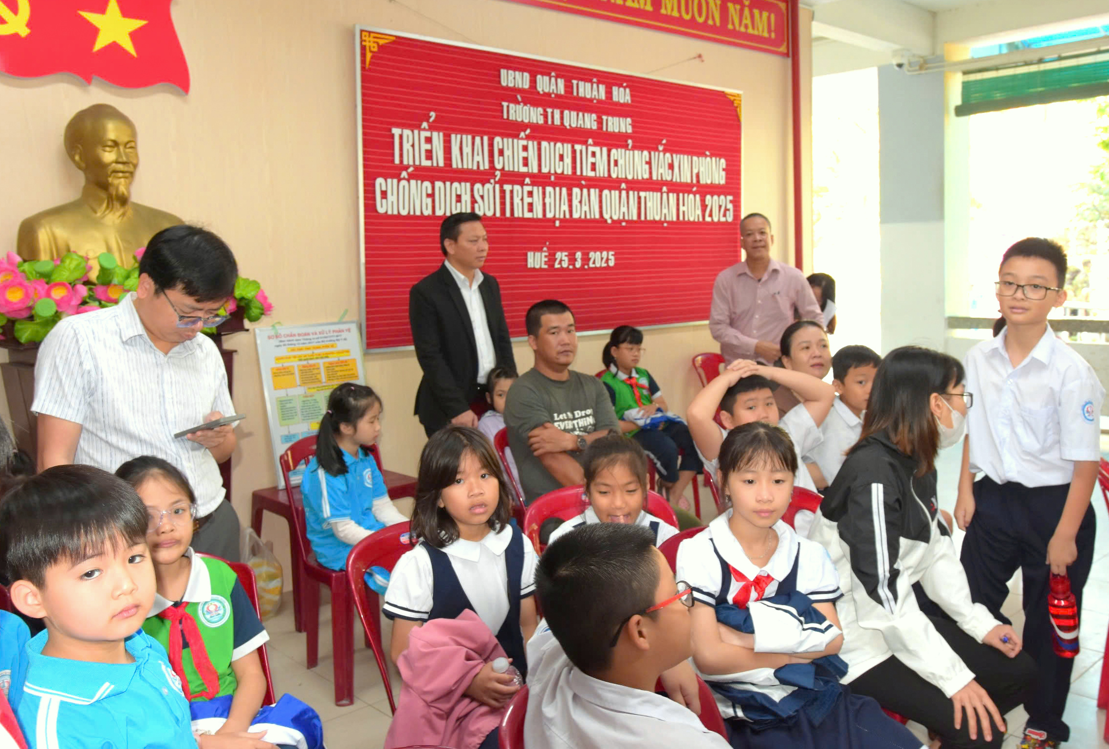 Tại quận Thuận Hóa, sáng ngày 25/3 Chiến dịch tiêm phòng vắc xin Sởi được tổ chức triển khai tại 18 điểm ở các trạm Y tế phường và trường tiểu học. Số trẻ trong diện được cung cấp vắc xin bảo vệ bệnh Sởi là: 9.080 trẻ. Các điểm tiêm phòng Sởi có đầy đủ nhân lực, khu vực tiêm phòng bố trí hợp lý, thuận tiện, các phương tiện, dụng cụ tiêm chủng, hộp chống sốc, thùng bảo quản vắc xin được trang bị đầy đủ.