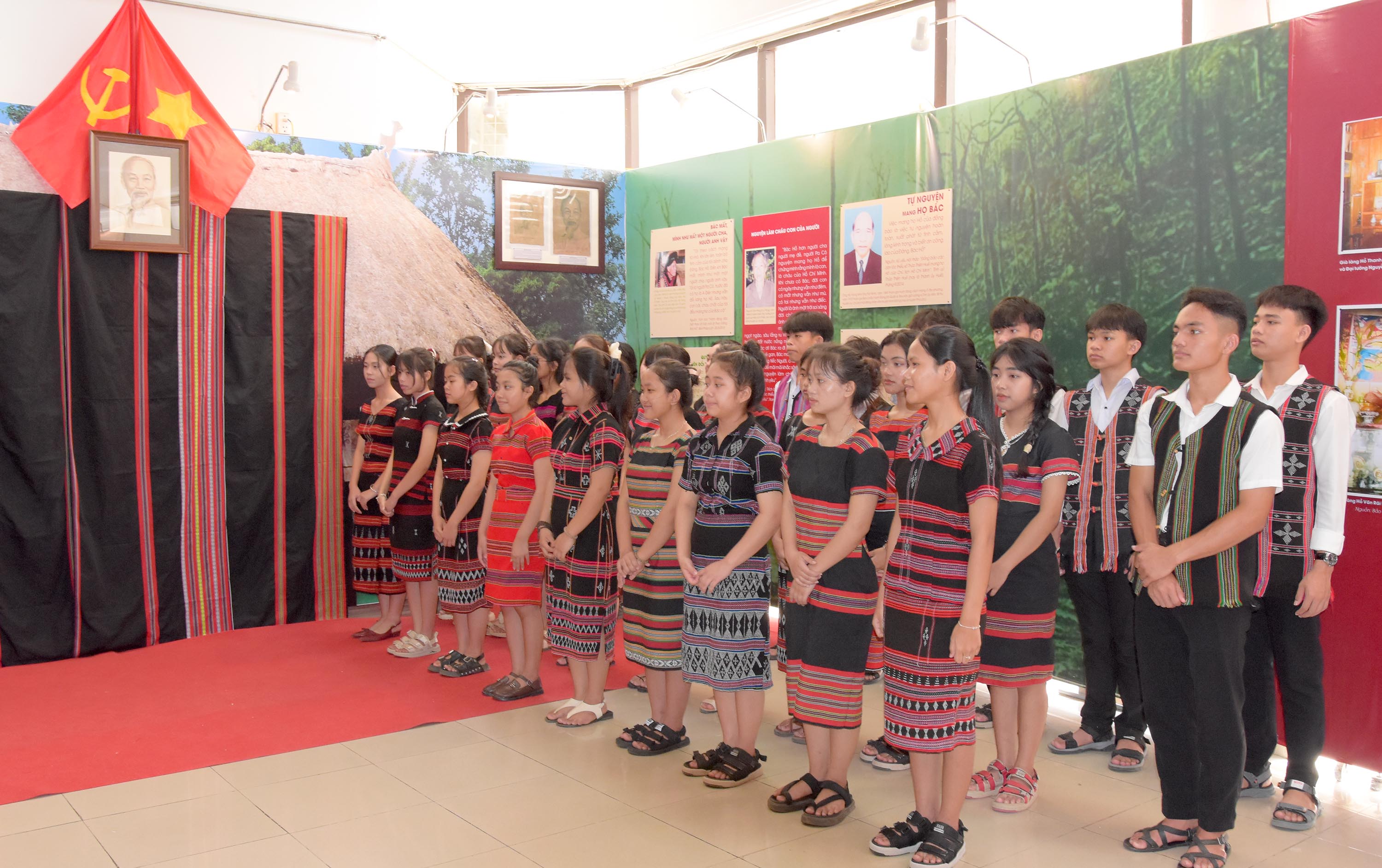 Lãnh đạo thành phố, các đại biểu và các cháu học sinh trường Dân tộc nội trú nghe thuyết minh và xem các tác phẩm trưng bày tại triển lãm.