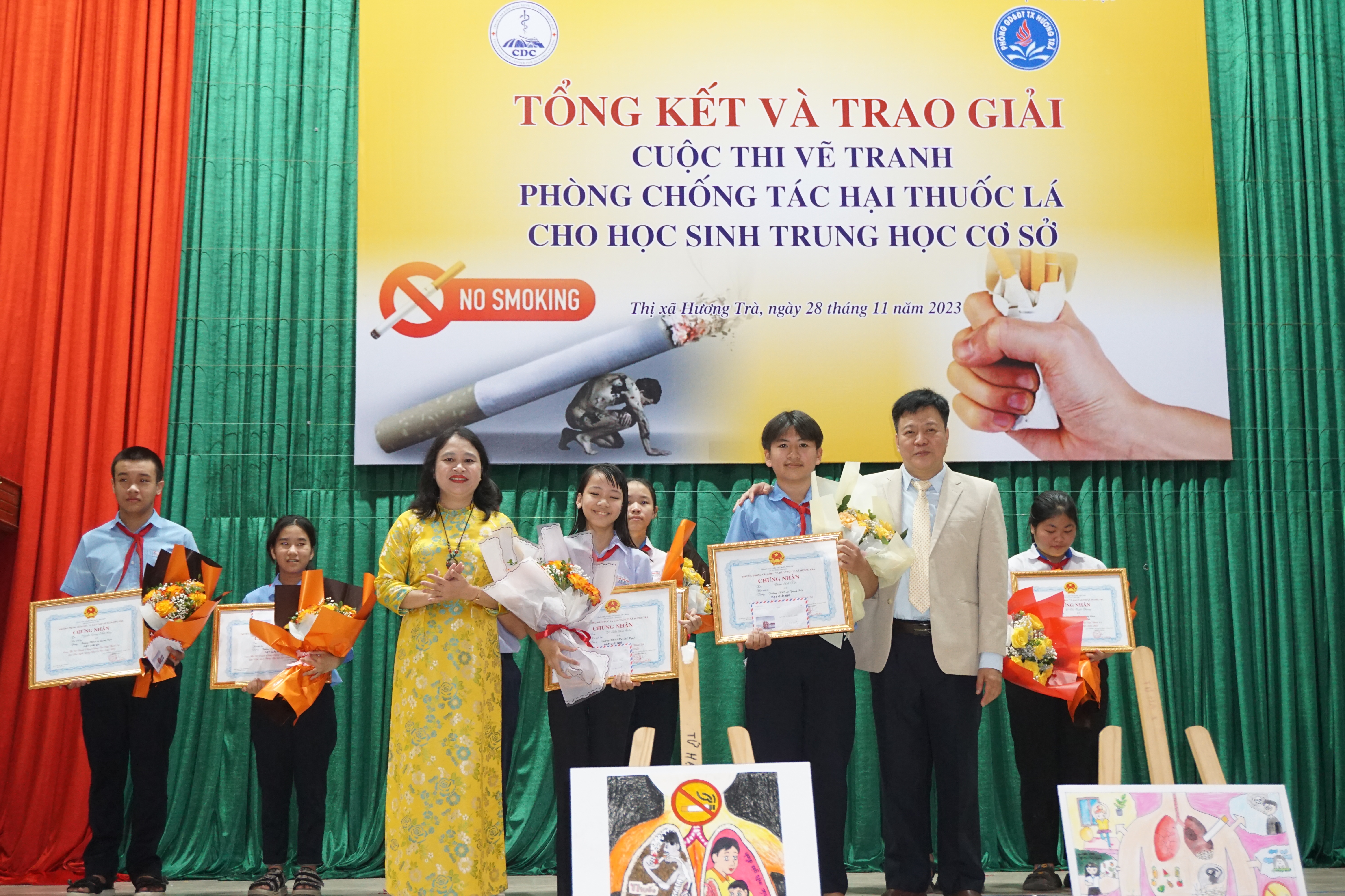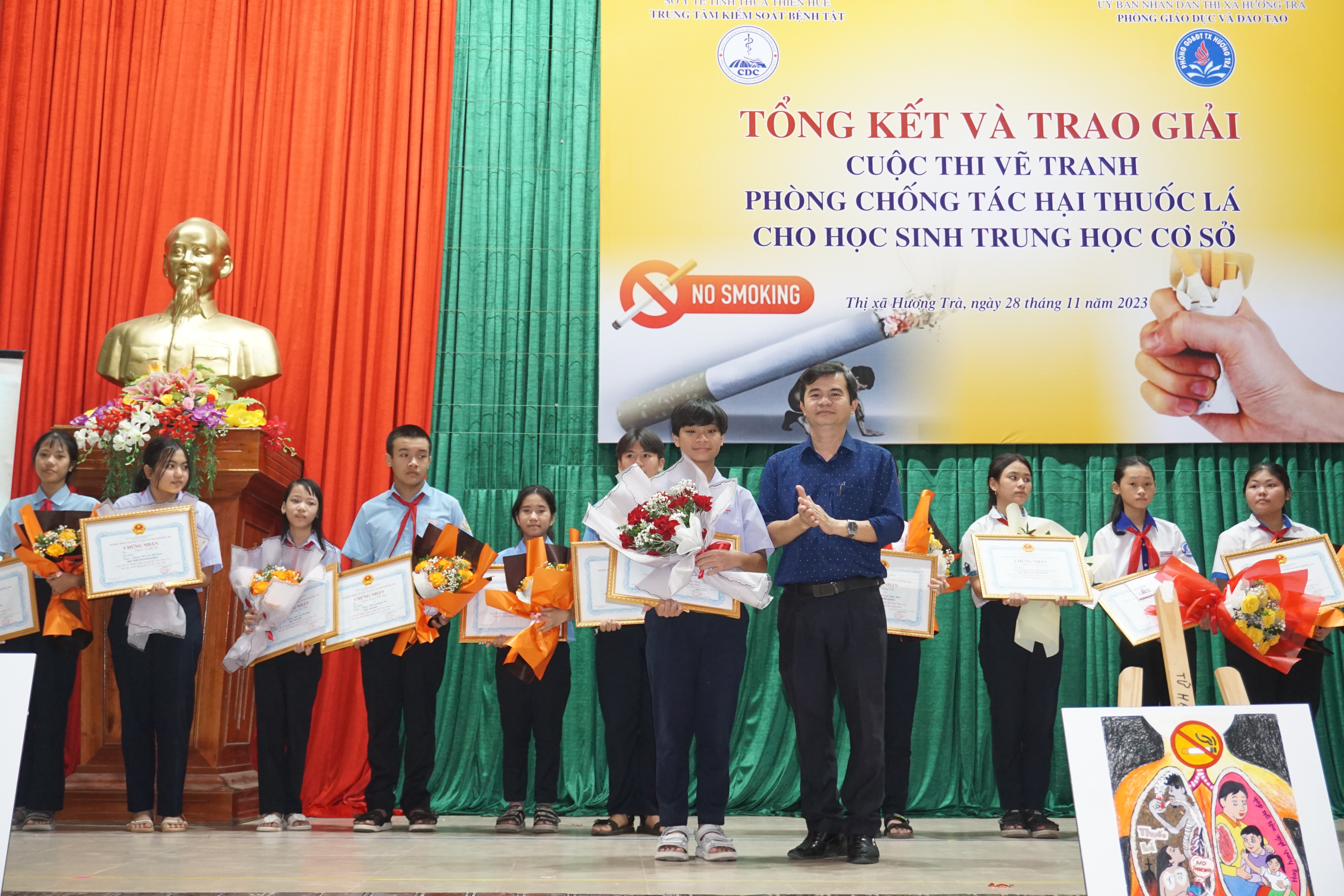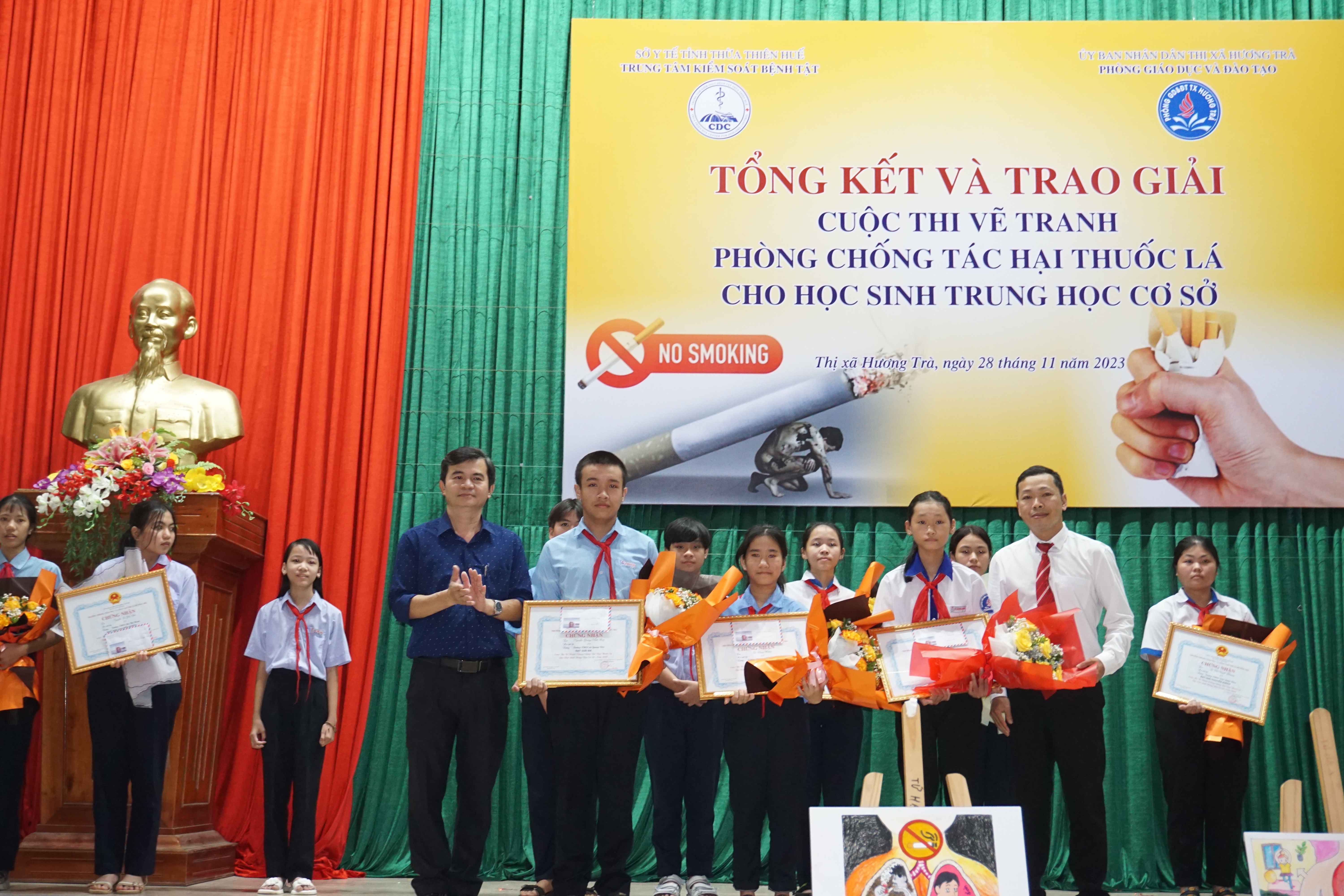 Sáng ngày 28/11/2023, Trung tâm KSBT tỉnh phối hợp với Phòng GDĐT thị xã Hương Trà tổ chức tổng kết trao giải Cuộc thi vẽ tranh Phòng chống tác hại thuốc lá cho học sinh THCS trên địa bàn. Cuộc thi nằm trong kế hoạch Chương trình Phòng chống tác hại thuốc lá năm 2023 được Quỹ Phòng, chống tác hại thuốc lá – Bộ Y tế hỗ trợ. Tham dự có ông Đỗ Ngọc An- Phó Chủ tịch UBND thị xã, lãnh đạo Trung tâm KSBT tỉnh, Khoa TTGDSK; lãnh đạo Phòng GDĐT, Trung tâm Y tế, đại diện BGH và học sinh các trường THCS và các đơn vị liên quan trên địa bàn thị xã Hương Trà.