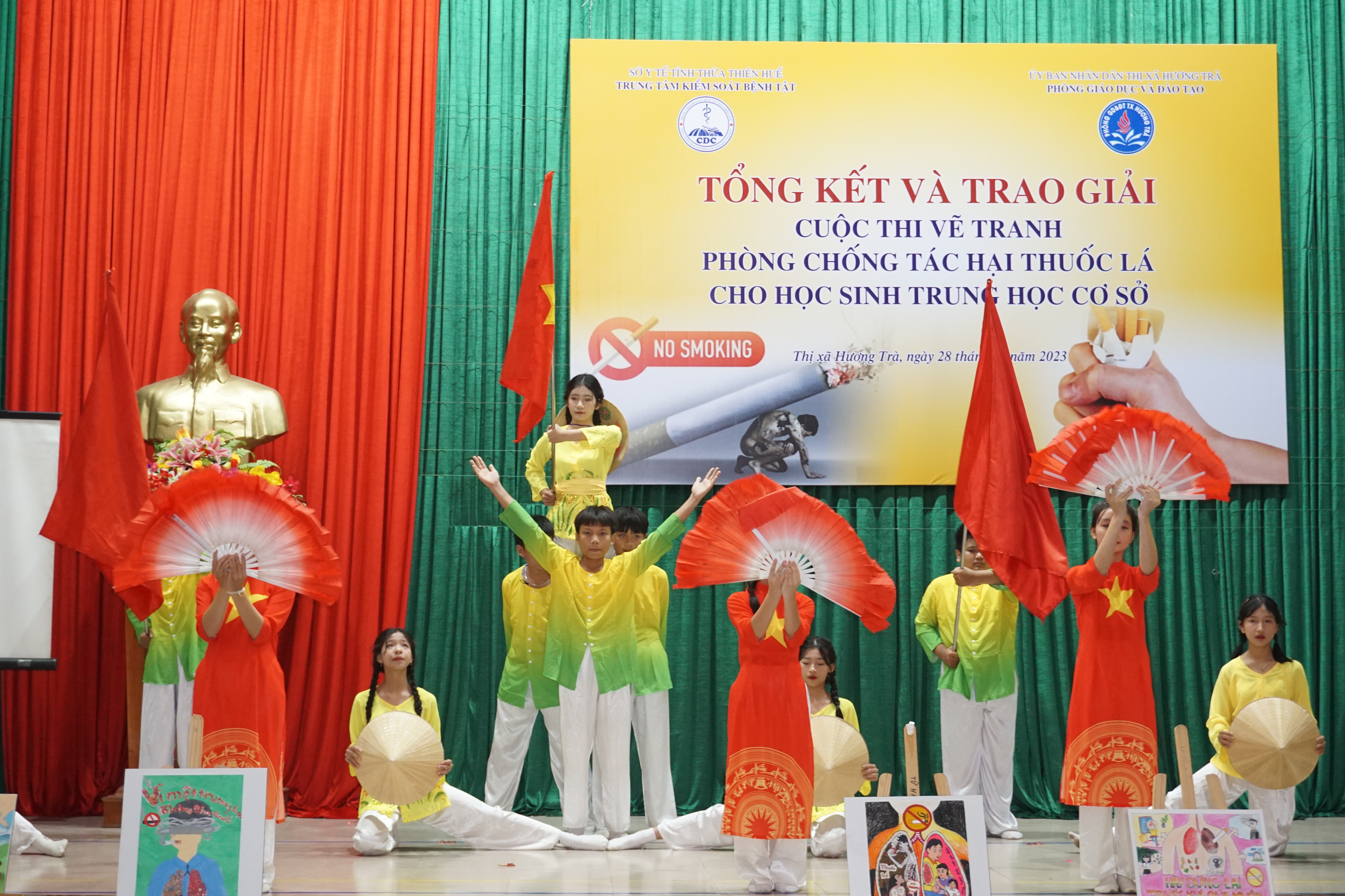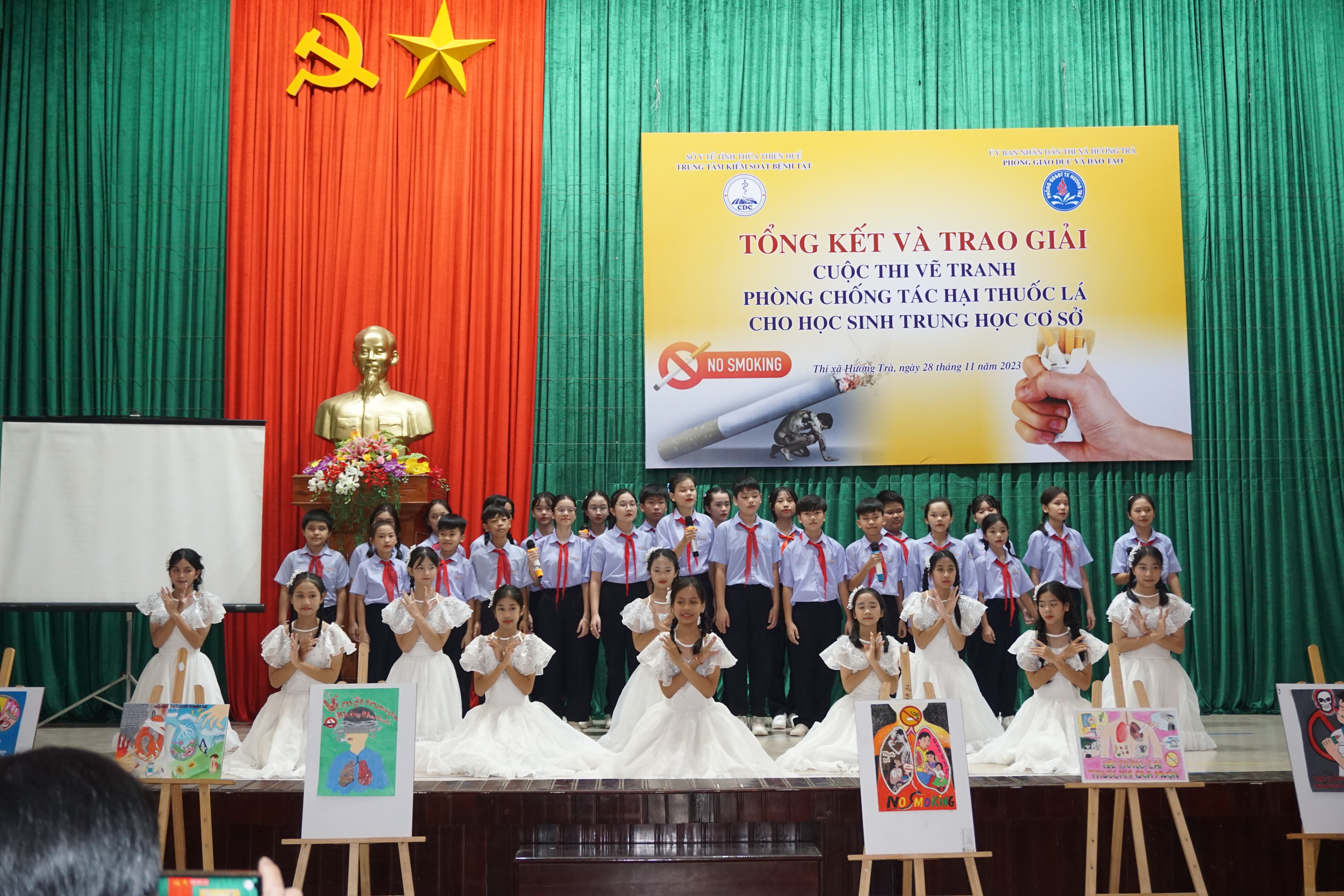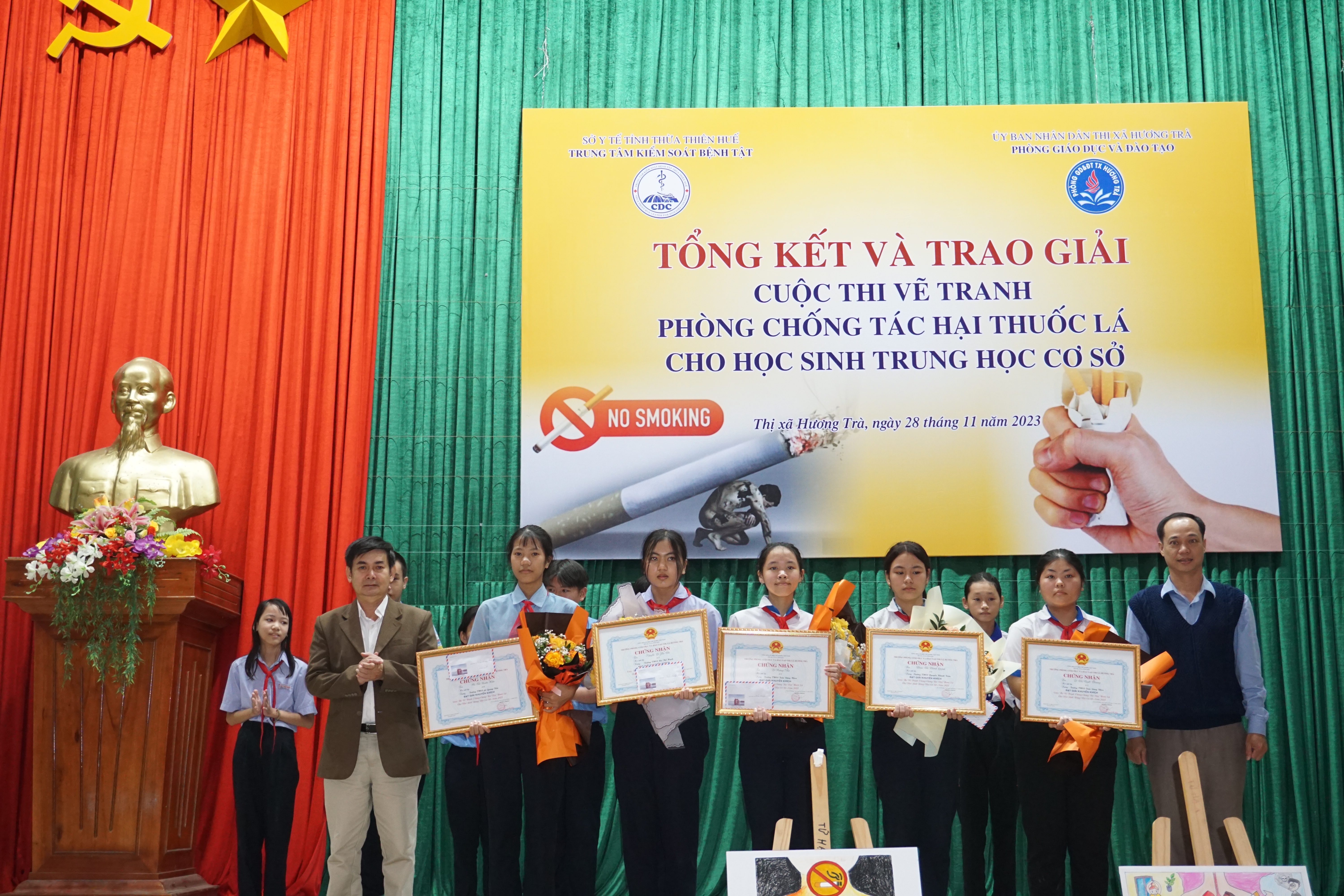 Sáng ngày 28/11/2023, Trung tâm KSBT tỉnh phối hợp với Phòng GDĐT thị xã Hương Trà tổ chức tổng kết trao giải Cuộc thi vẽ tranh Phòng chống tác hại thuốc lá cho học sinh THCS trên địa bàn. Cuộc thi nằm trong kế hoạch Chương trình Phòng chống tác hại thuốc lá năm 2023 được Quỹ Phòng, chống tác hại thuốc lá – Bộ Y tế hỗ trợ. Tham dự có ông Đỗ Ngọc An- Phó Chủ tịch UBND thị xã, lãnh đạo Trung tâm KSBT tỉnh, Khoa TTGDSK; lãnh đạo Phòng GDĐT, Trung tâm Y tế, đại diện BGH và học sinh các trường THCS và các đơn vị liên quan trên địa bàn thị xã Hương Trà.