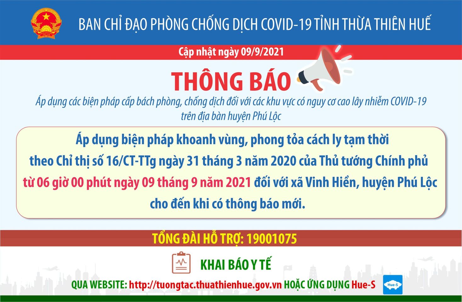 Thông báo áp dụng các biện pháp cấp bách phòng, chống dịch đối với các khu vực có nguy cơ cao lây nhiễm Covid-19 trên địa bàn huyện Phú Lộc Áp dụng biện pháp khoanh vùng, phong tỏa cách ly tạm thời theo Chỉ thị số 16/CT-TTg ngày 31 tháng 3 năm 2020 của Thủ tướng Chính phủ từ 06 giờ 00 phút ngày 09 tháng 9 năm 2021 đối với xã Vinh Hiền, huyện Phú Lộc cho đến khi có thông báo mới.