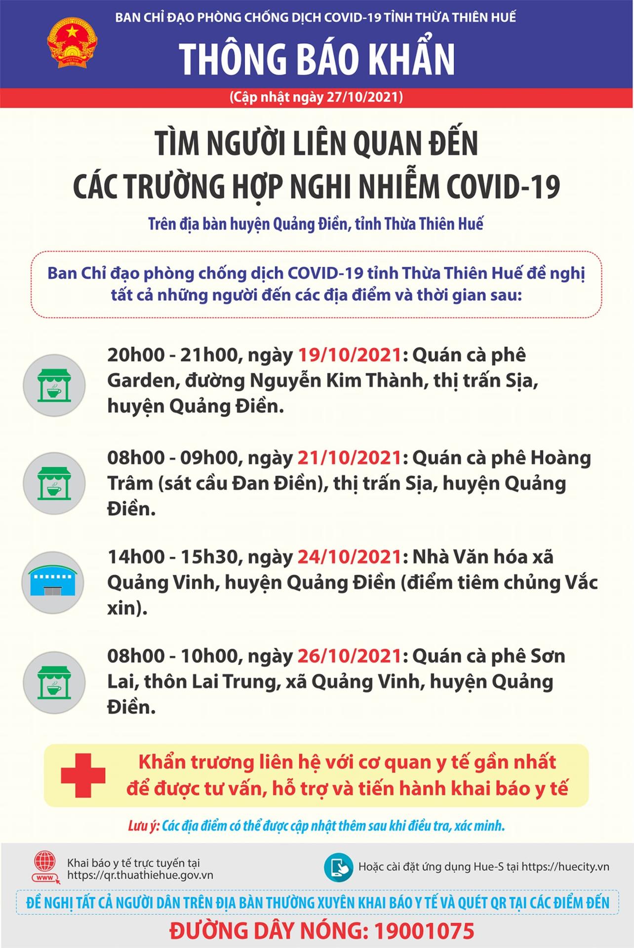 Thông báo khẩn tìm người liên quan đến các trường hợp nghi nhiễm COVID-19 trên địa bàn huyện Quảng Điền Ban Chỉ đạo phòng chống dịch COVID-19 tỉnh Thừa Thiên Huế đề nghị tất cả những người đến các địa điểm và thời gian sau: