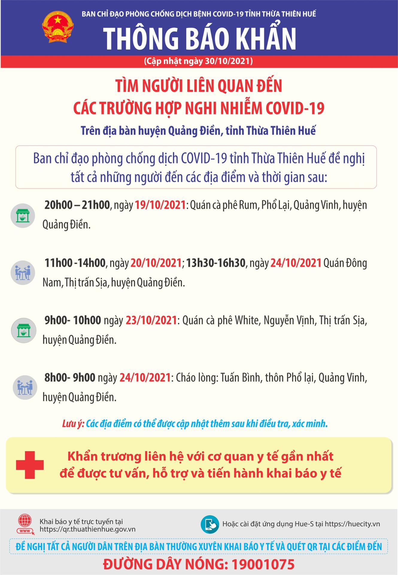 Thông báo khẩn tìm người liên quan đến các trường hợp nghi nhiễm COVID-19 trên địa bàn huyện Quảng Điền Ban Chỉ đạo phòng chống dịch COVID-19 tỉnh Thừa Thiên Huế đề nghị tất cả những người đến các địa điểm và thời gian sau: