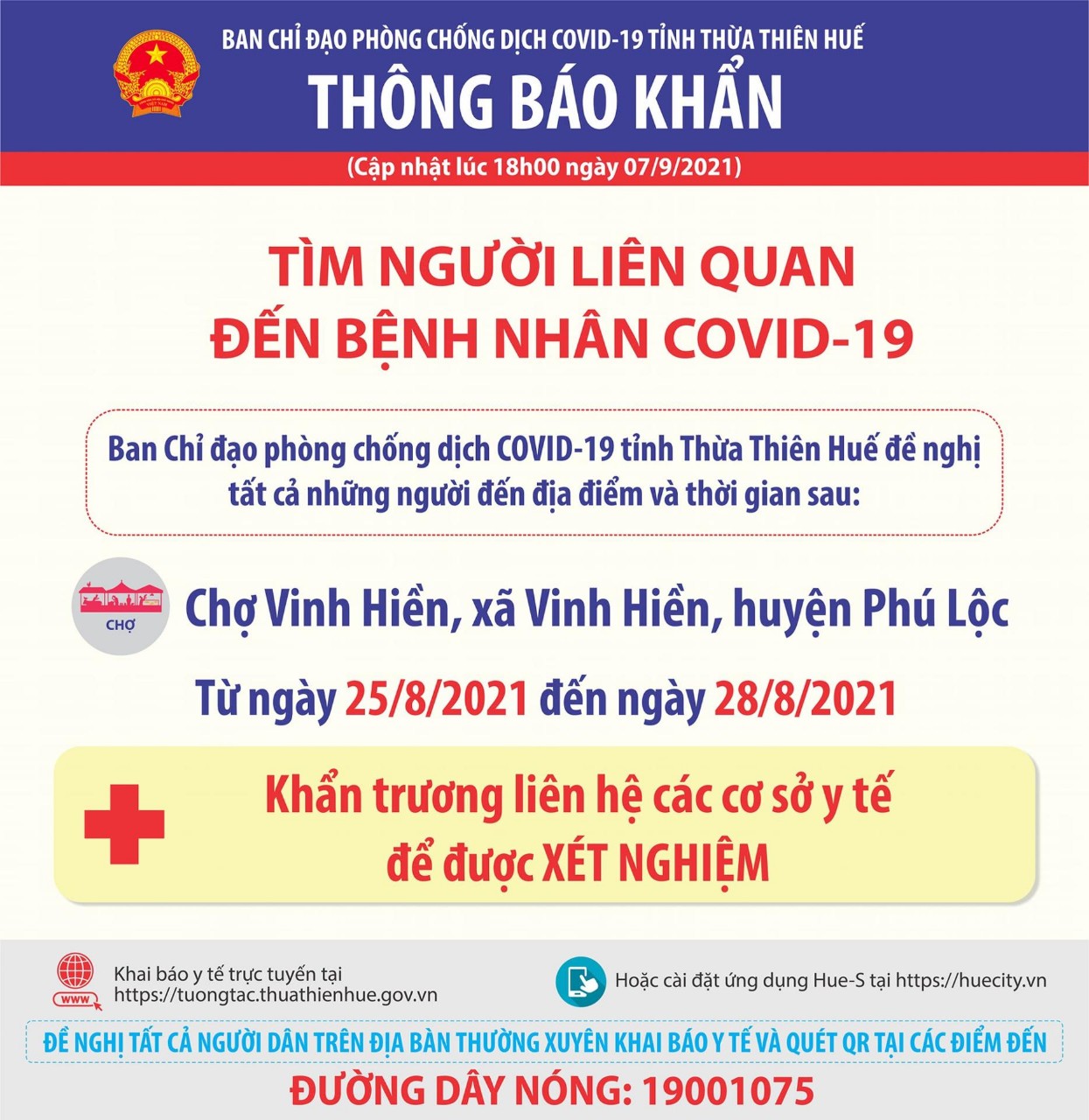 Thông báo khẩn ngày 07 tháng 9 năm 2021 của Ban chỉ đạo phòng chống dịch bệnh Covid-19 tỉnh Thừa Thiên Huế. Tìm người liên quan đến bệnh nhân COVID-19