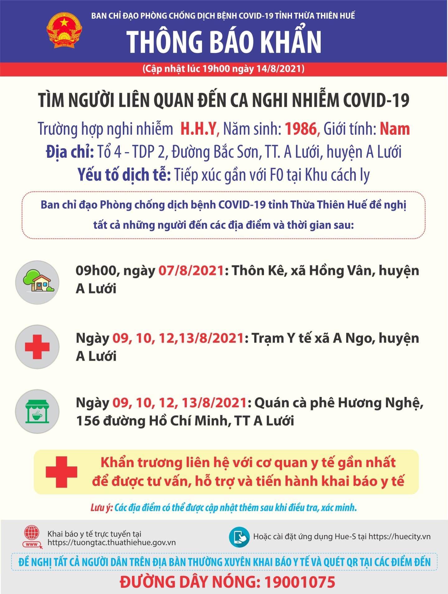 Thông báo khẩn tìm người liên quan đến ca nghi nhiễm Covid -19 ngày 14/8/2021