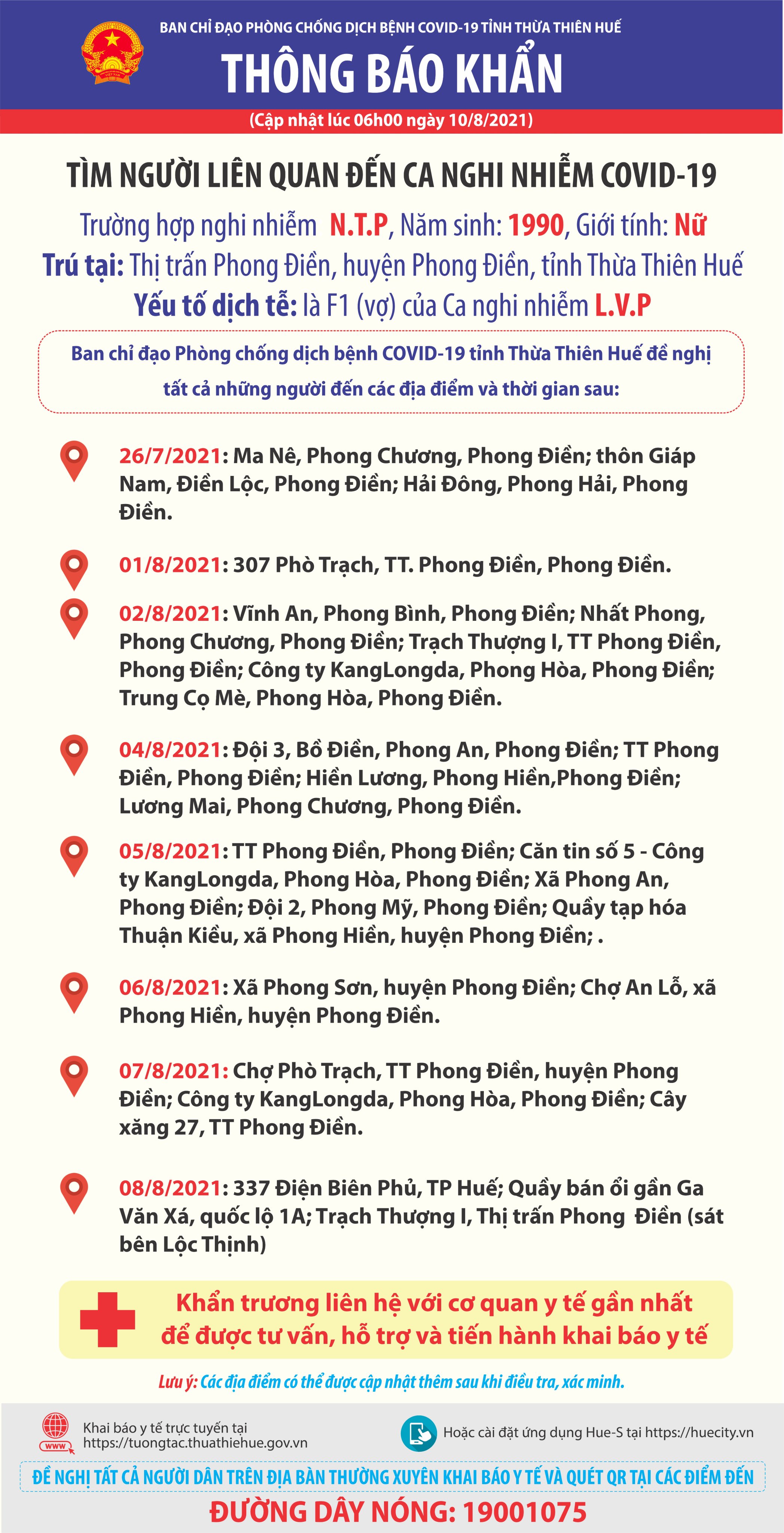 Thông báo khẩn ngày 10 tháng 8 năm 2021 của Ban chỉ đạo phòng chống dịch bệnh Covid-19 tỉnh Thừa Thiên Huế.