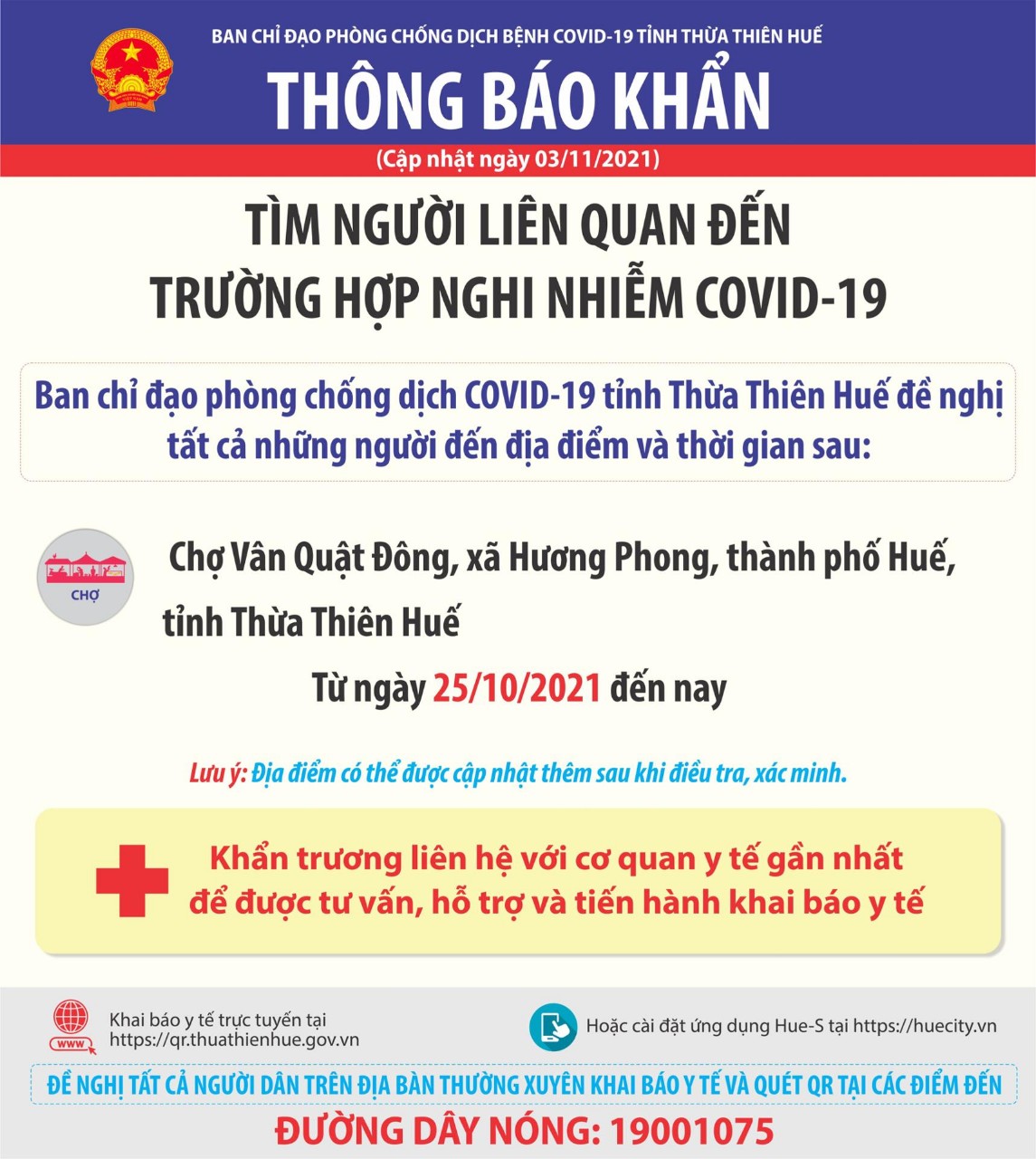 Ban Chỉ đạo phòng chống dịch COVID-19 tỉnh Thừa Thiên Huế đề nghị tất cả những người đến địa điểm và thời gian sau: Chợ Vân Quật Đông, xã Hương Phong, thành phố Huế, tỉnh Thừa Thiên Huế từ ngày 25/10/2021 đến nay Khẩn trương liên hệ với cơ quan y tế gần nhất để được tư vấn, hỗ trợ và tiến hành khai báo y tế. Tổng đài hỗ trợ: 19001075