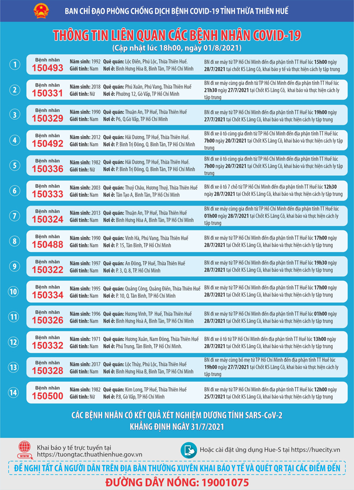Thông báo của Ban chỉ đạo phòng chống dịch bệnh Covid-19 tỉnh Thừa Thiên Huế ( cập nhật lúc 18 giờ ngày 01 tháng 8 năm 2021) Thông tin liên quan các bệnh nhân Covid-19