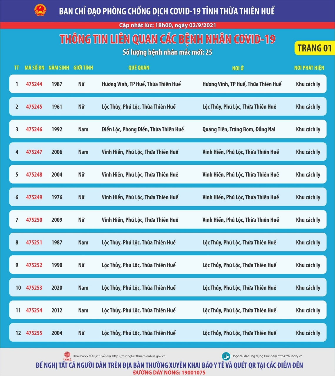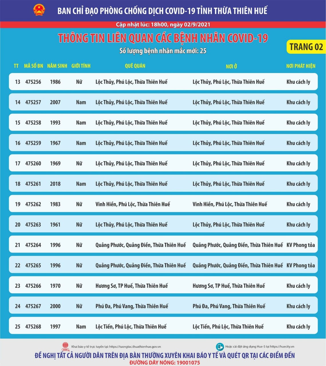 Thông báo của Ban chỉ đạo phòng chống dịch bệnh Covid-19 tỉnh Thừa Thiên Huế ( cập nhật lúc 18 giờ ngày 02 tháng 9 năm 2021) . Thông tin liên quan các bệnh nhân Covid-19 Số lượng bệnh nhân mắc mới : 25