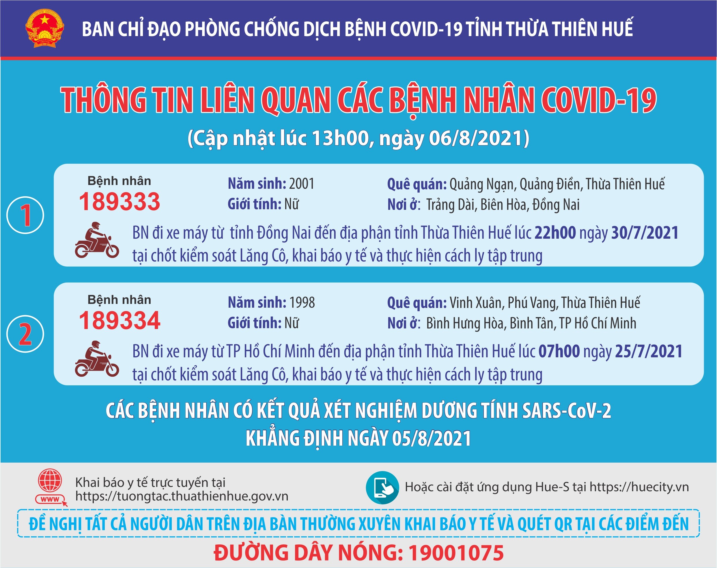 Thông báo của Ban chỉ đạo phòng chống dịch bệnh Covid-19 tỉnh Thừa Thiên Huế ( cập nhật lúc 13 giờ ngày 06 tháng 8 năm 2021) Thông tin liên quan các bệnh nhân Covid-19