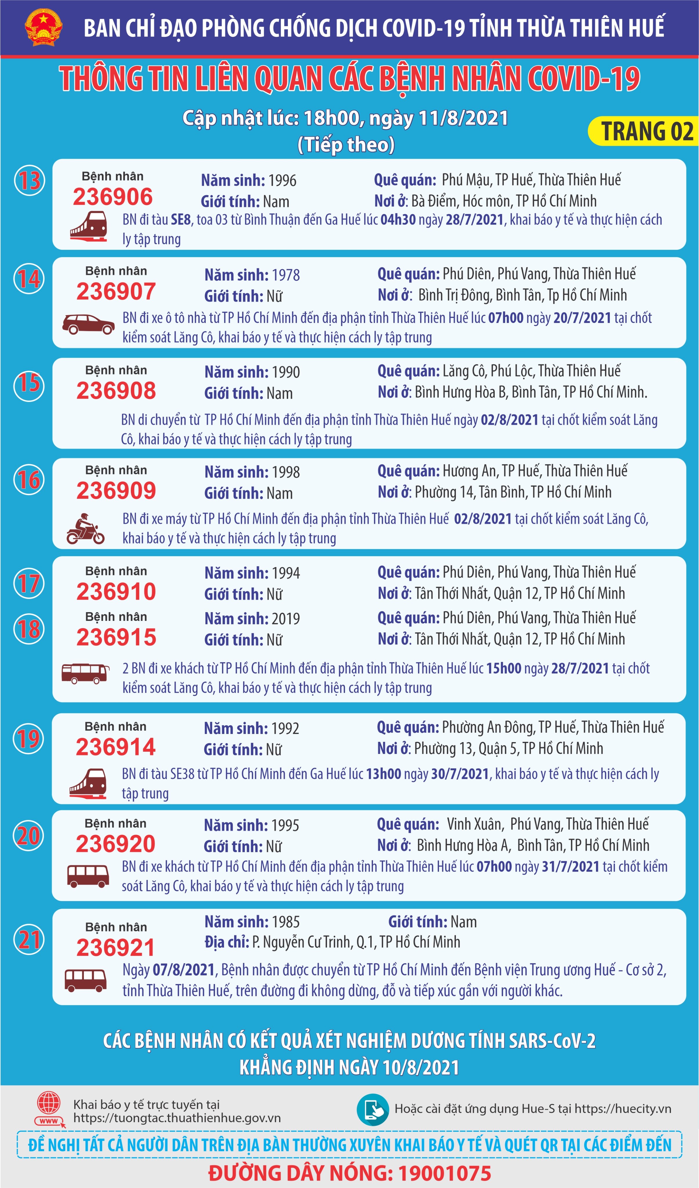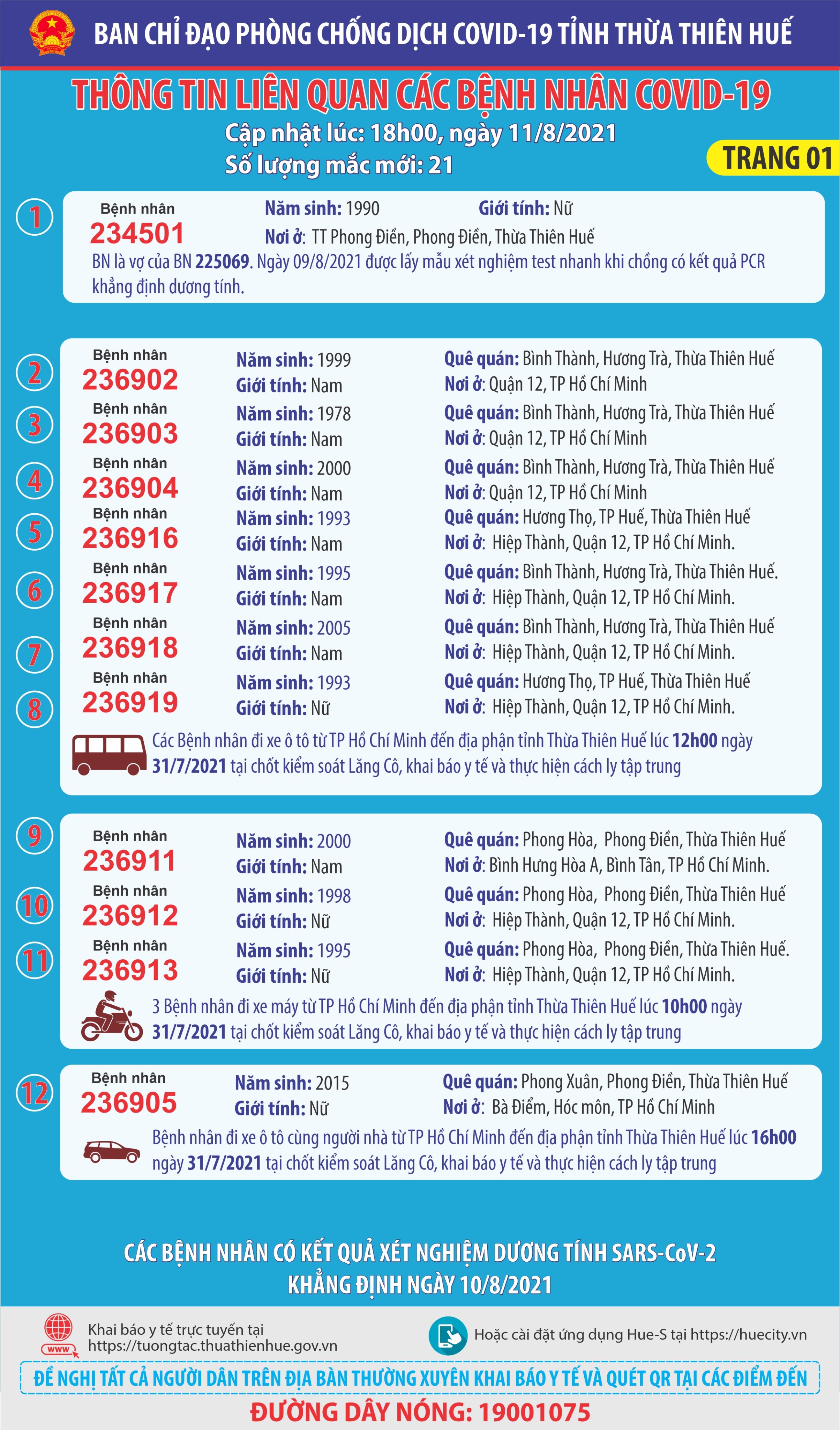 Thông báo của Ban chỉ đạo phòng chống dịch bệnh Covid-19 tỉnh Thừa Thiên Huế ( cập nhật lúc 18 giờ ngày 09 tháng 8 năm 2021) Thông tin liên quan 10 bệnh nhân Covid-19