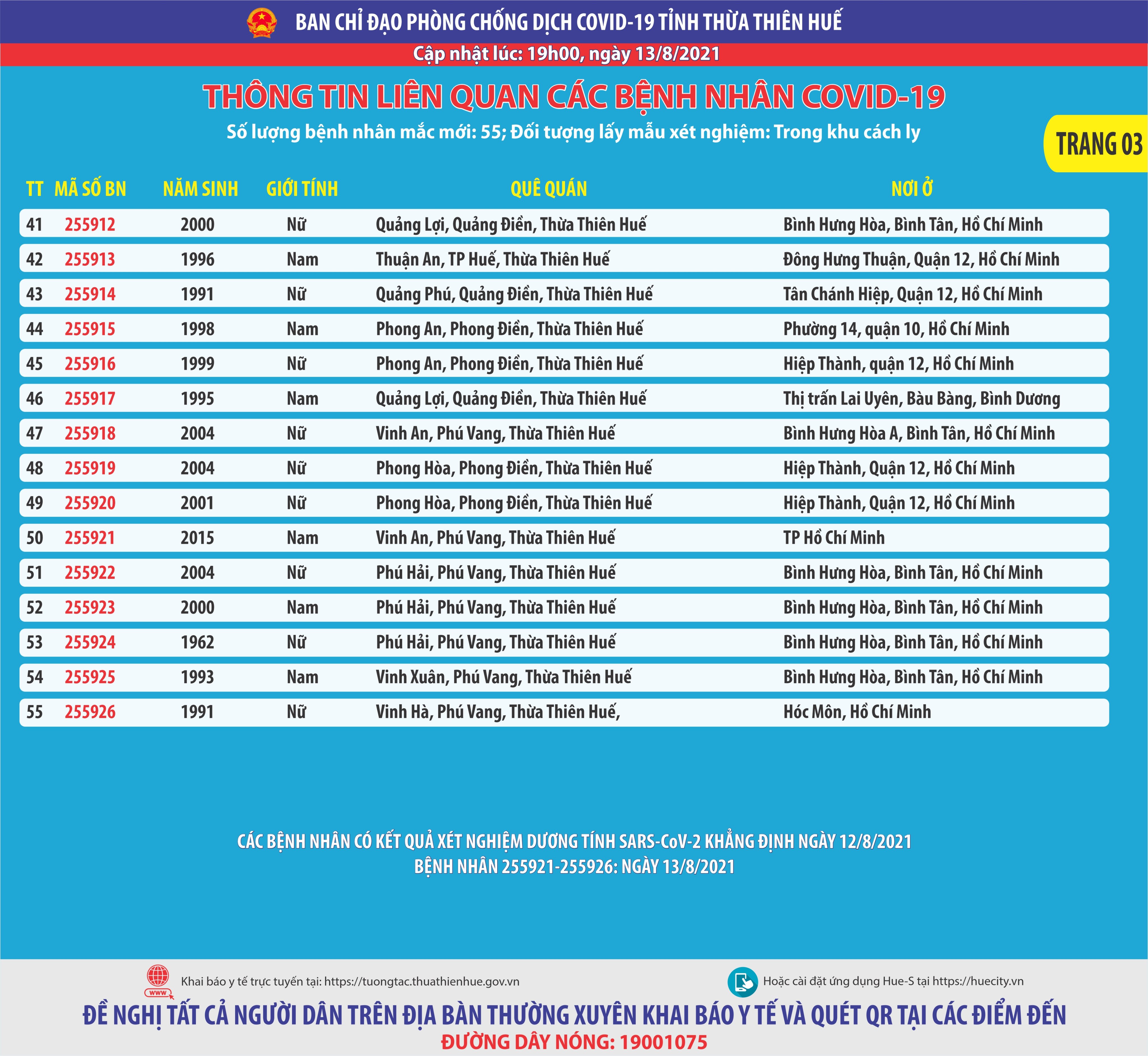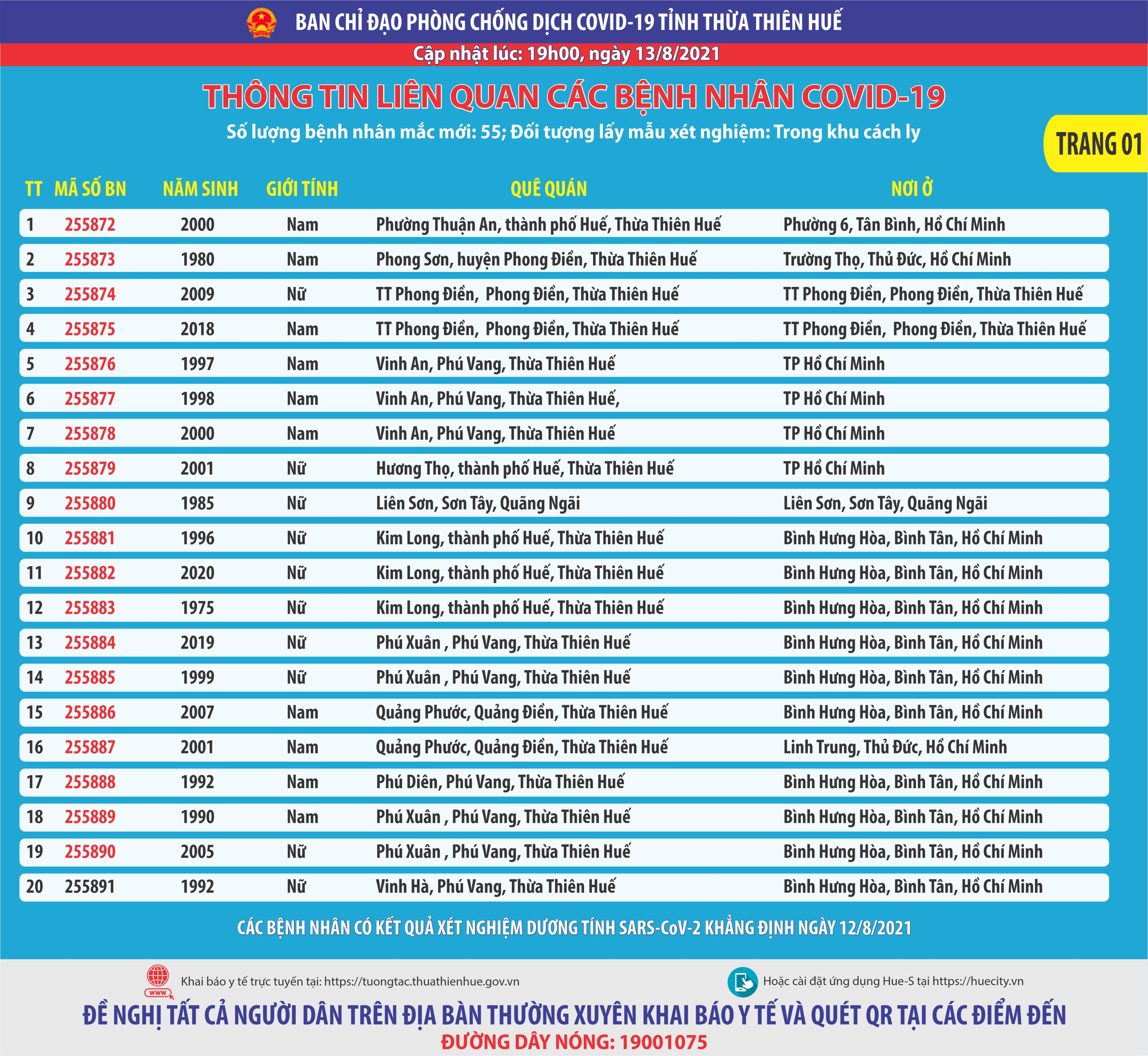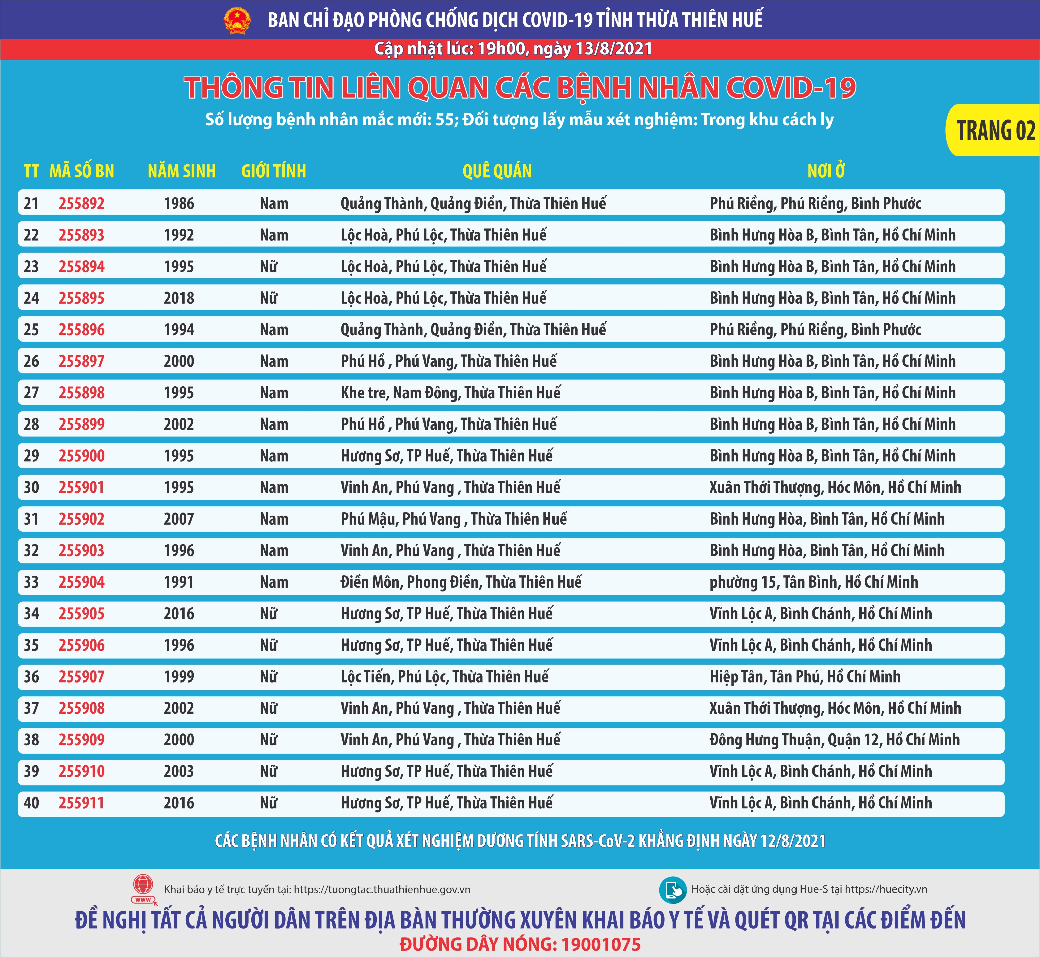 Thông báo của Ban chỉ đạo phòng chống dịch bệnh Covid-19 tỉnh Thừa Thiên Huế ( cập nhật lúc 19 giờ ngày 13 tháng 8 năm 2021) . Thông tin llên quan các bệnh nhân Covid-19 Số lượng bệnh nhân mắc mới 55; Đối tượng lấy mẫu xét nghiệm: trong khu cách ly