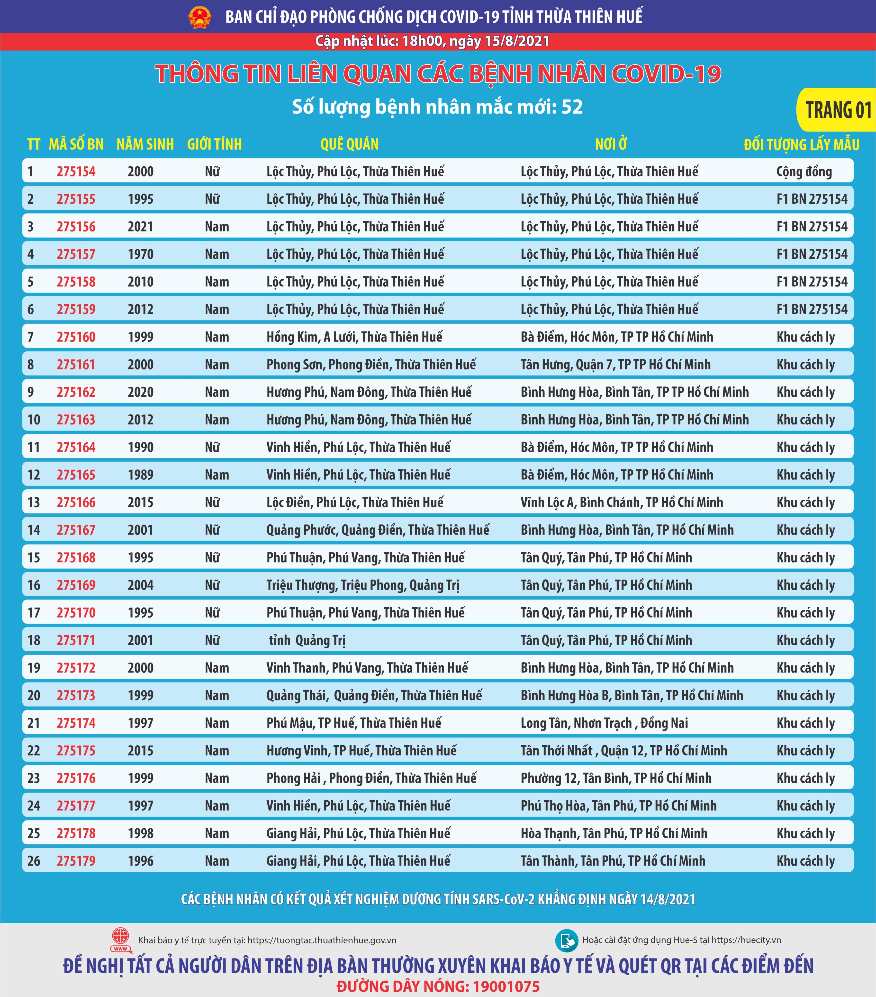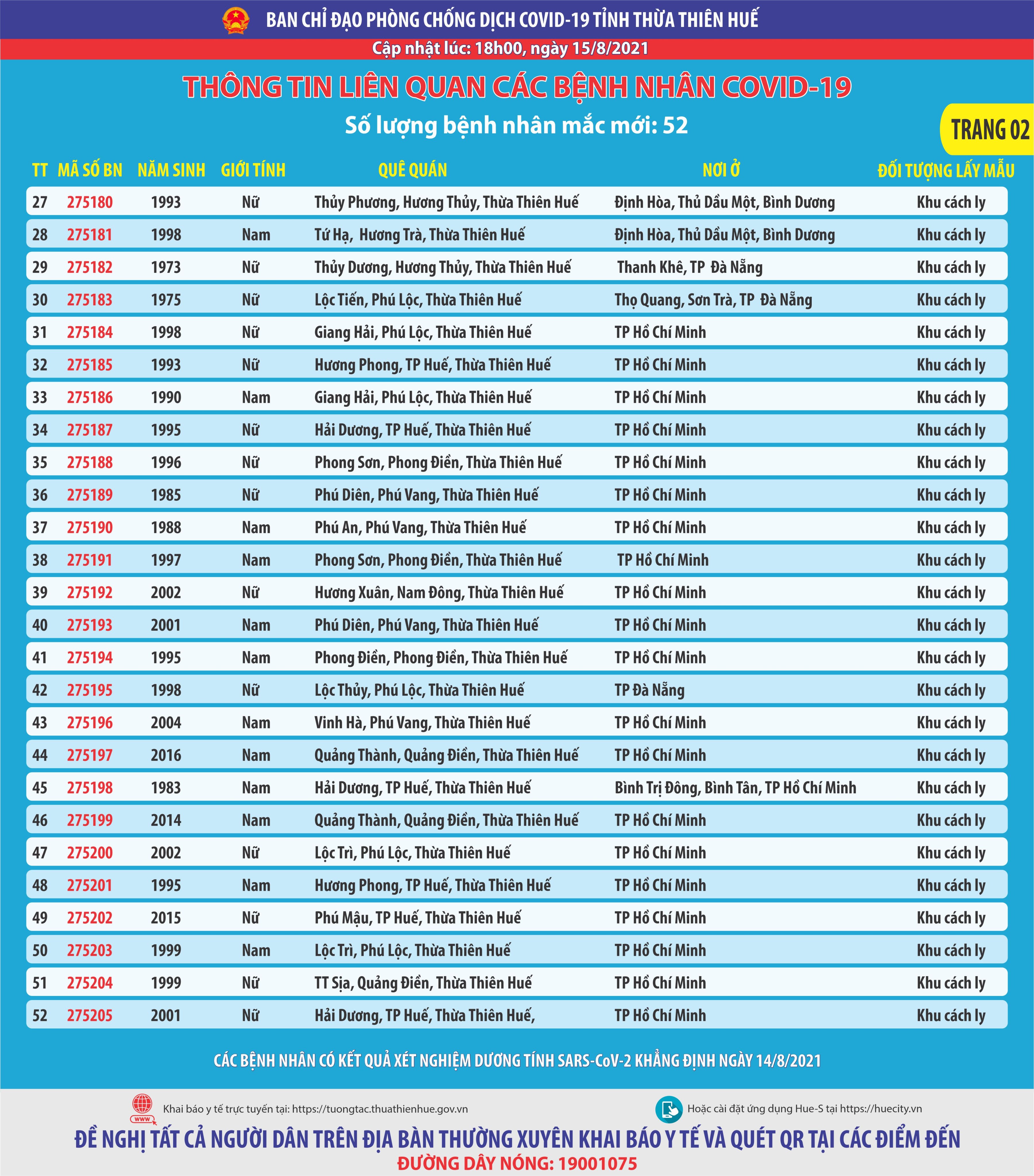 Thông báo của Ban chỉ đạo phòng chống dịch bệnh Covid-19 tỉnh Thừa Thiên Huế ( cập nhật lúc 18 giờ ngày 15 tháng 8 năm 2021) . Thông tin llên quan các bệnh nhân Covid-19 Số lượng bệnh nhân mắc mới 52.