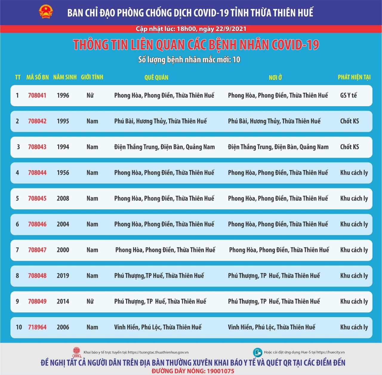 Thông báo của Ban chỉ đạo phòng chống dịch bệnh Covid-19 tỉnh Thừa Thiên Huế ( cập nhật lúc 18 giờ 00 ngày 22 tháng 9 năm 2021) . Thông tin liên quan các bệnh nhân Covid-19 Số lượng bệnh nhân mắc mới : 10