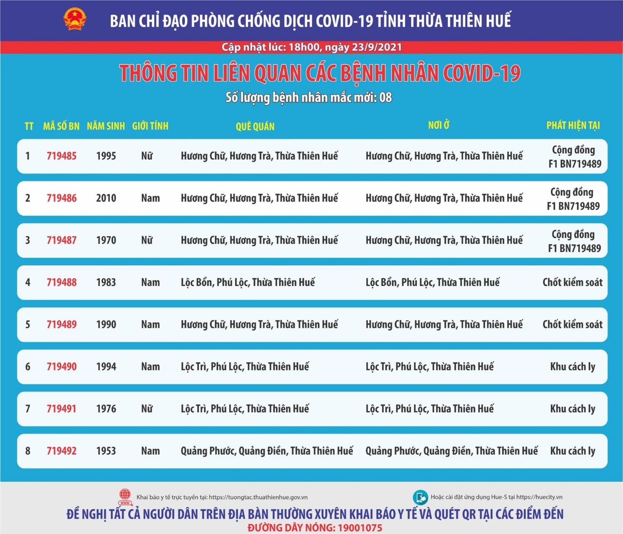 Thông báo của Ban chỉ đạo phòng chống dịch bệnh Covid-19 tỉnh Thừa Thiên Huế ( cập nhật lúc 18 giờ 00 ngày 23 tháng 9 năm 2021) . Thông tin liên quan các bệnh nhân Covid-19 Số lượng bệnh nhân mắc mới : 08
