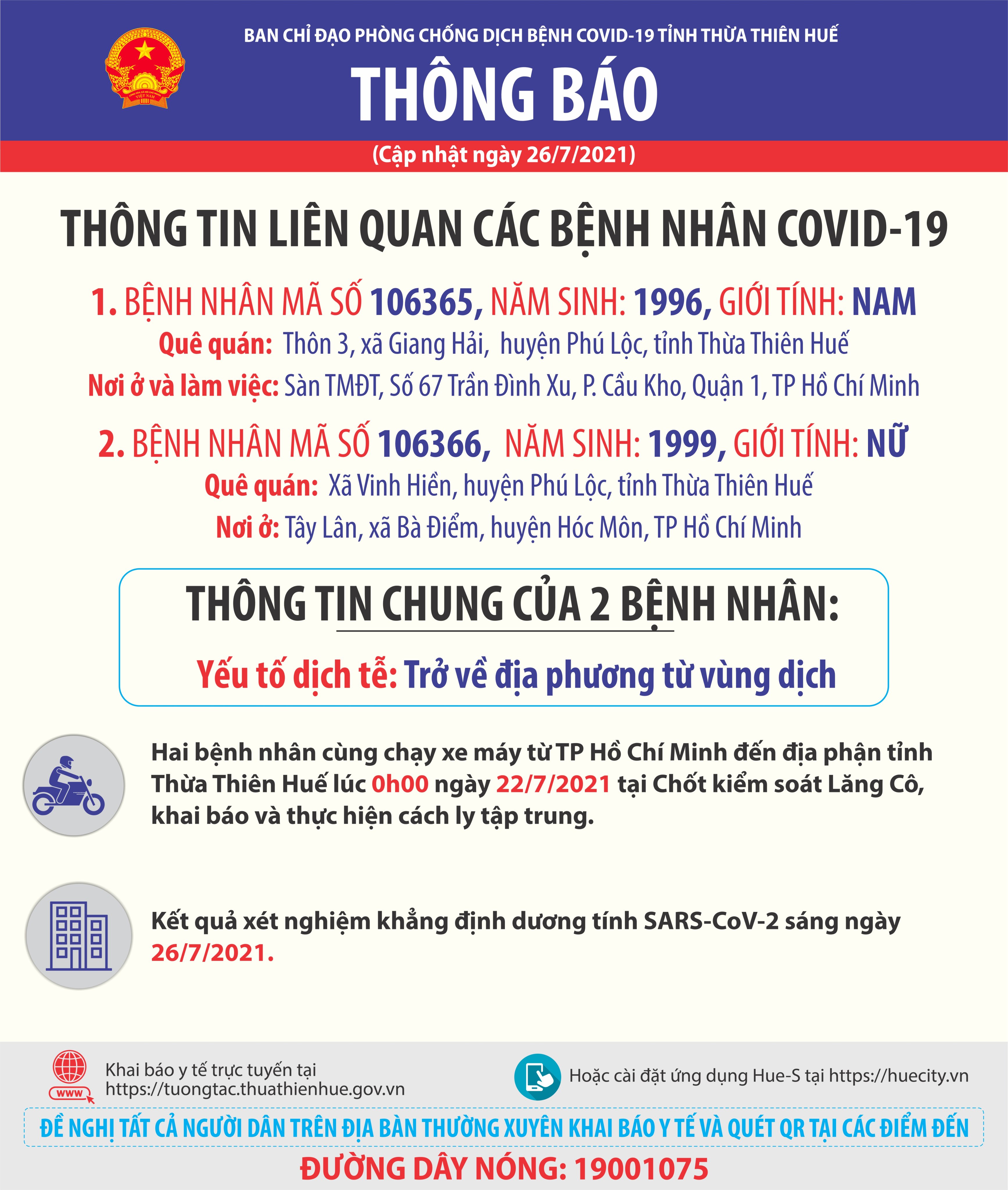Thông báo ngày 26 tháng 7 năm 2021 của Ban chỉ đạo phòng chống dịch bệnh Covid-19 tỉnh Thừa Thiên Huế. Thông tin liên quan các bệnh nhân Covid-19