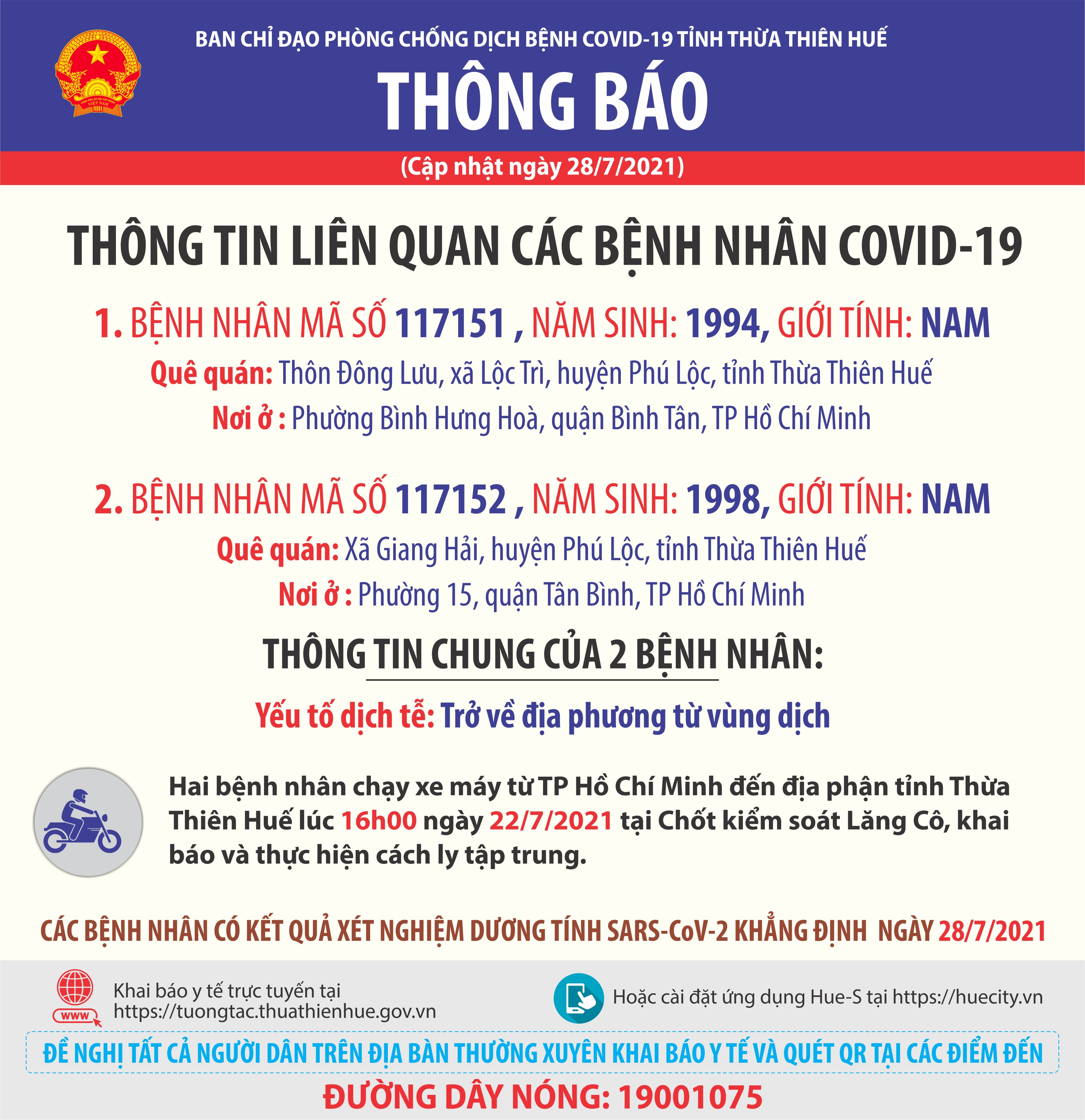 Thông báo ngày 28 tháng 7 năm 2021 của Ban chỉ đạo phòng chống dịch bệnh Covid-19 tỉnh Thừa Thiên Huế. Thông tin liên quan các bệnh nhân Covid-19