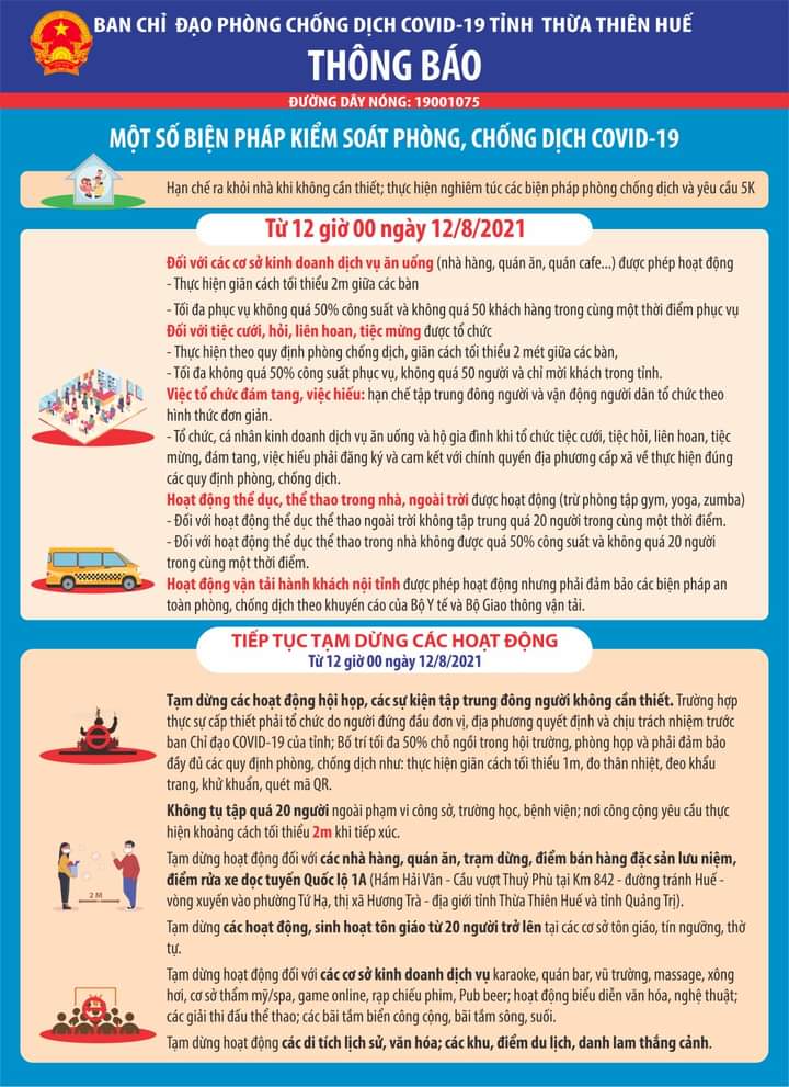 Thông báo của Ban chỉ đạo phòng chống dịch bệnh Covid-19 tỉnh Thừa Thiên Huế về Một số biện pháp kiểm soát phòng, chống dịch Covid-19