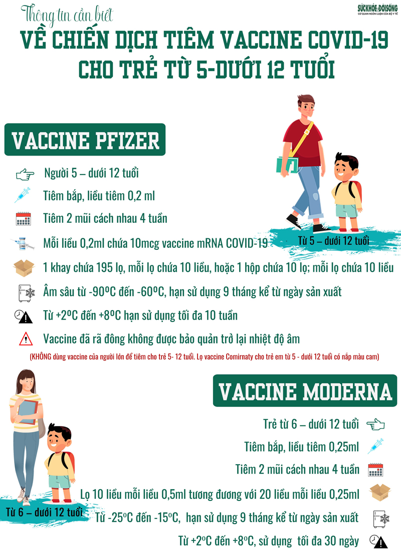 Theo Bộ Y tế khoảng đầu tháng 4/2022, sẽ triển khai tiêm vaccine phòng COVID-19 cho trẻ từ 5 - dưới 12 tuổi. Có 2 loại vaccine được quyết định tiêm cho trẻ trong độ tuổi này là: Vaccine Moderna và Vaccine Pfizer. Tuy nhiên, về liều tiêm mỗi mũi của 2 loại vaccine khác nhau, lứa tuổi tiêm cũng có sự khác biệt. Sau đây là những thông tin về 2 loại vaccin này.