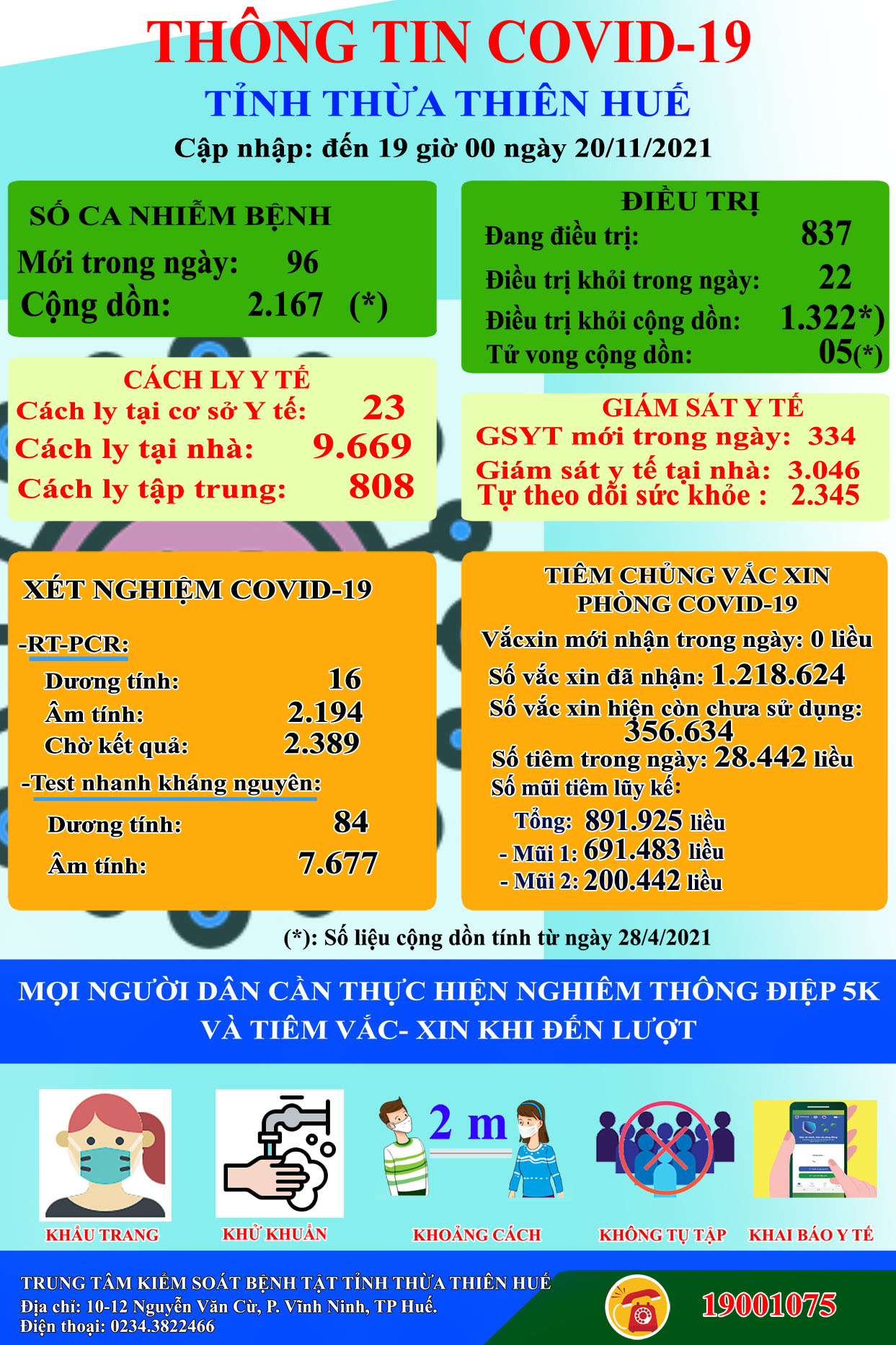 Kết quả đến 18h00 ngày 20/11/2021, tỉnh Thừa Thiên Huế ghi nhận thêm 96 ca bệnh khẳng định dương tính SARS-CoV-2.Trong đó, phát hiện tại khu cách ly tập trung (KCL): 27; khu phong toả (KPT): 12; tại cộng đồng: 57 (trong đó, F1 đang thực hiện cách ly tại nhà (F1 CLTN): 14; sàng lọc tại cơ sở y tế (CSYT): 03, tất cả được đưa vào khu cách ly y tế ngay sau khi phát hiện).