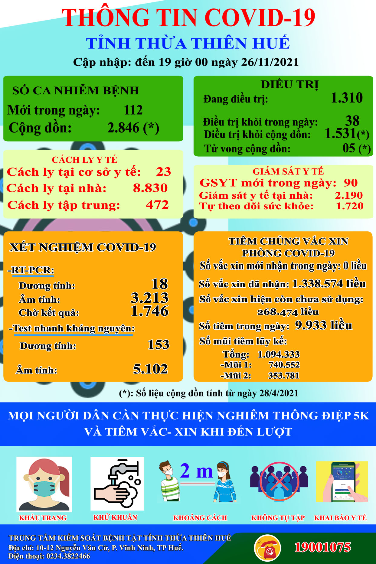 Kết quả đến 18h00 ngày 26/11/2021, tỉnh Thừa Thiên Huế ghi nhận thêm 112 ca bệnh khẳng định dương tính SARS-CoV-2.Trong đó, phát hiện tại khu cách ly tập trung (KCL): 07; khu phong tỏa (KPT): 07; giám sát y tế (GSYT) tại nhà: 06; F1 đang thực hiện cách ly tại nhà (F1 CLTN): 32; tại cộng đồng: 60 (tất cả được đưa vào khu cách ly y tế ngay sau khi phát hiện).