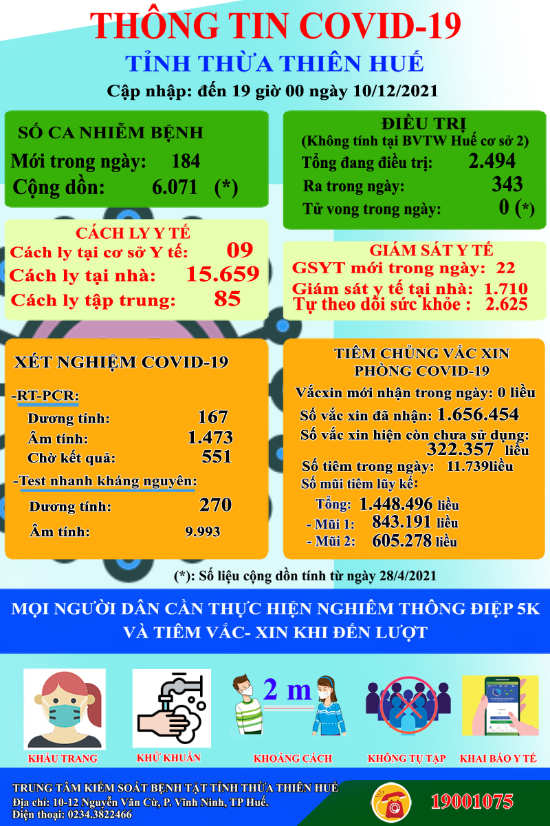 Kết quả đến 18h00 ngày 10/12/2021, test nhanh trong ngày phát hiện thêm 270 mẫu dương tính. Trong ngày tỉnh Thừa Thiên Huế ghi nhận thêm 184 ca bệnh khẳng định dương tính SARS-CoV-2 có mã bệnh của Bộ Y tế. Trong đó, phát hiện tại khu cách ly tập trung (KCL): 04; khu phong tỏa (KPT): 02; chốt kiểm soát y tế: 02; giám sát y tế tại nhà: 02; F1 đang thực hiện cách ly tại nhà (F1 CLTN): 93; tại cộng đồng: 81 (tất cả được đưa vào khu cách ly y tế ngay sau khi phát hiện).