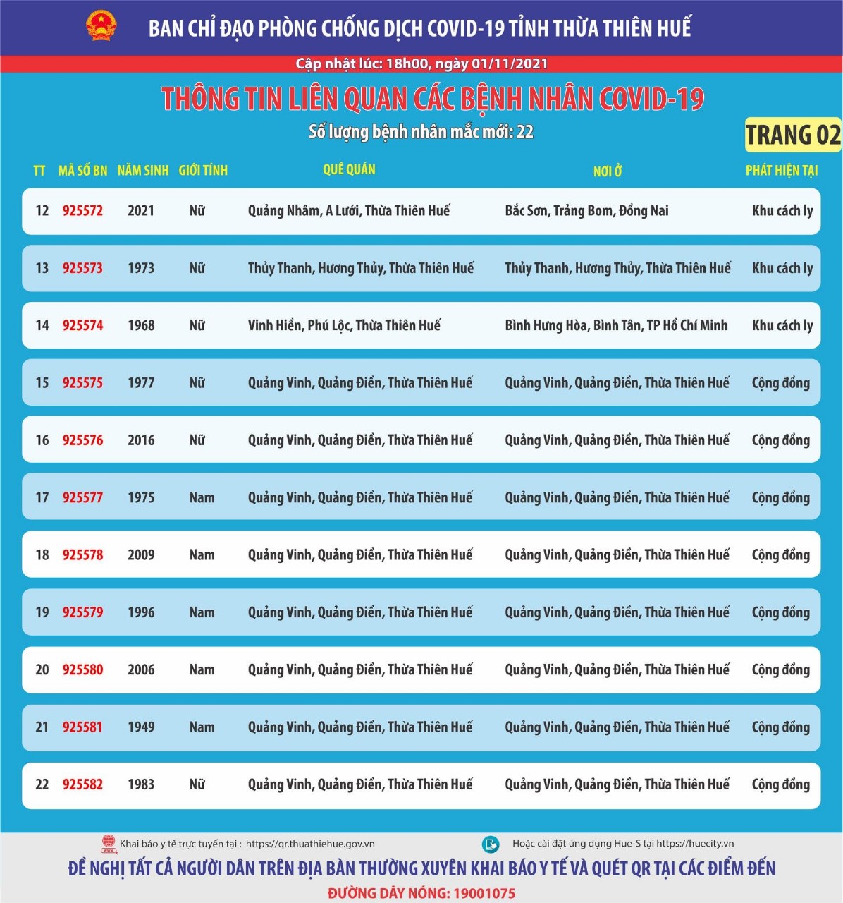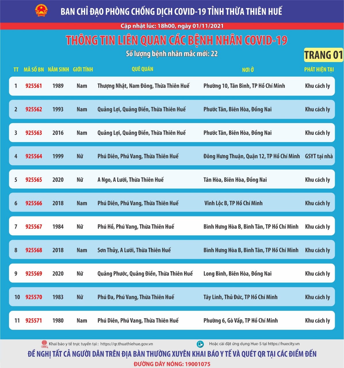 Ban chỉ đạo phòng chống dịch Covid-19 tỉnh Thừa Thiên Huế thông tin liên quan đến các bệnh nhân mắc Covid-19 (cập nhật lúc 18 giờ ngày 01 tháng 11 năm 2021) Số lượng bệnh nhân mắc mới : 22