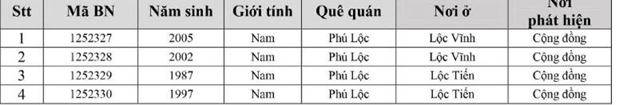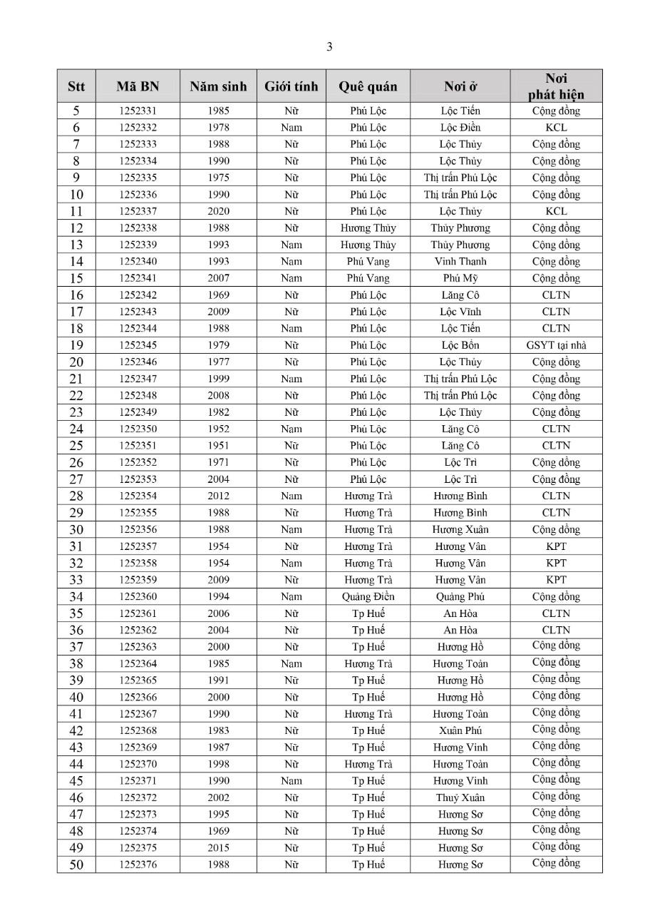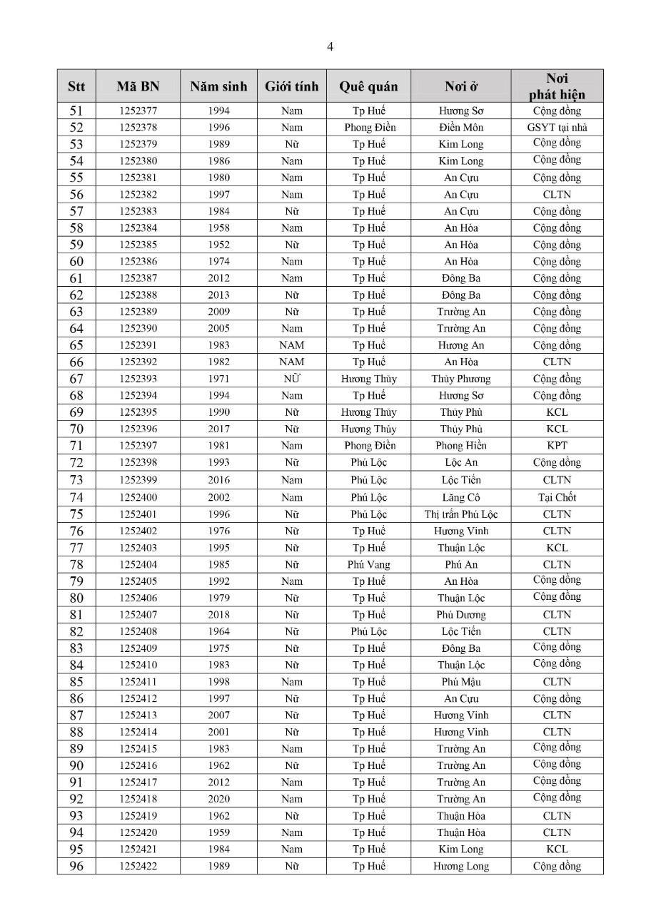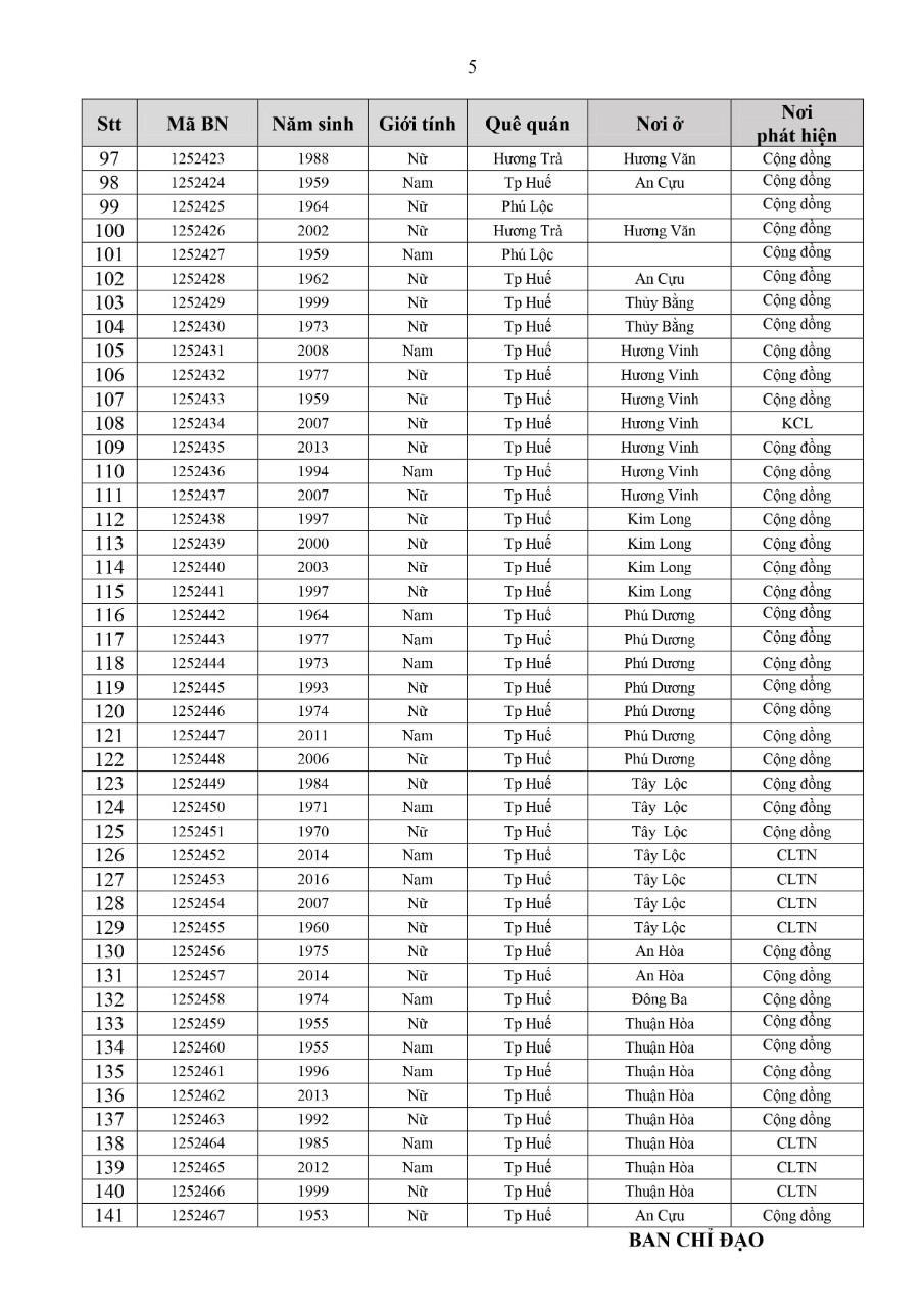 Kết quả đến 18h00 ngày 01/12/2021, tỉnh Thừa Thiên Huế ghi nhận thêm 141 ca bệnh khẳng định dương tính SARS-CoV-2. Trong đó, phát hiện tại khu cách ly tập trung (KCL): 07; khu phong tỏa (KPT): 04; F1 đang thực hiện cách ly tại nhà (CLTN): 29; người từ vùng dịch về giám sát y tế tại nhà (GSYTTN): 02; tại Chốt kiểm soát y tế: 01; tại cộng đồng: 98 (tất cả được đưa vào khu cách ly y tế ngay sau khi phát hiện).