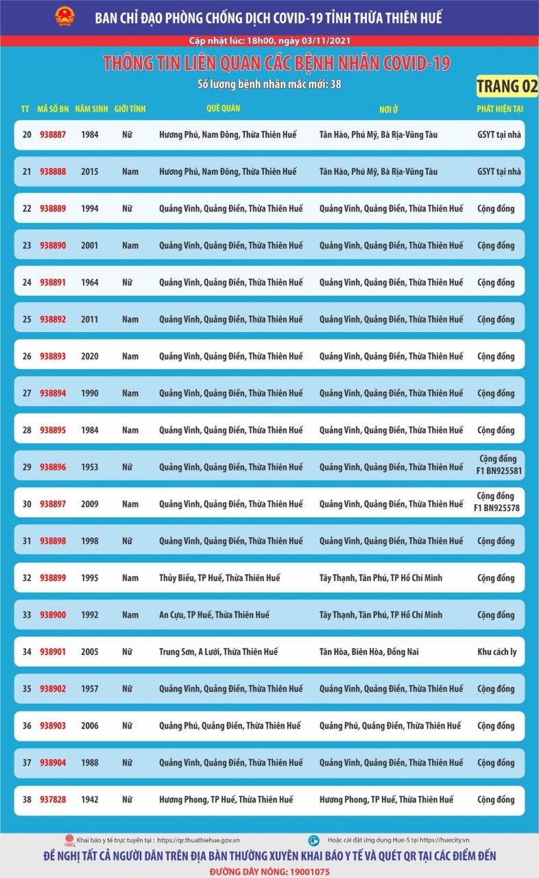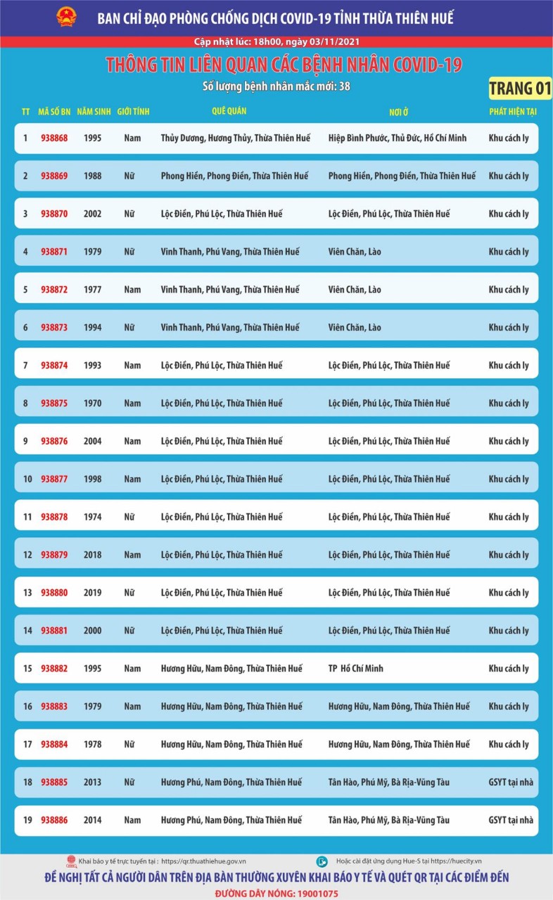 Ban chỉ đạo phòng chống dịch Covid-19 tỉnh Thừa Thiên Huế thông tin liên quan đến các bệnh nhân mắc Covid-19 (cập nhật lúc 18 giờ ngày 03 tháng 11 năm 2021) Số lượng bệnh nhân mắc mới: 38