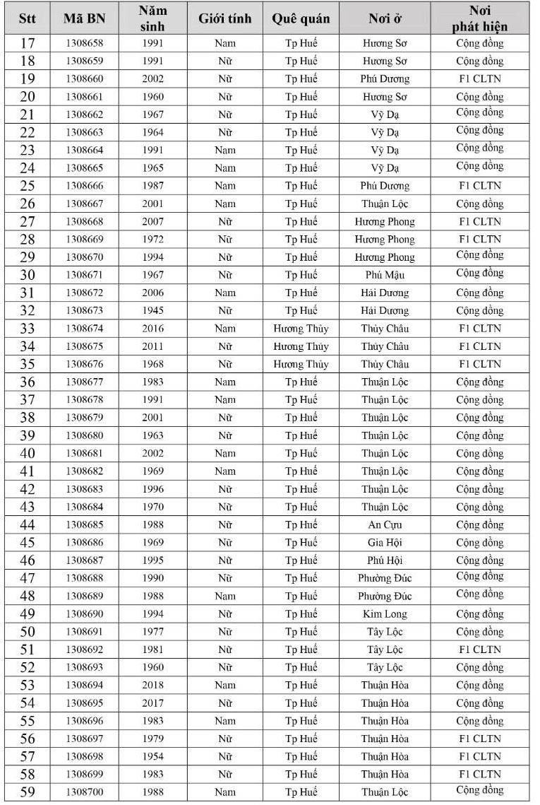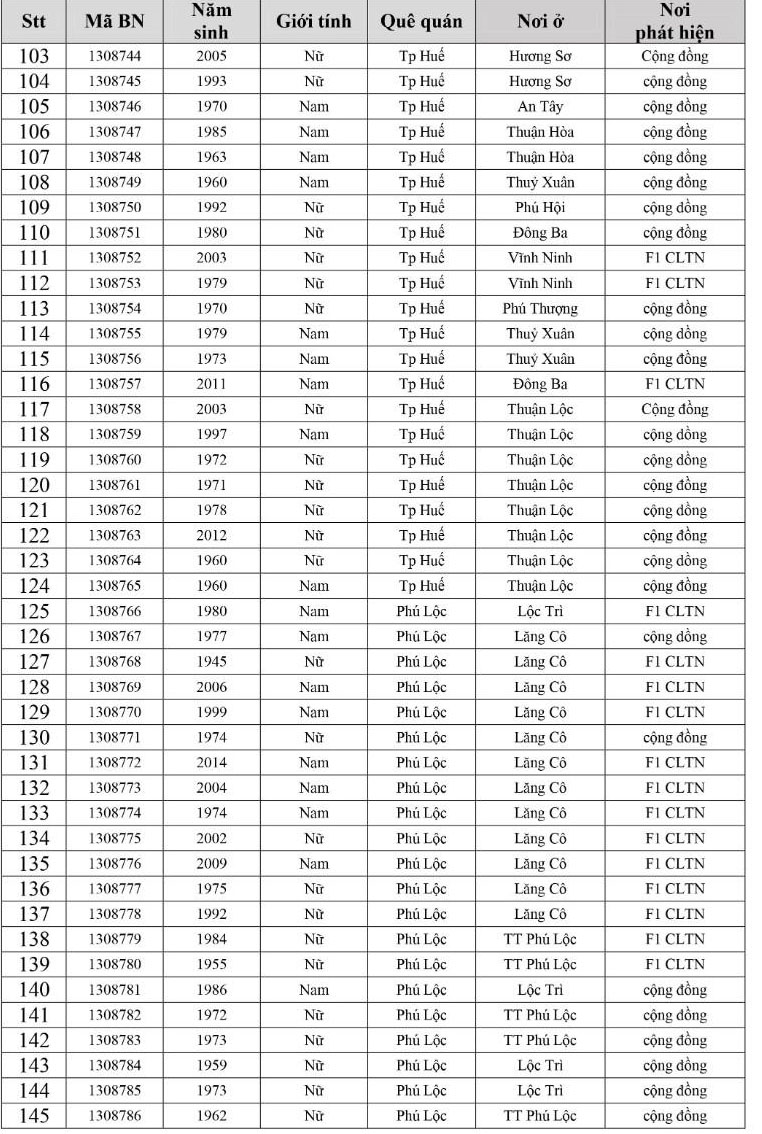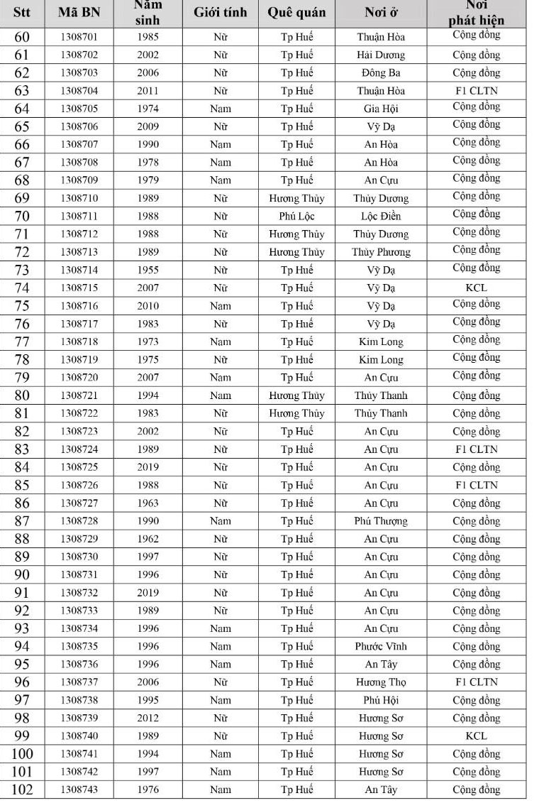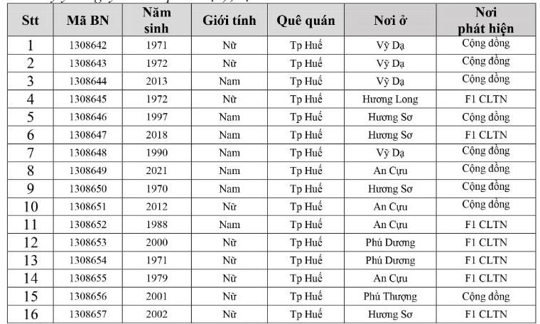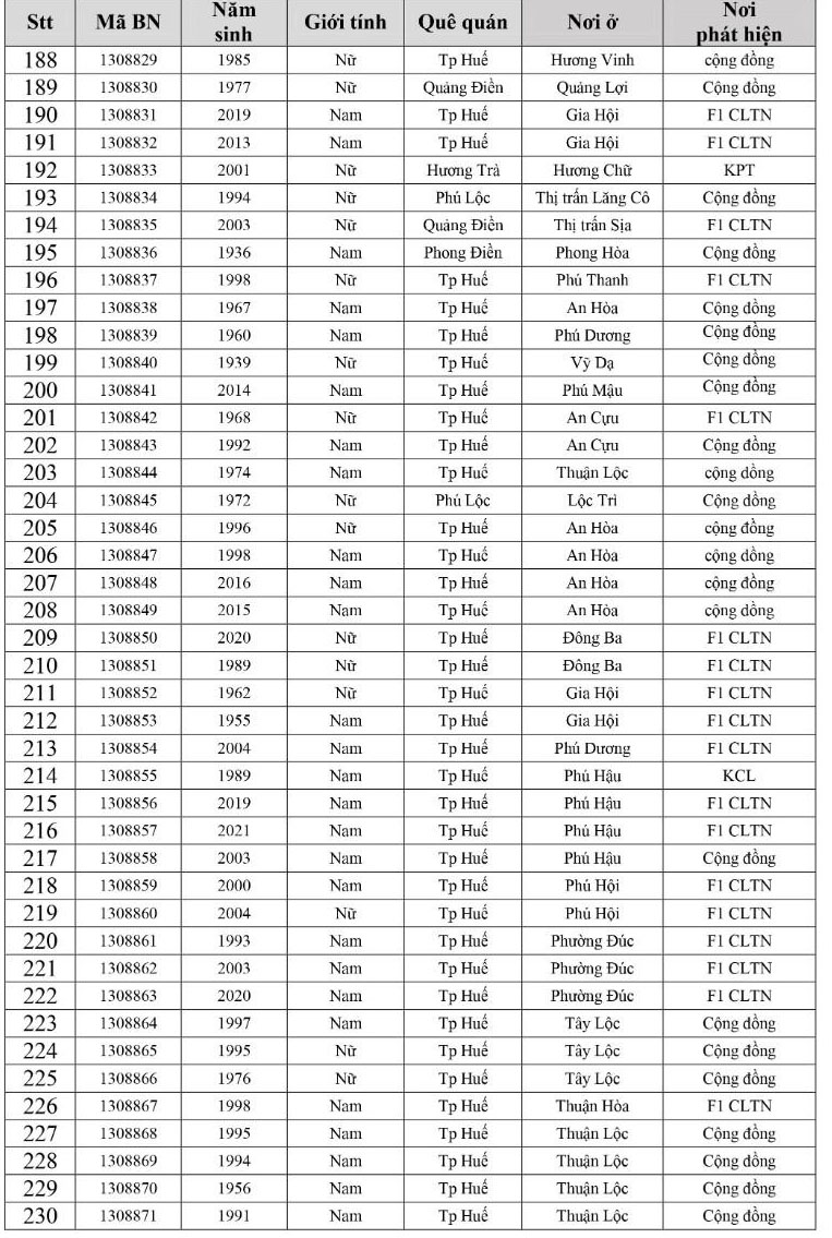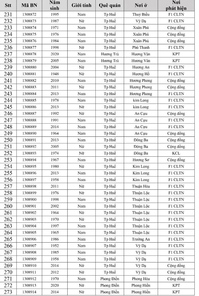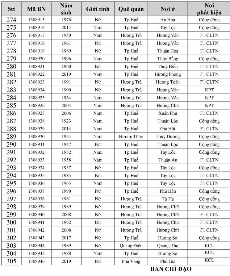 Kết quả đến 18h00 ngày 05/12/2021, tỉnh Thừa Thiên Huế ghi nhận thêm 305 ca bệnh khẳng định dương tính SARS-CoV-2. Trong đó, phát hiện tại khu cách ly tập trung (KCL): 10; Khu phong toả: 11; tại Chốt kiểm soát y tế: 01; F1 đang thực hiện cách ly tại nhà (F1 CLTN): 112; tại cộng đồng: 171 (tất cả được đưa vào khu cách ly y tế ngay sau khi phát hiện).