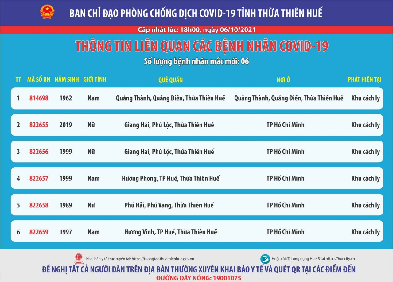 Ban chỉ đạo phòng chống dịch Covid-19 tỉnh Thừa Thiên Huế thông tin liên quan đến các bệnh nhân mắc Covid-19 ( cập nhật lúc 18 giờ ngày 06 tháng 10 năm 2021)